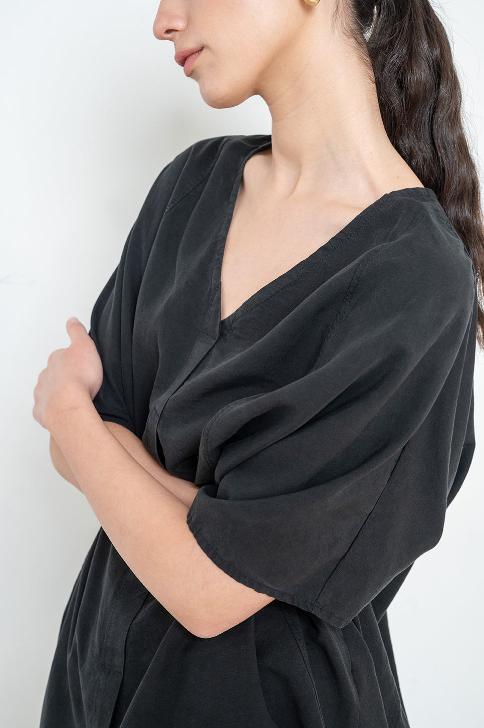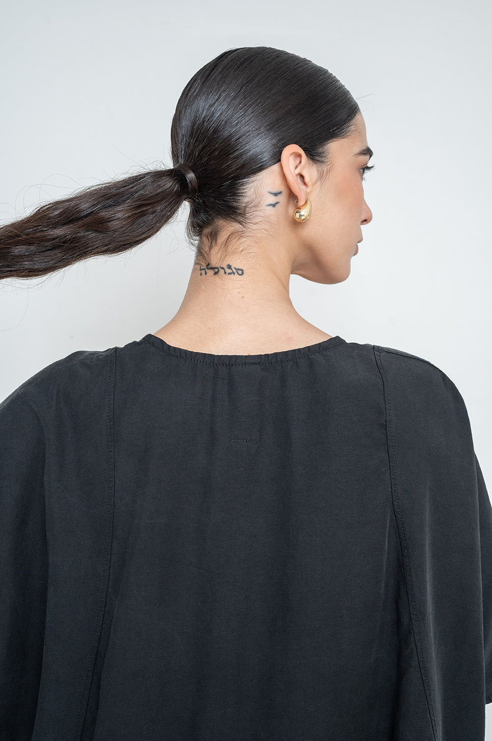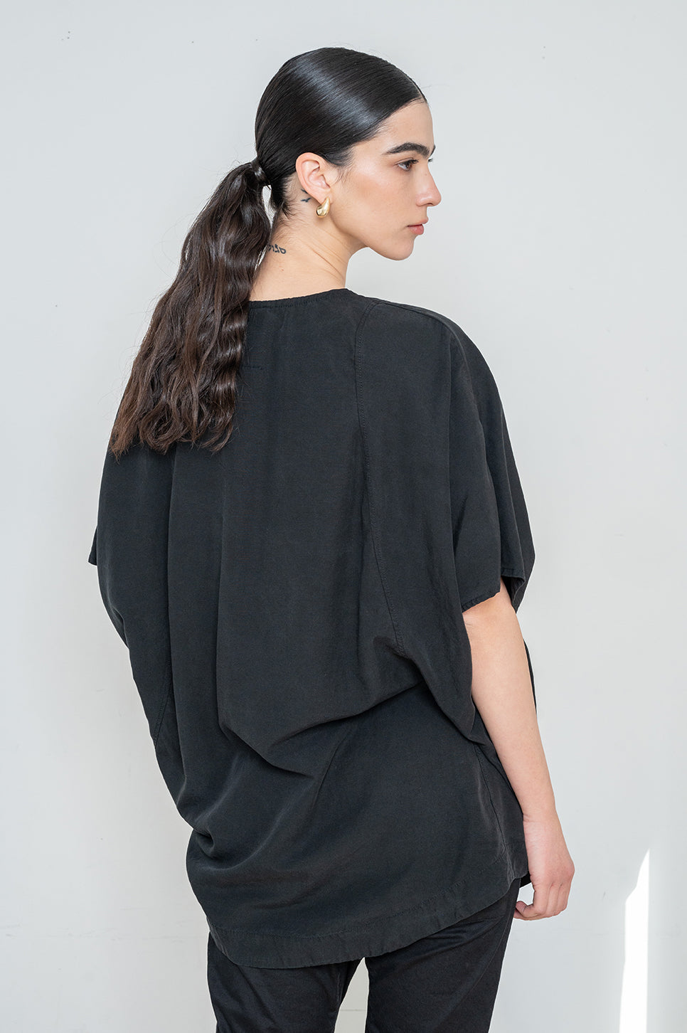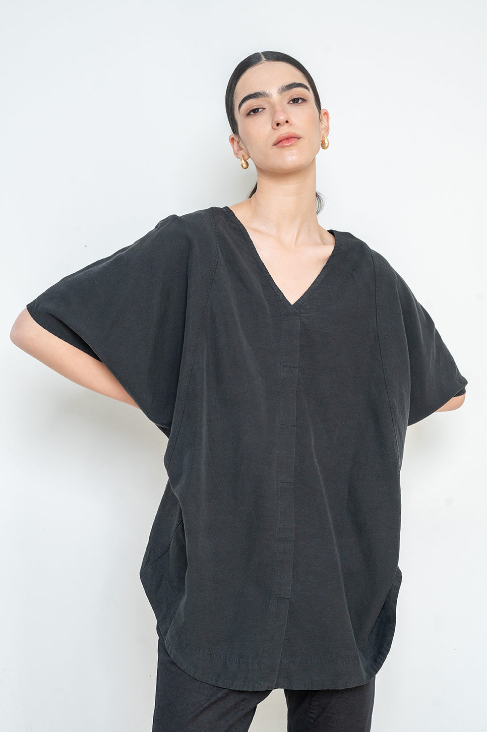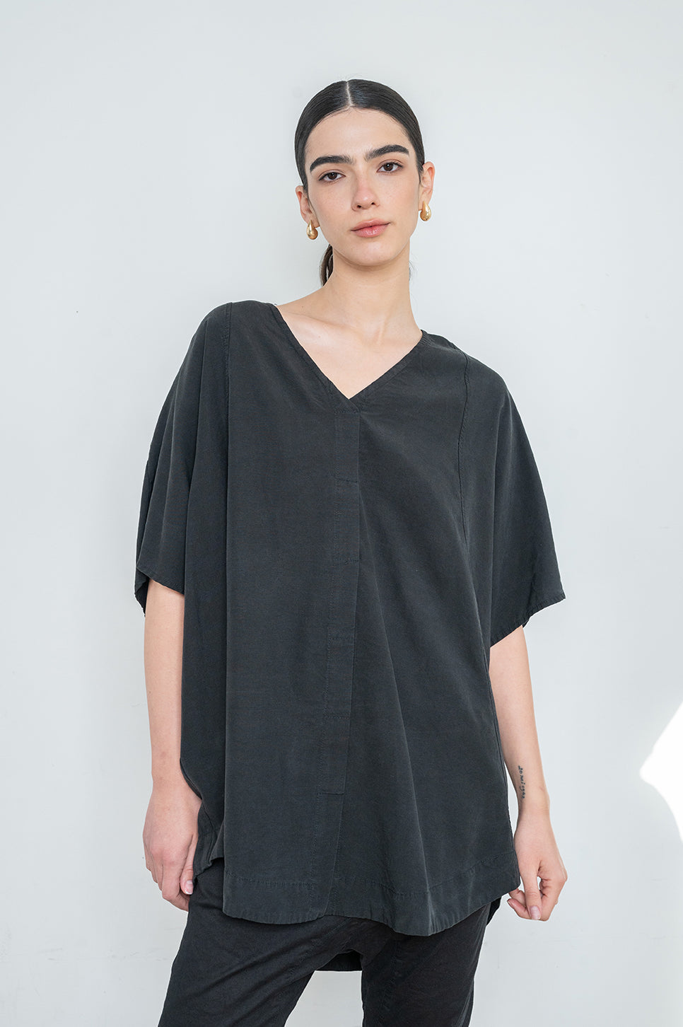 חולצת אוברסייז בגזרה ישרה מבד אריג רך - הכי נעים שיש! בעלת צווארון במפתח V,עם שרוולים רחבים עד המרפק ותפר בולט מלפנים.