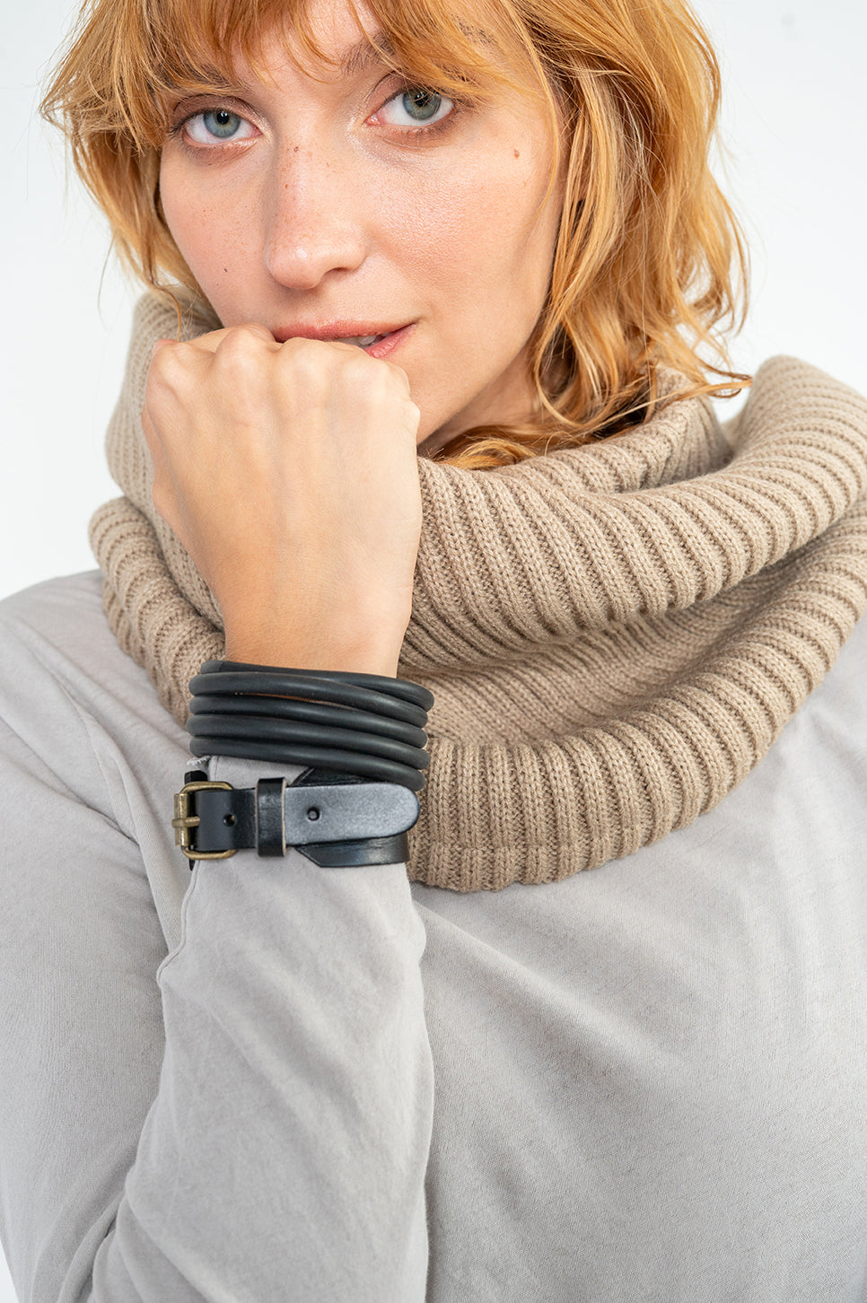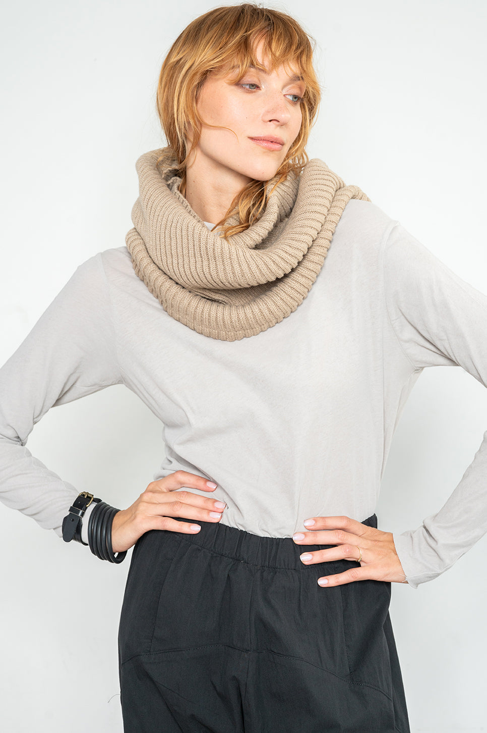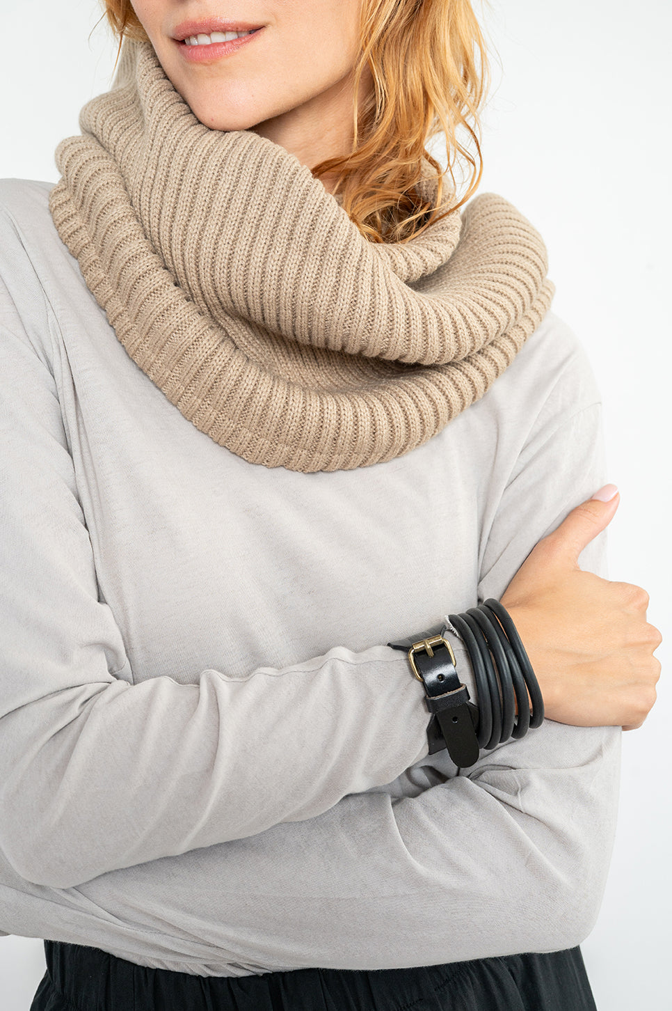 צעיף טיוב סגור עבה ומחמם, מבד סרוג רך וגמיש.