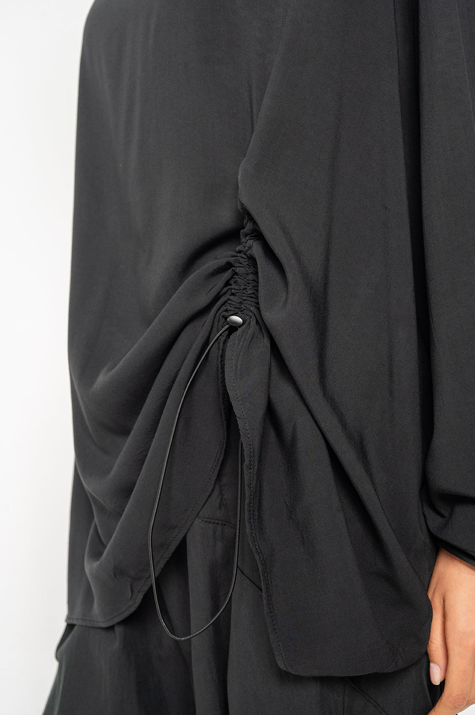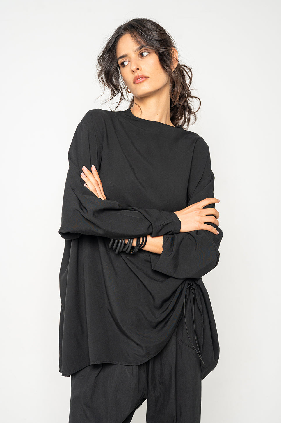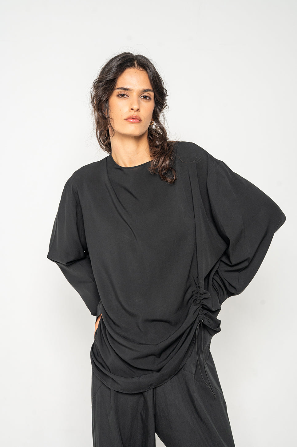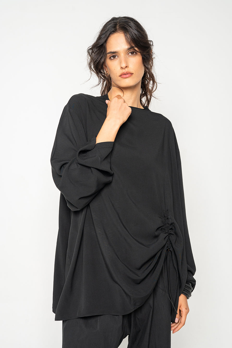 חולצת אוברסייז ארוכה מבד אריג דקיק ונשפך. חוט גומי עם סטופר מתכת מאפשרים כיווץ הבד בצד אחד למראה כפלים אסימטרי. בעלת צווארון סגור עם רוכסן נסתר בעורף.- אבישג: גובה 176 ס"מ | היקפים: חזה 76 ס"מ | מותן 62 ס"מ | אגן 86 ס"מ, לובשת מידה S/M.