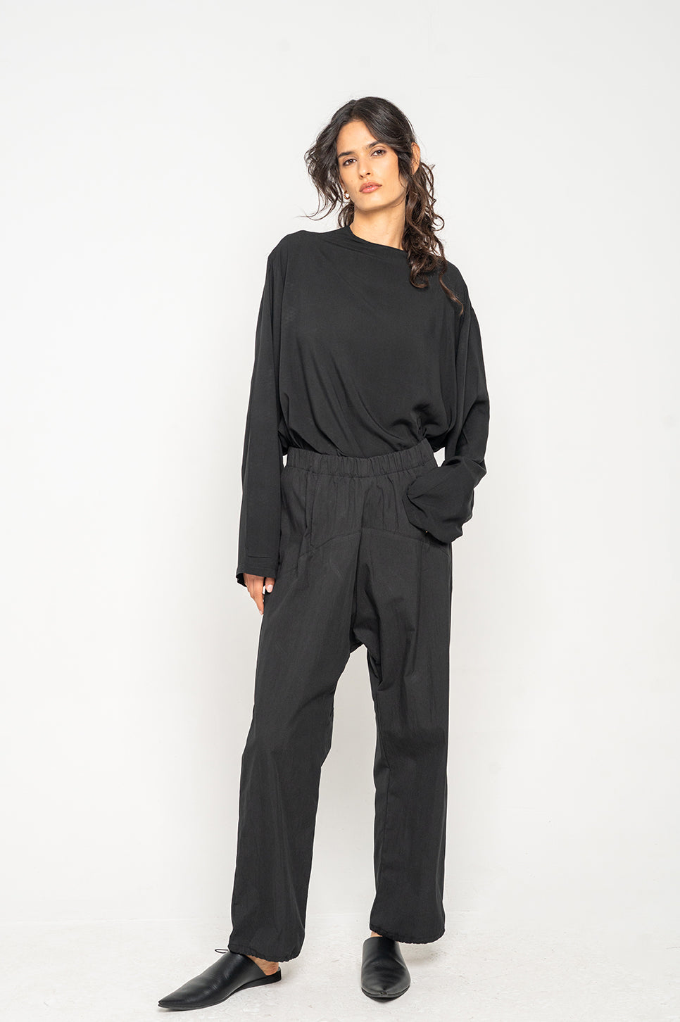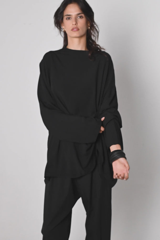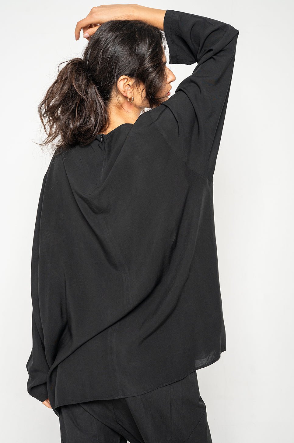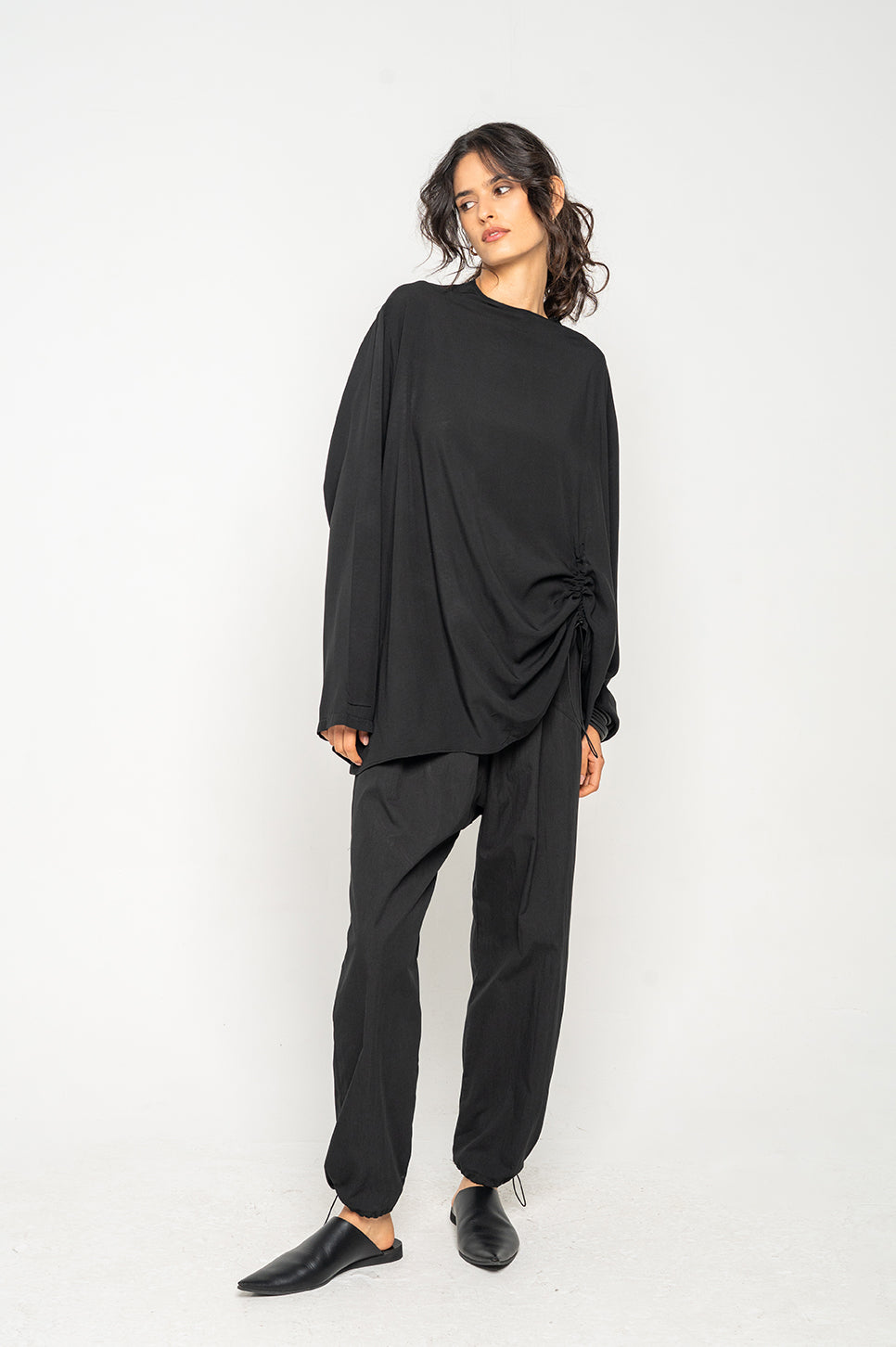 חולצת אוברסייז ארוכה מבד אריג דקיק ונשפך. חוט גומי עם סטופר מתכת מאפשרים כיווץ הבד בצד אחד למראה כפלים אסימטרי. בעלת צווארון סגור עם רוכסן נסתר בעורף.- אבישג: גובה 176 ס"מ | היקפים: חזה 76 ס"מ | מותן 62 ס"מ | אגן 86 ס"מ, לובשת מידה S/M.