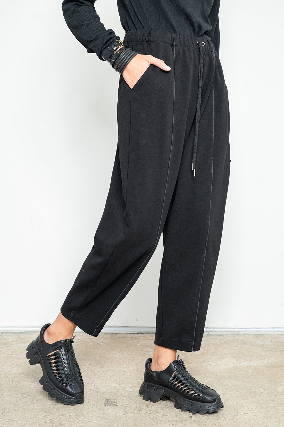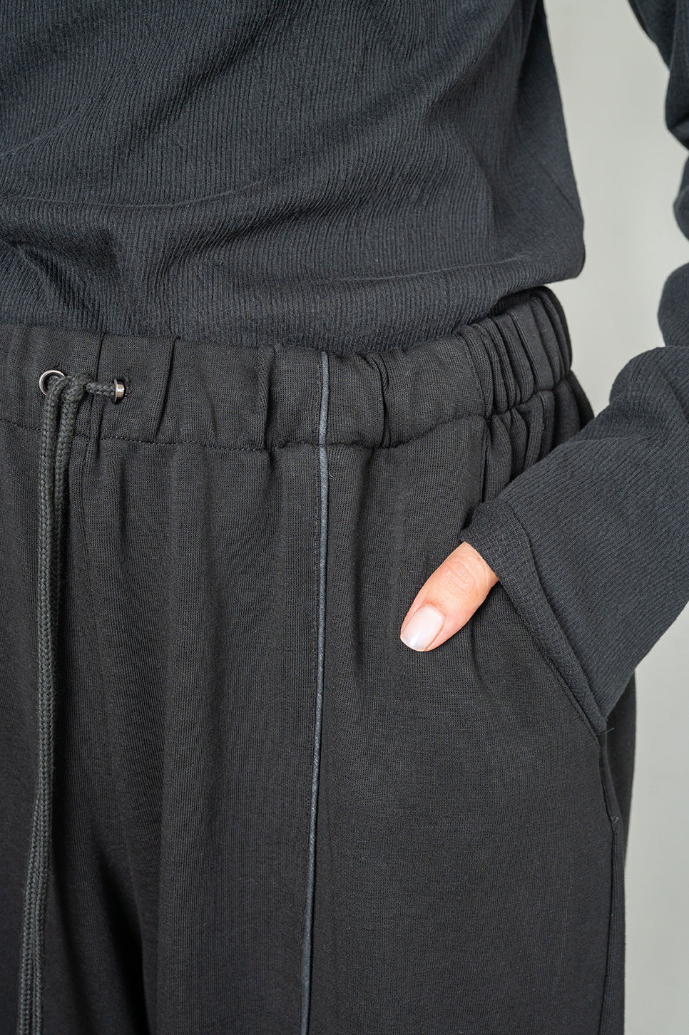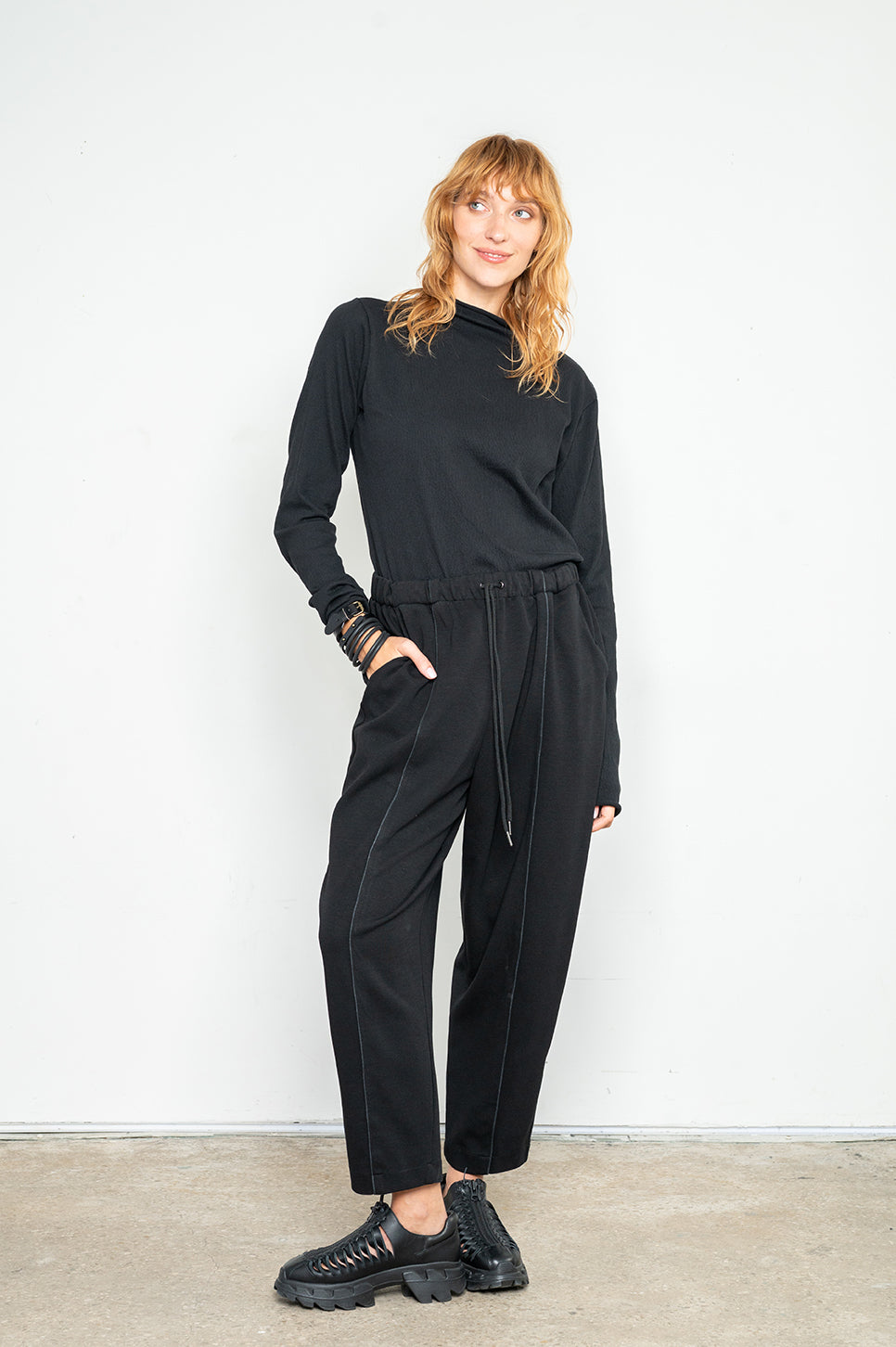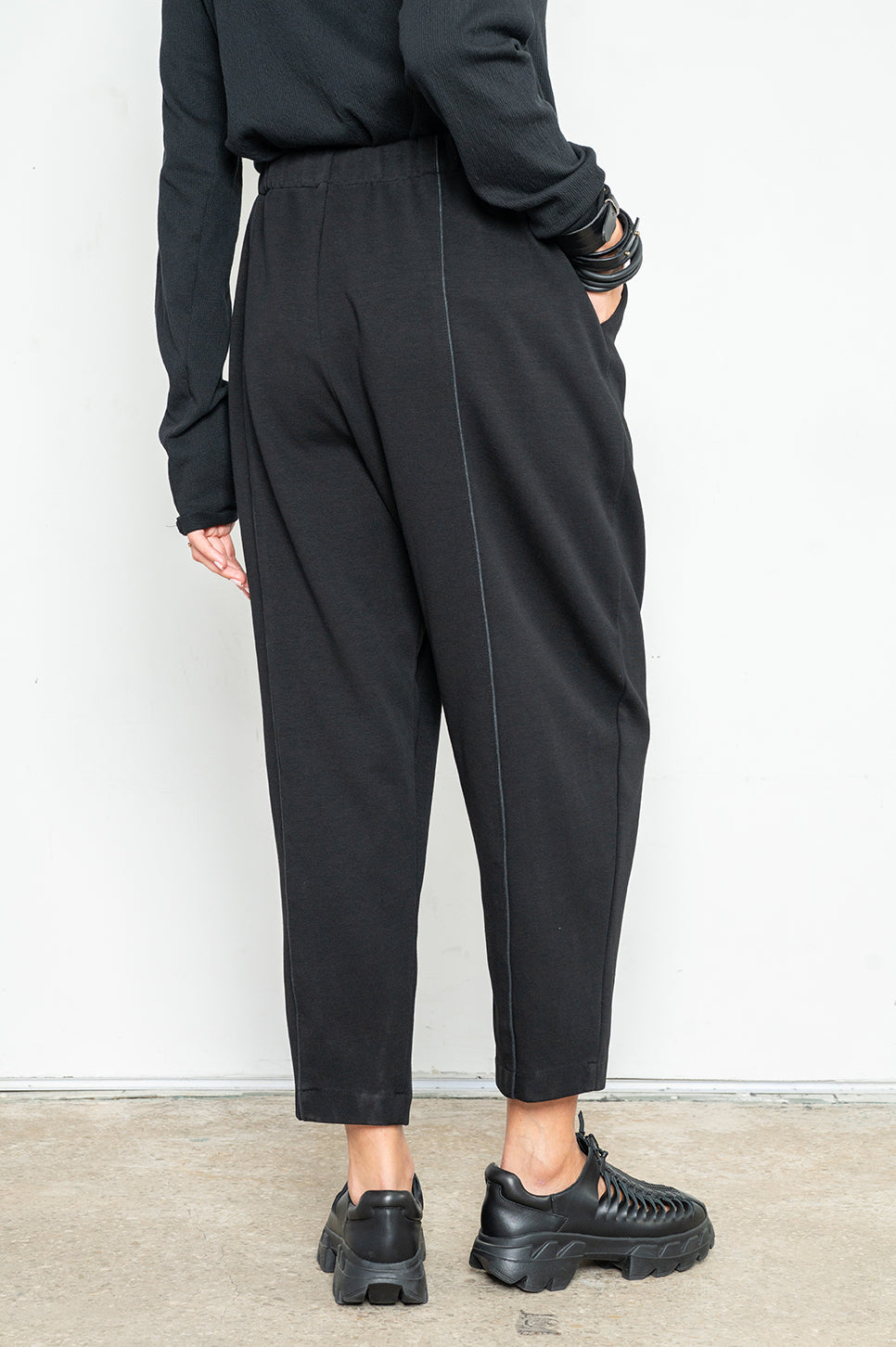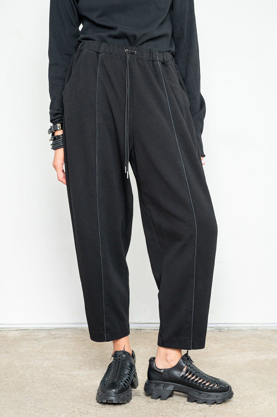 מכנסיי טרנינג בגזרת "בלון" - משוחררים באגן וברגליים ונאספים בקרסוליים. עם חגורת גומי, שרוך להידוק וקשירה ושני כיסי צד. תפר בולט עובר לאורך חזית וגב הרגל.- אנה: גובה 178 ס"מ. היקפים: חזה 88 ס"מ | מותן 70 ס"מ | אגן 88 ס"מ, לובשת מידה 2.