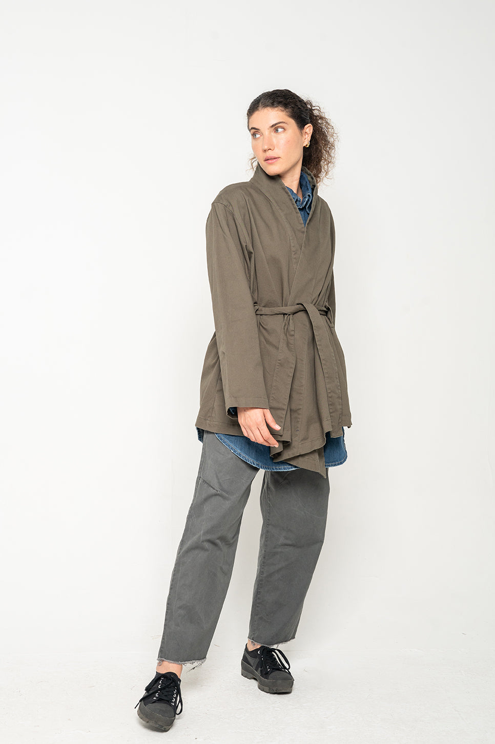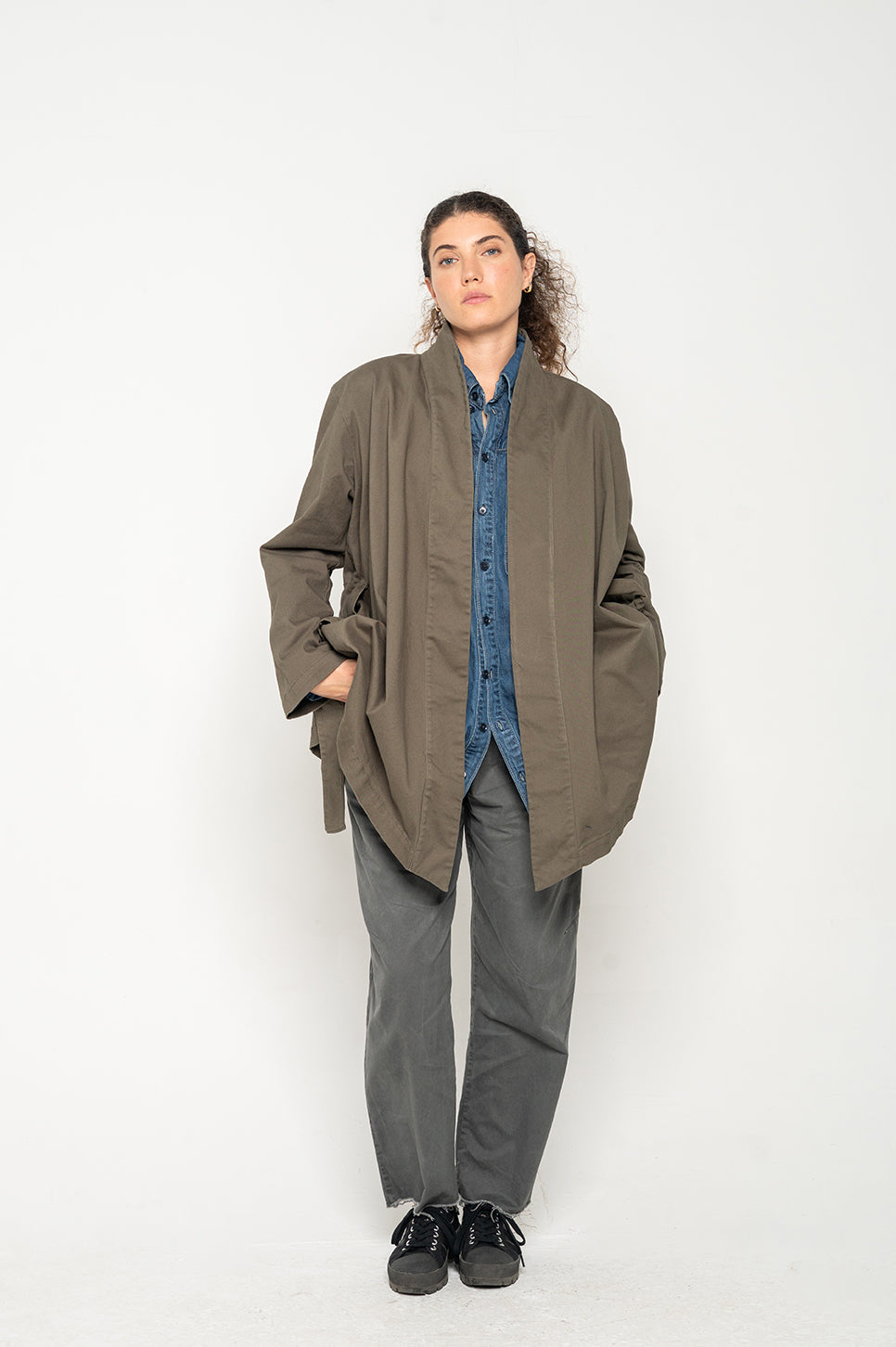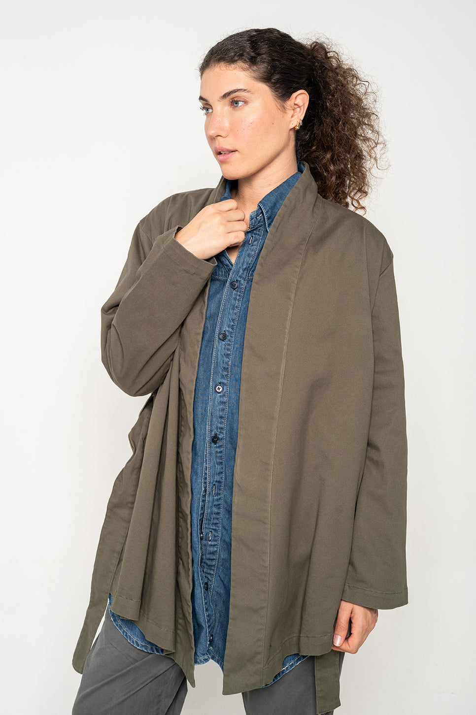 ג'קט פתוח בהשראת עליונית ג'ודו בגזרת מעטפת אוברסייז. עם שני כיסי צד וחגורת בד לקשירה.- אנה: גובה 178 ס"מ. היקפים: חזה 88 ס"מ | מותן 70 ס"מ | אגן 88 ס"מ, לובשת מידה S/M.