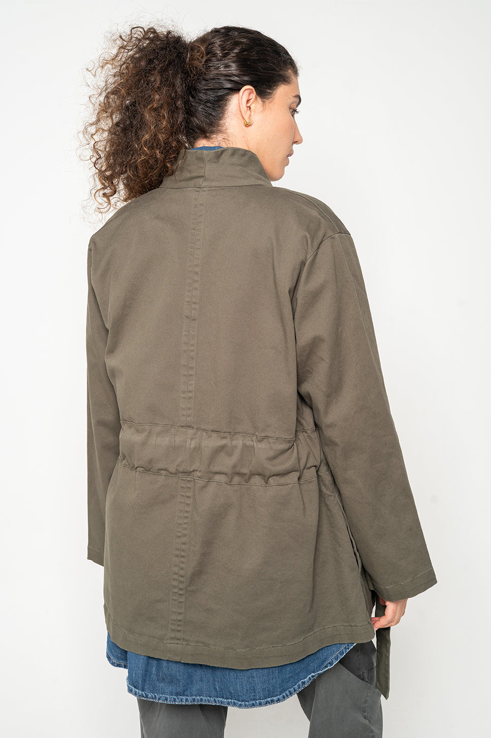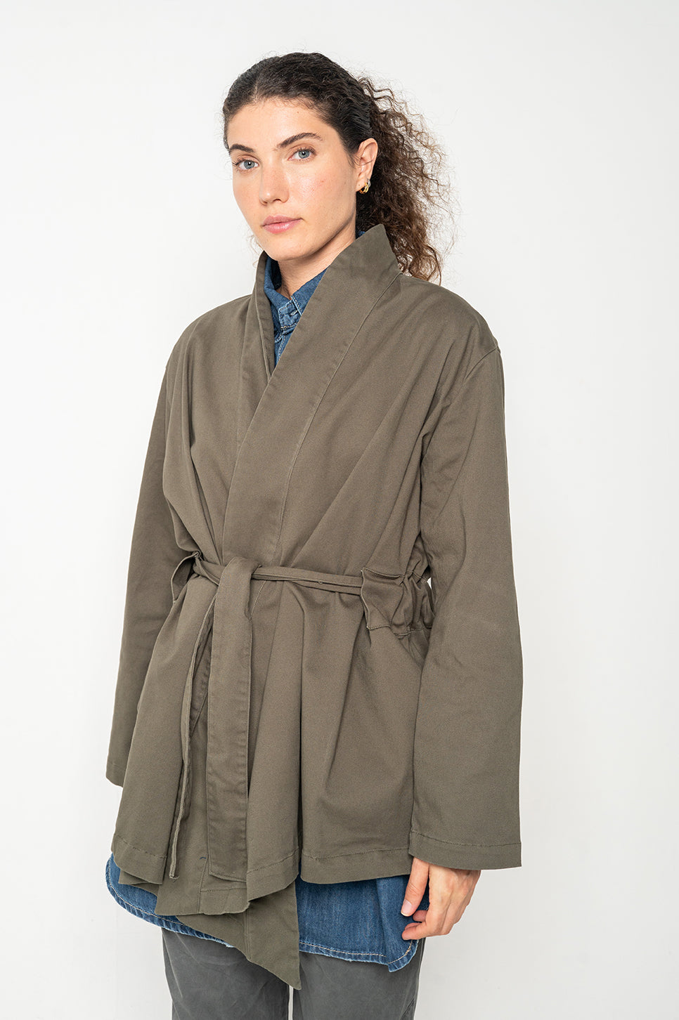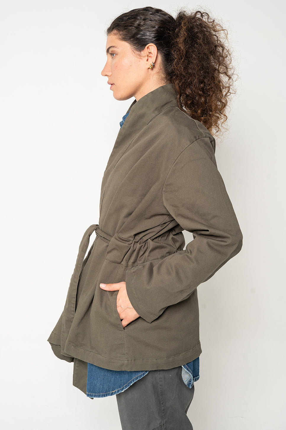 ג'קט פתוח בהשראת עליונית ג'ודו בגזרת מעטפת אוברסייז. עם שני כיסי צד וחגורת בד לקשירה.- אנה: גובה 178 ס"מ. היקפים: חזה 88 ס"מ | מותן 70 ס"מ | אגן 88 ס"מ, לובשת מידה S/M.