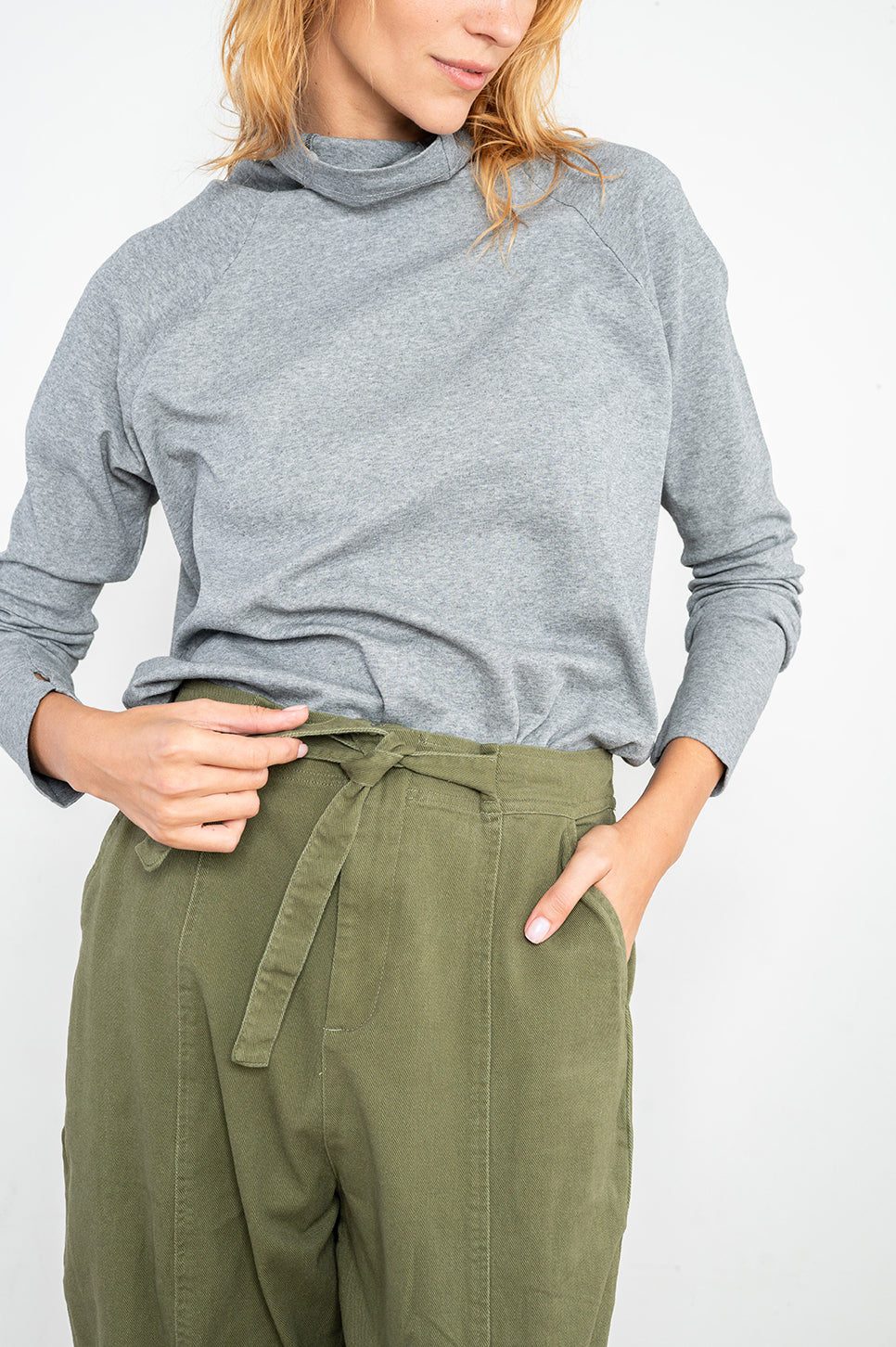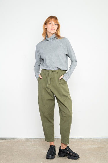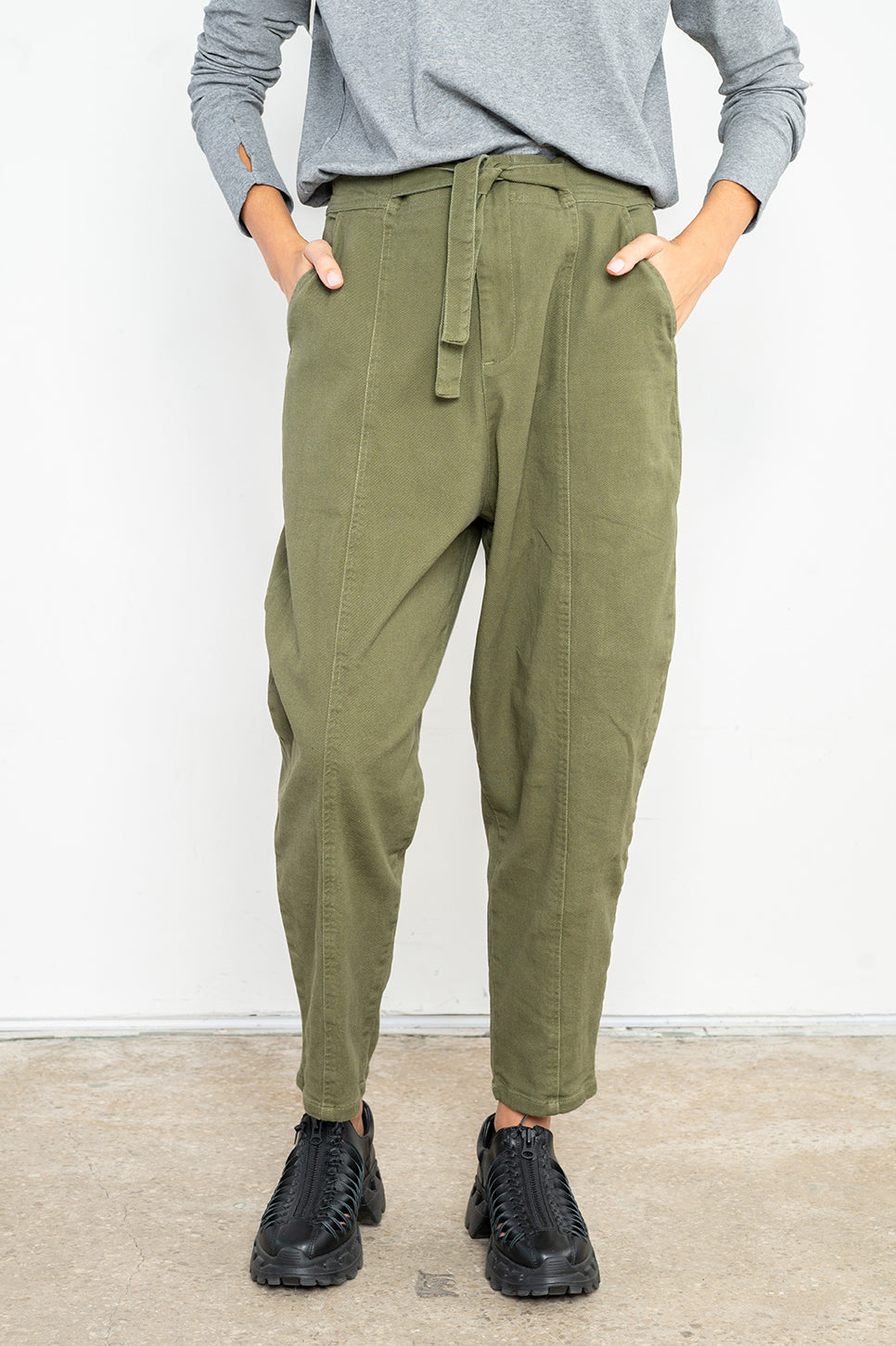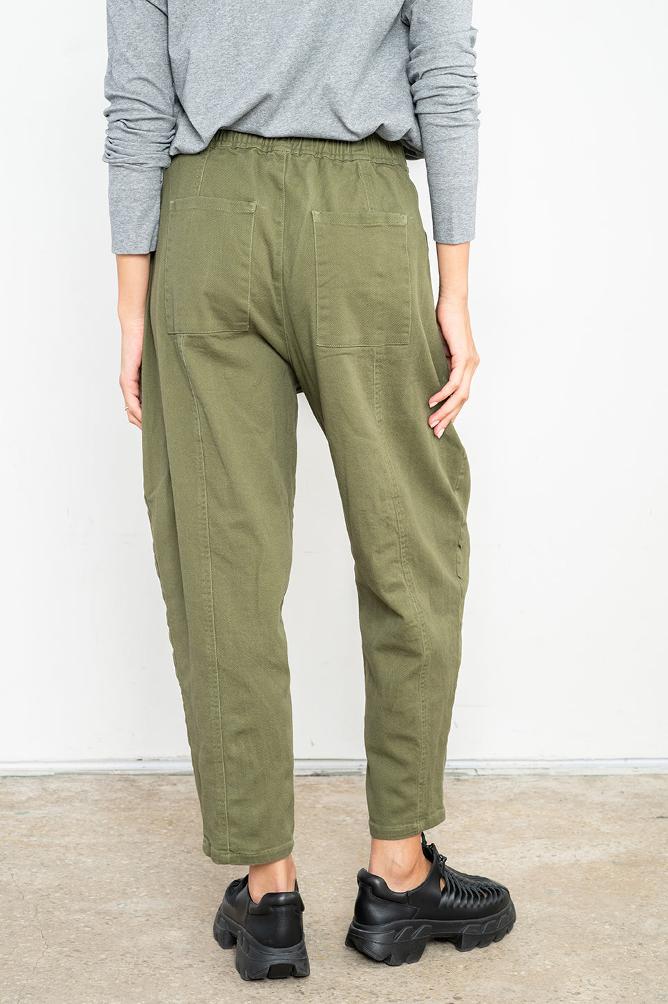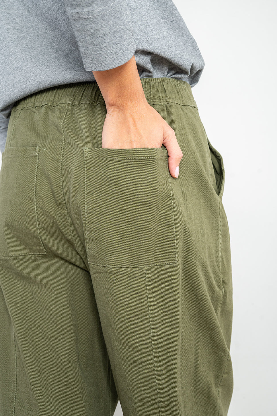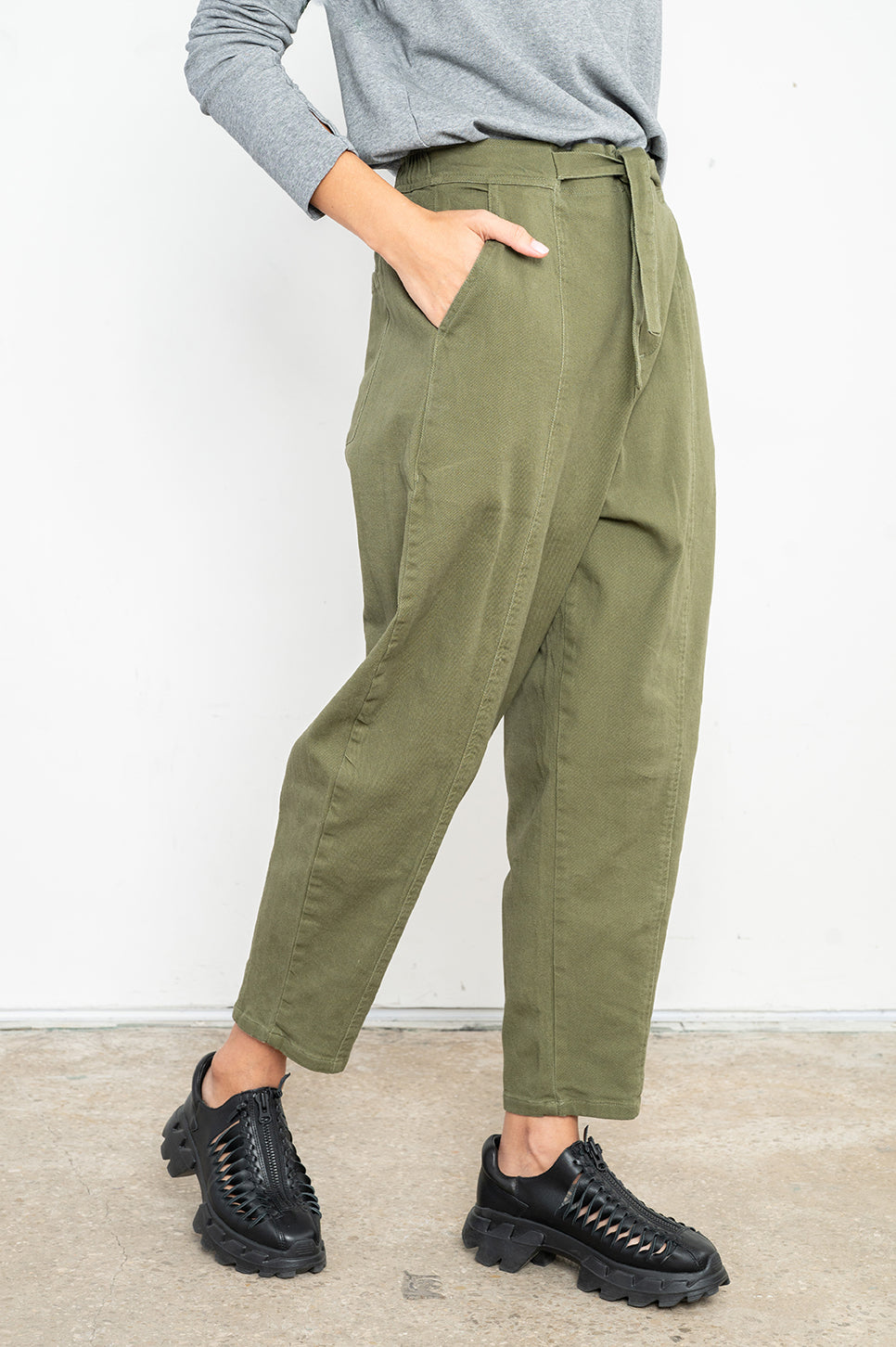 מכנסיים בגזרת "בלון" - משוחררים באגן וברגליים ונאספים בקרסוליים. עם גומי בחגורת הגב ושרוכים לקשירה והידוק מלפנים, שני כיסי צד ושני כיסים אחוריים. תפר בולט עובר לאורך חזית וגב הרגל. עשויים בד אריג כותנה עבה עם מעט לייקרה לנוחות מקסימלית. אנה: גובה 178 ס"מ. היקפים: חזה 88 ס"מ | מותן 70 ס"מ | אגן 88 ס"מ, לובשת מידה 2 (בשביל האורך).