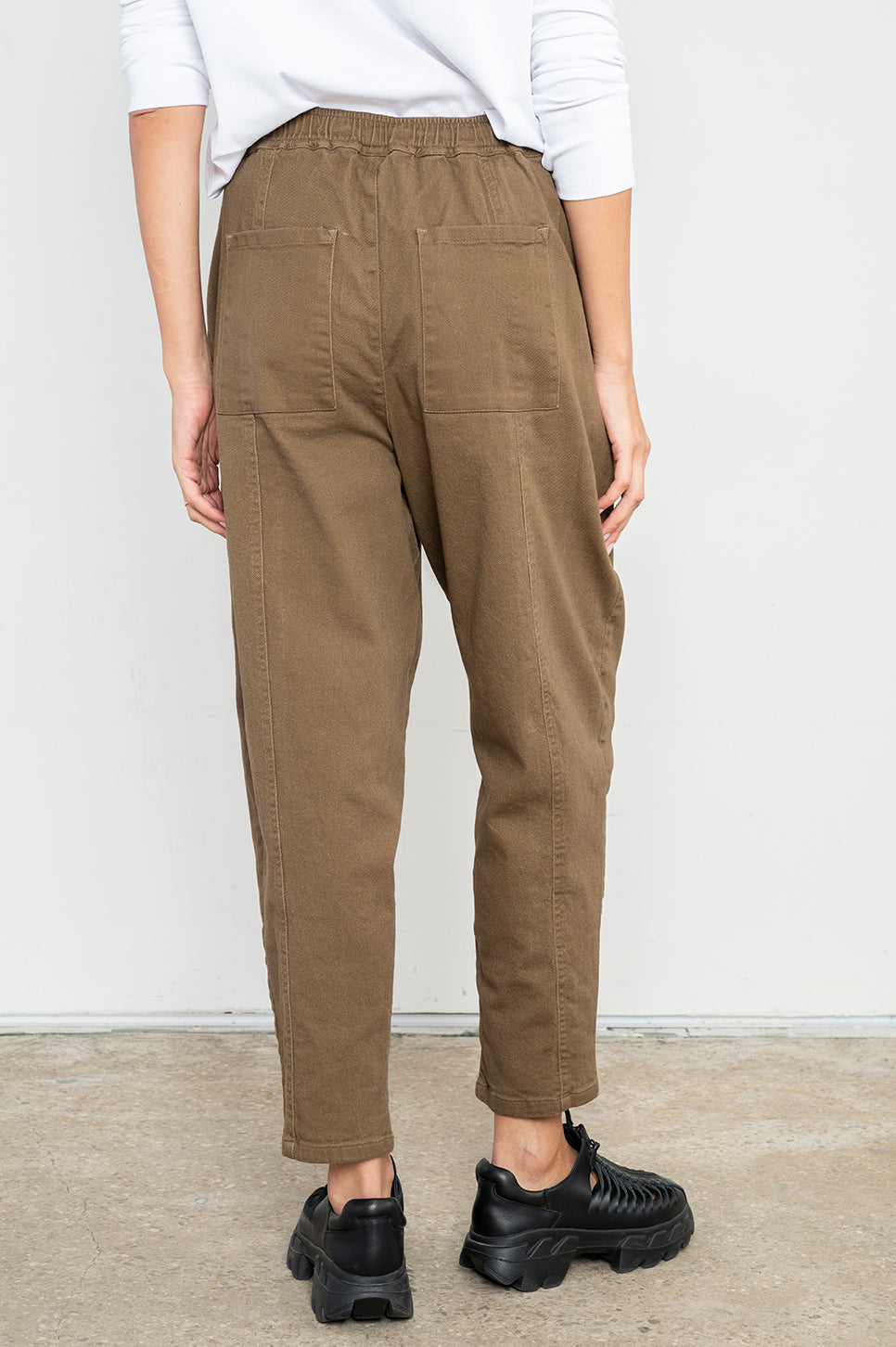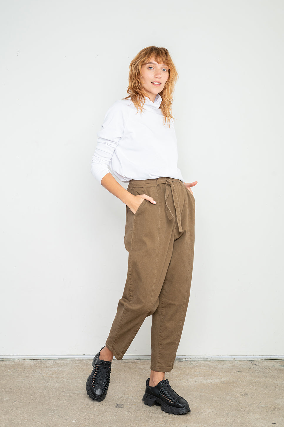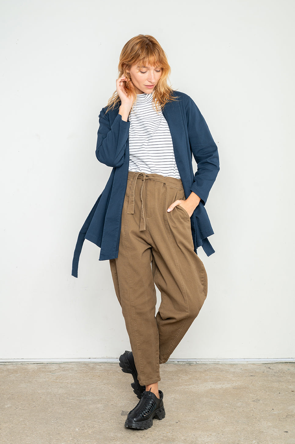 מכנסיים בגזרת "בלון" - משוחררים באגן וברגליים ונאספים בקרסוליים. עם גומי בחגורת הגב ושרוכים לקשירה והידוק מלפנים, שני כיסי צד ושני כיסים אחוריים. תפר בולט עובר לאורך חזית וגב הרגל. עשויים בד אריג כותנה עבה עם מעט לייקרה לנוחות מקסימלית. אנה: גובה 178 ס"מ. היקפים: חזה 88 ס"מ | מותן 70 ס"מ | אגן 88 ס"מ, לובשת מידה 2 (בשביל האורך).הרכב בד