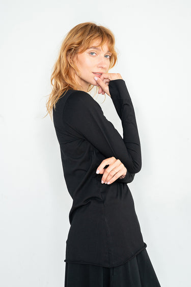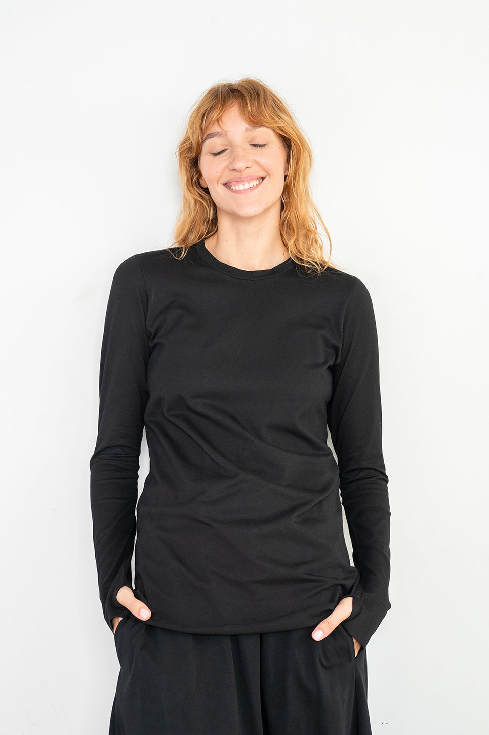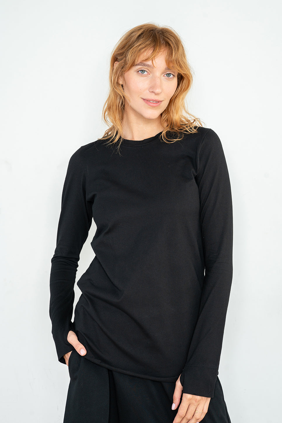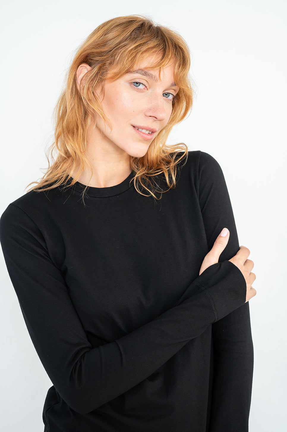 חולצת טריקו בגזרה ישרה וקרובה לגוף עם פתח לאגודל בקצה השרוול. מצויינת גם כשכבה תחתונה בימים קרים במיוחד.- אנה: גובה 178 ס"מ. היקפים: חזה 88 ס"מ | מותן 70 ס"מ | אגן 90 ס"מ, לובשת מידה 2.