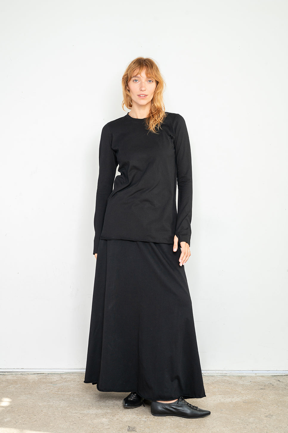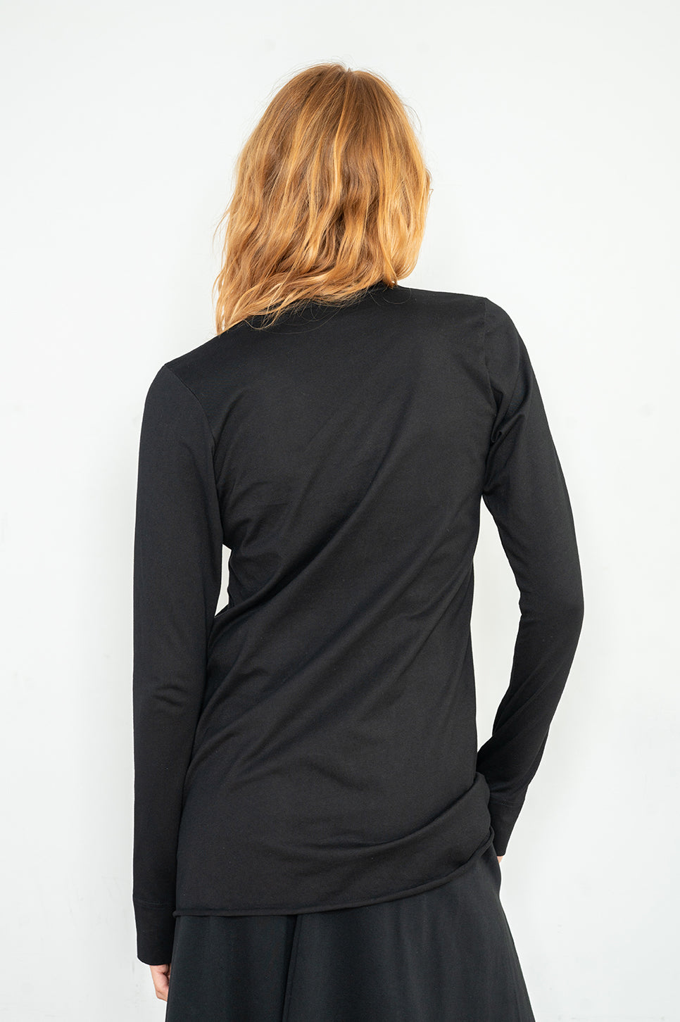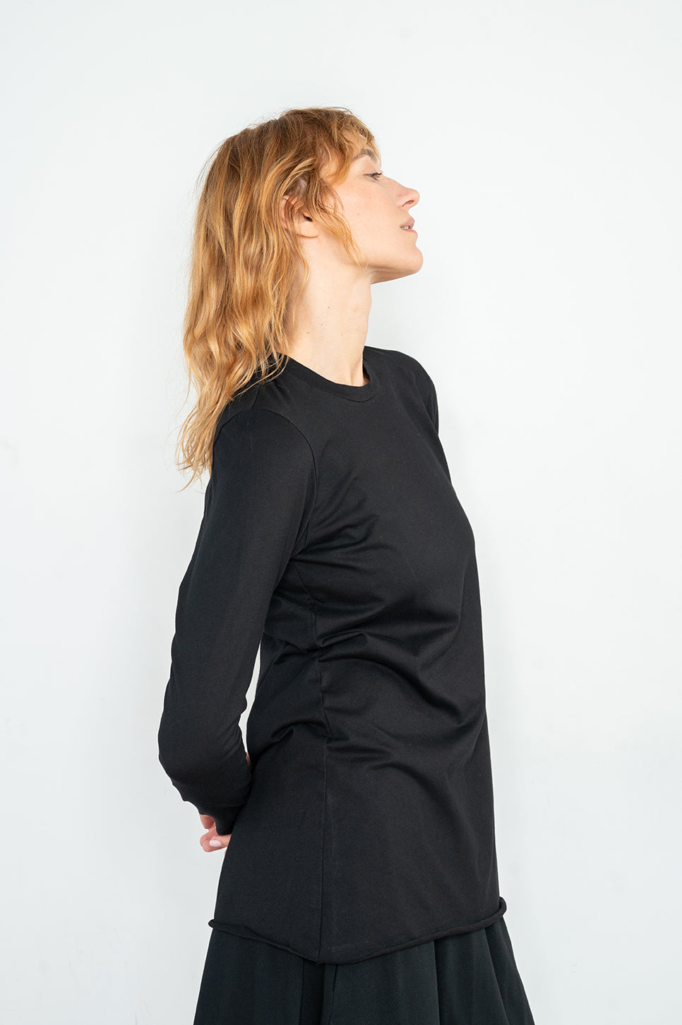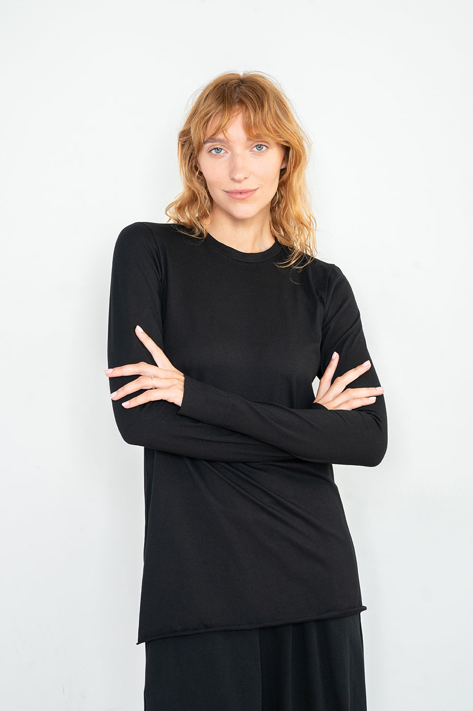 חולצת טריקו בגזרה ישרה וקרובה לגוף עם פתח לאגודל בקצה השרוול. מצויינת גם כשכבה תחתונה בימים קרים במיוחד.- אנה: גובה 178 ס"מ. היקפים: חזה 88 ס"מ | מותן 70 ס"מ | אגן 90 ס"מ, לובשת מידה 2.