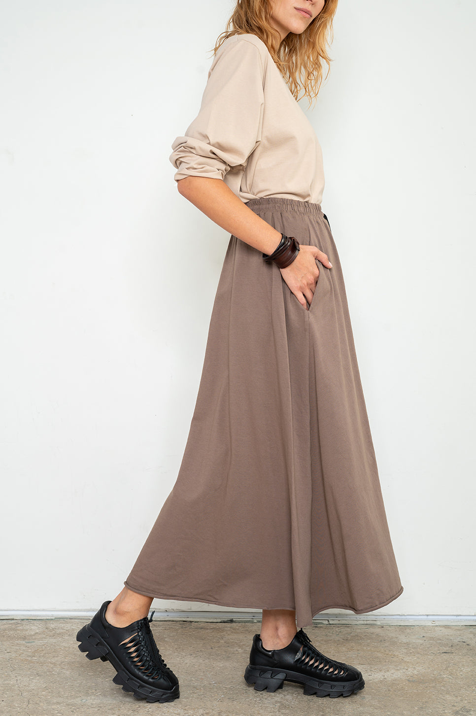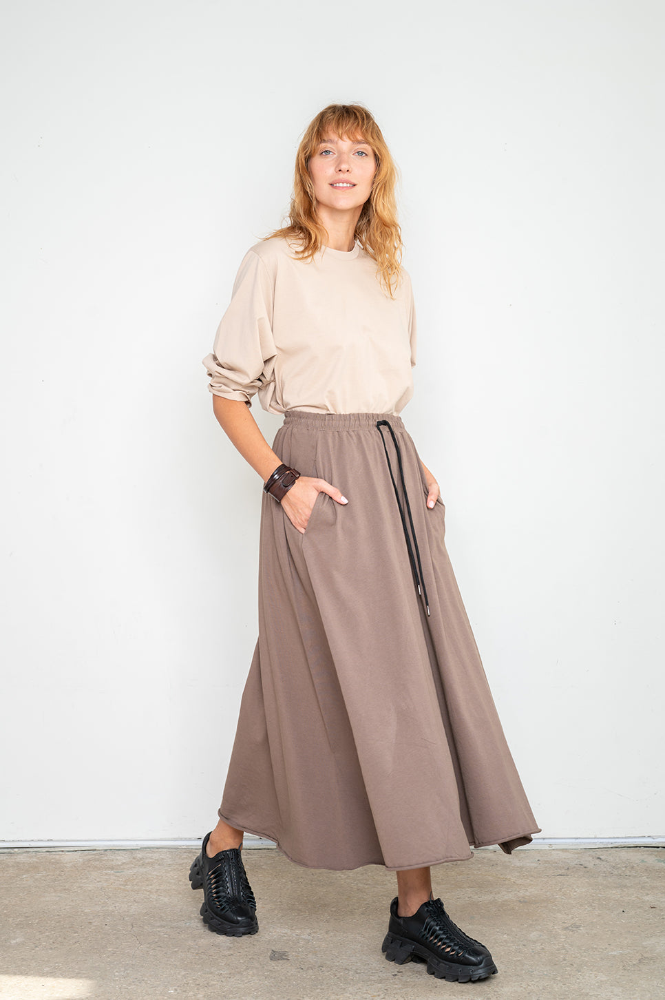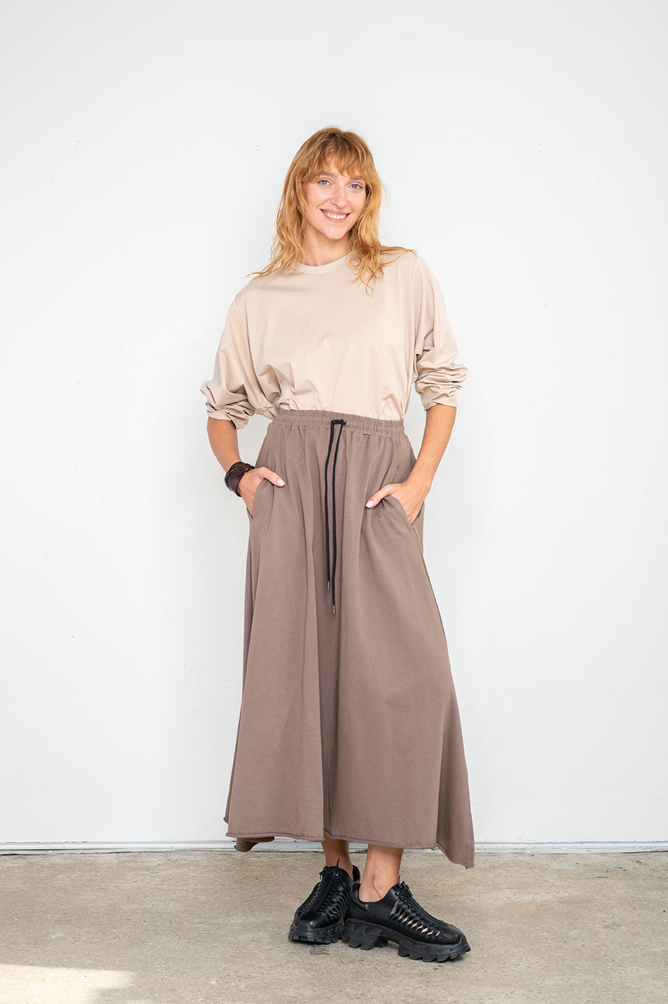חצאית מקסי בגזרת A מתרחבת. עם גומי במותניים, שרוך להידוק ושני כיסי צד. עשויה בד סריג דק אך מחמם עם סיומת גוף גזורה ומתגלגלת. אנה: גובה 178 ס"מ. היקפים: חזה 88 ס"מ | מותן 70 ס"מ | אגן 88 ס"מ, לובשת מידה 2 (בשביל האורך).
