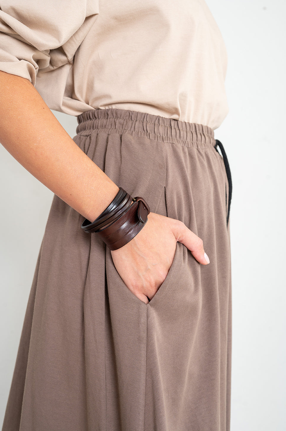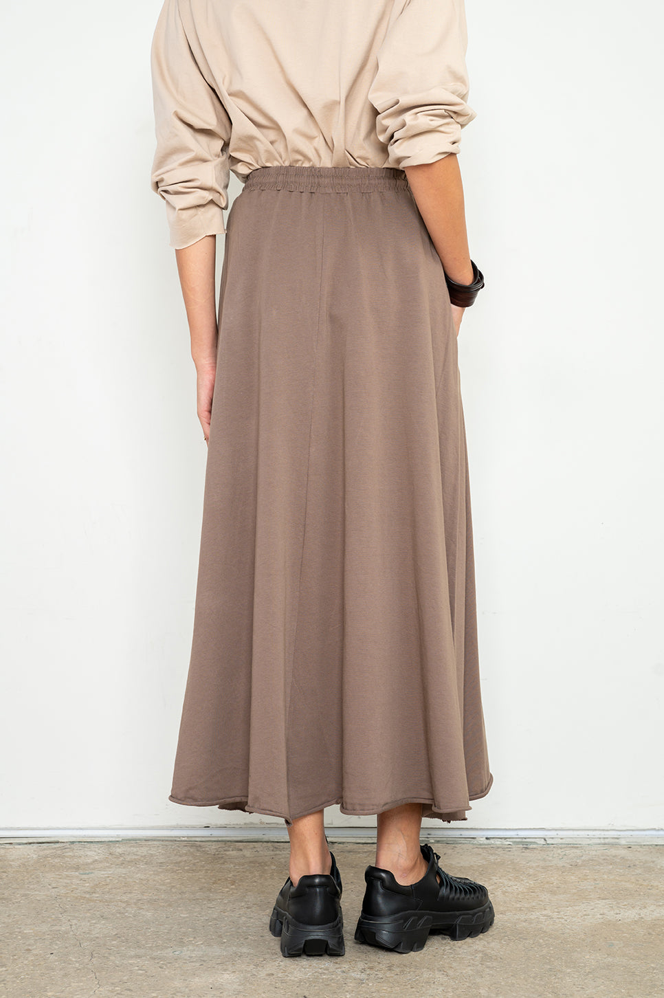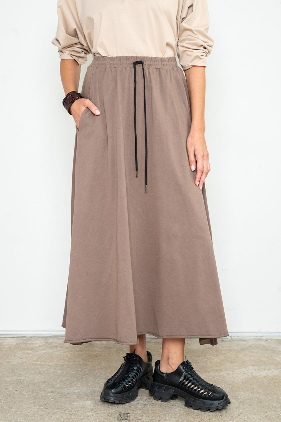 חצאית מקסי בגזרת A מתרחבת. עם גומי במותניים, שרוך להידוק ושני כיסי צד. עשויה בד סריג דק אך מחמם עם סיומת גוף גזורה ומתגלגלת. אנה: גובה 178 ס"מ. היקפים: חזה 88 ס"מ | מותן 70 ס"מ | אגן 88 ס"מ, לובשת מידה 2 (בשביל האורך).