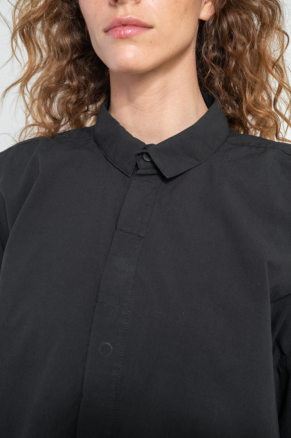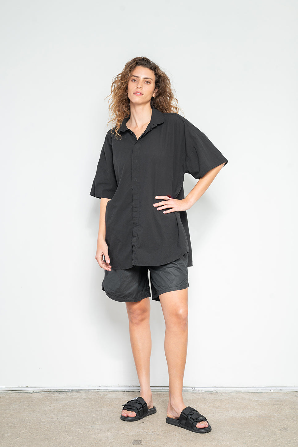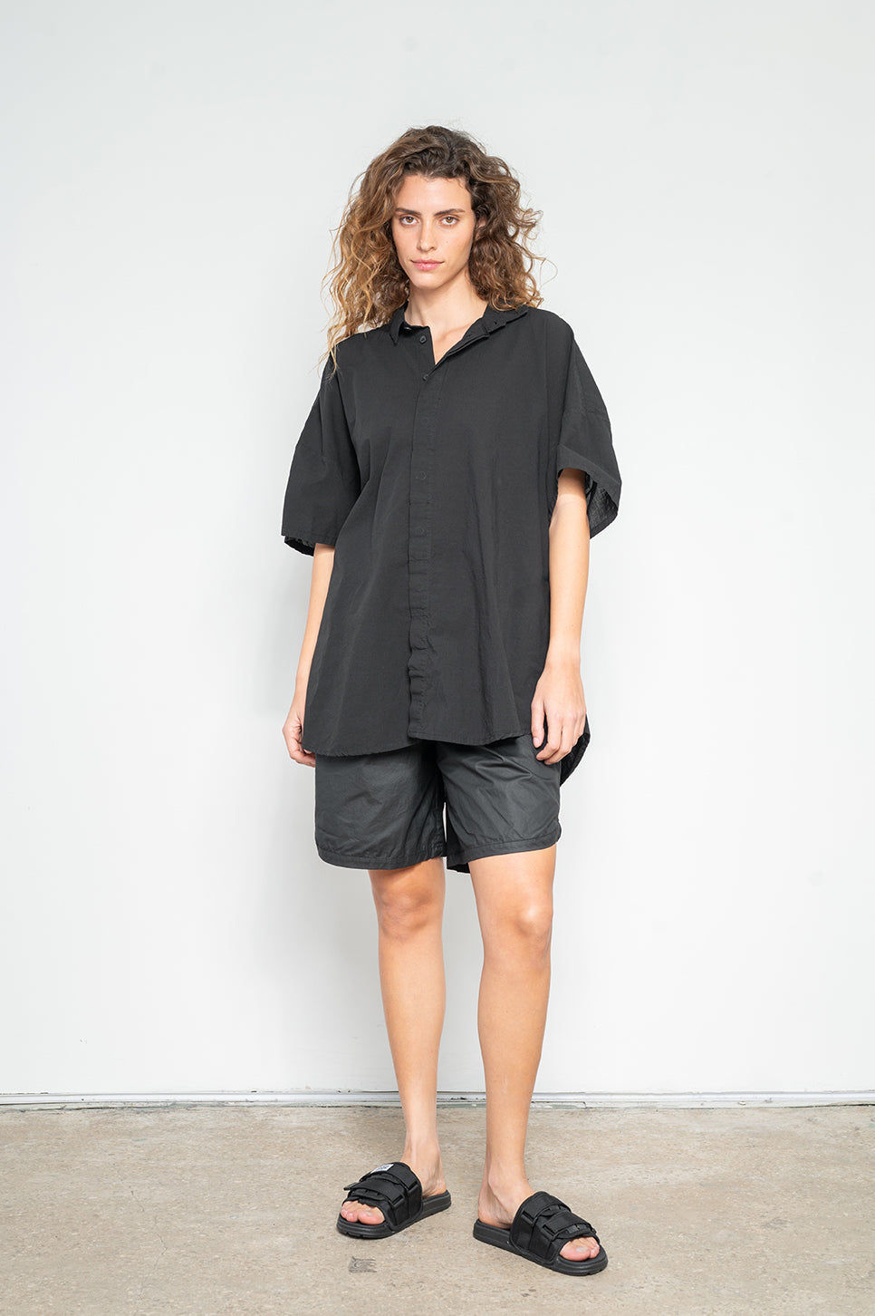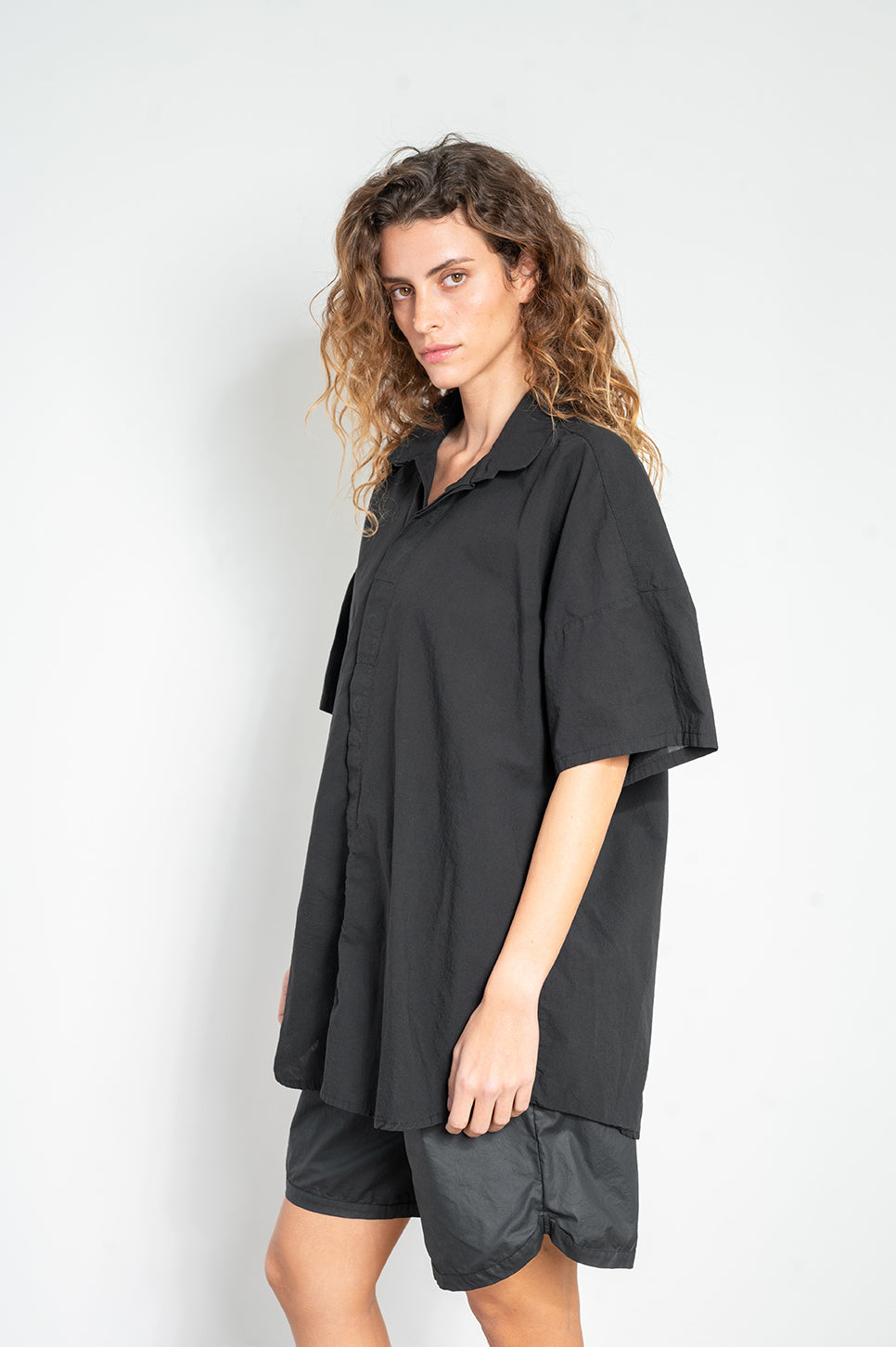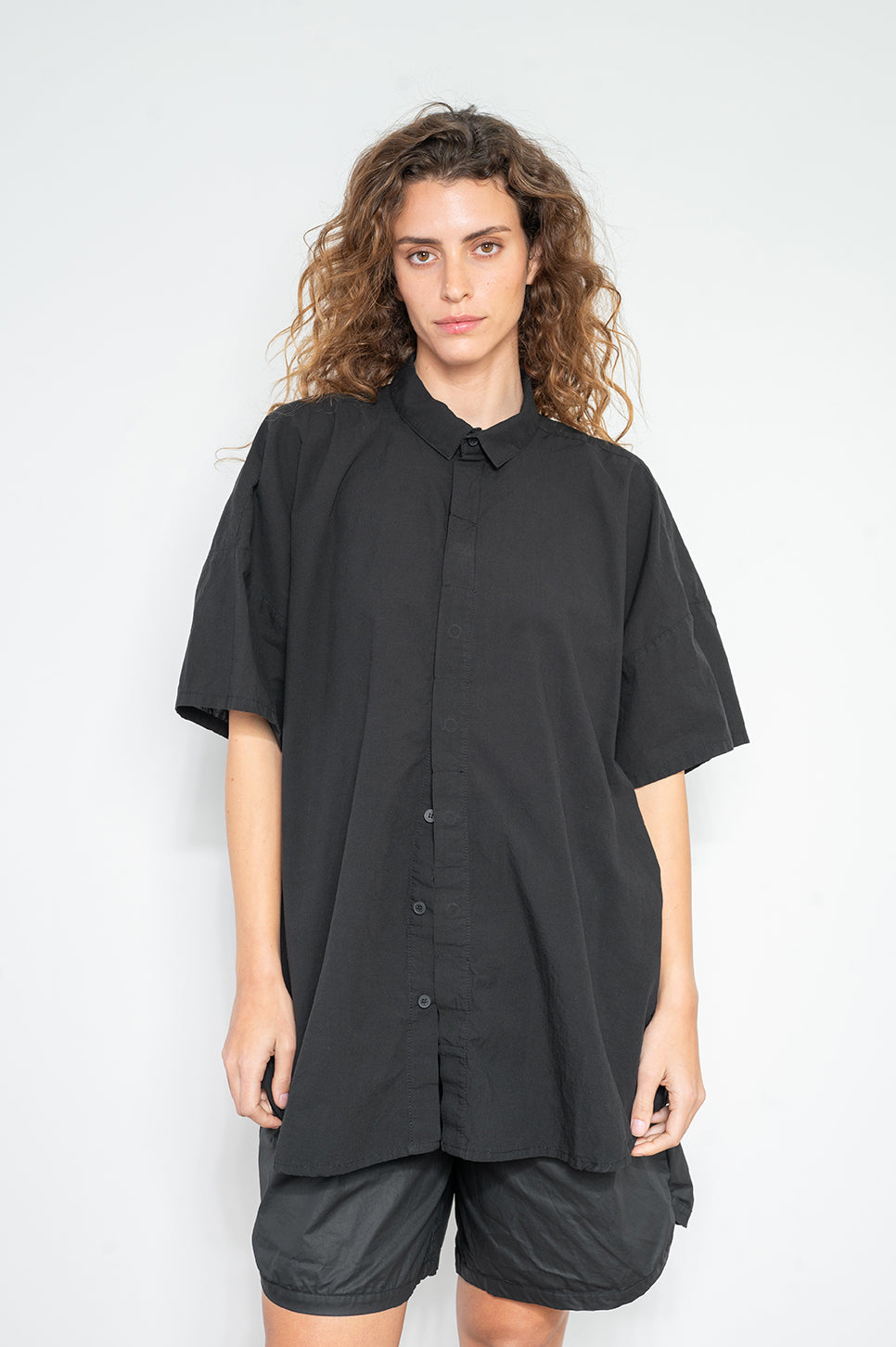 חולצה מכופתרת עם שרוולים קצרים בגזרת אוברסייז ארוכה ומשוחררת. בעלת כפתרה נסתרת. עשויה מבד אריג כותנה דקיק ואוורירי.