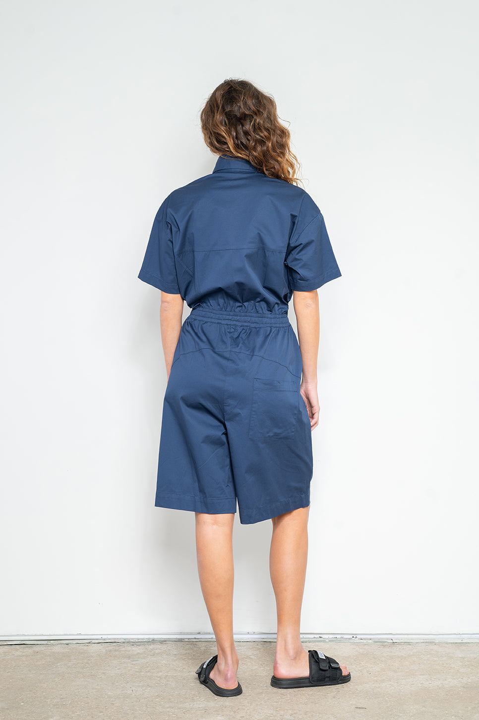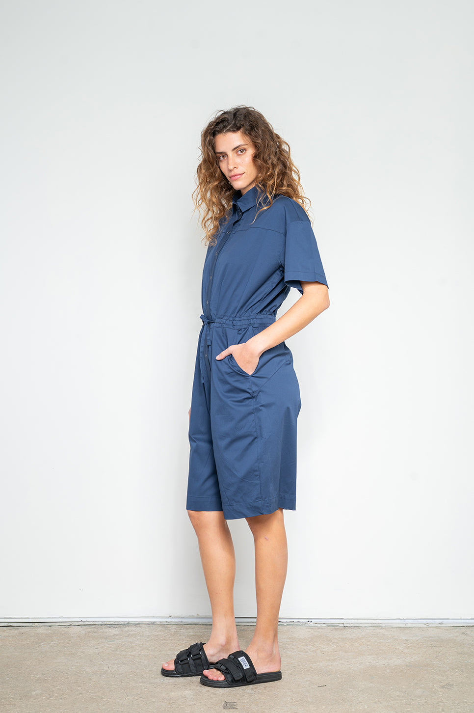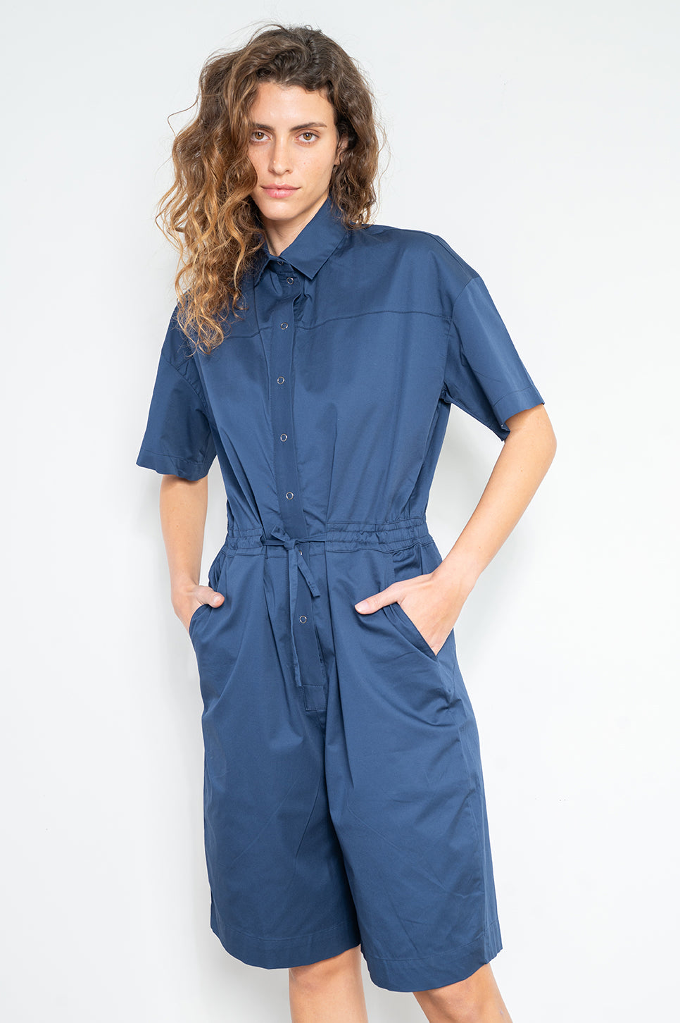 אוברול קצר עם צווארון מכופתר וסגירת טיקטקים לאורך חלקו הקדמי, לפתיחה קלה ונוחה. גומי במותן אחורי, שרוך קשירה להידוק מלפנים ושני כיסים בצדדים. עשוי אריג כותנה דק עם מעט לייקרה לנוחות מירבית.- מאיה: גובה 178 ס"מ. היקפים: חזה 80 ס"מ | מותן 60 ס"מ | אגן 92 ס"מ, לובשת מידה 1.