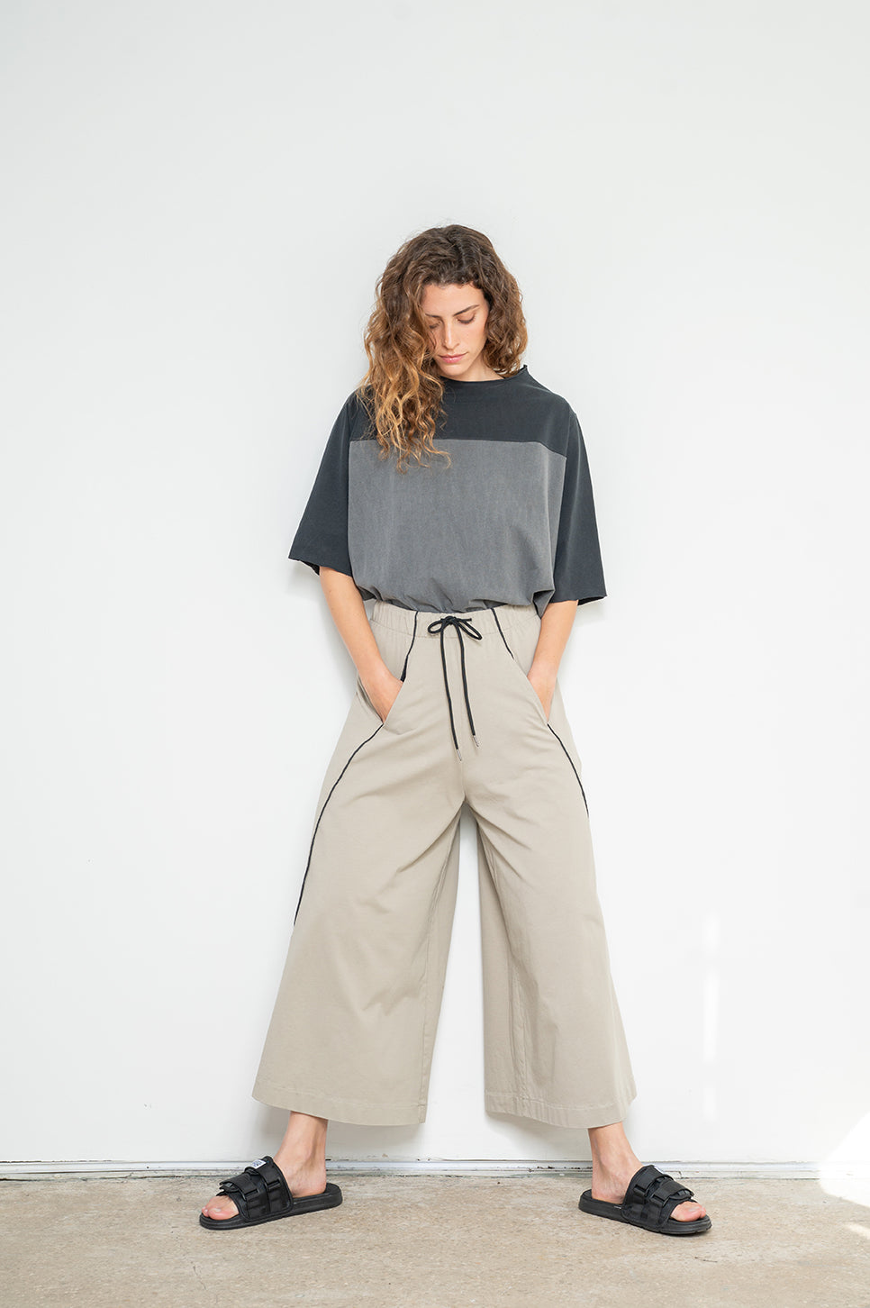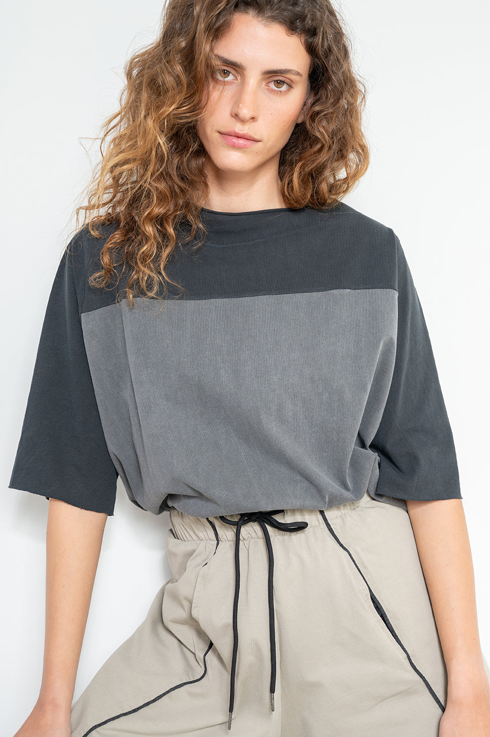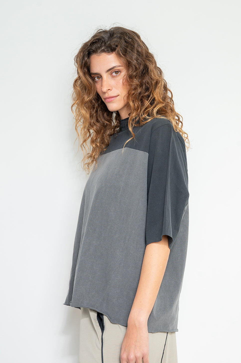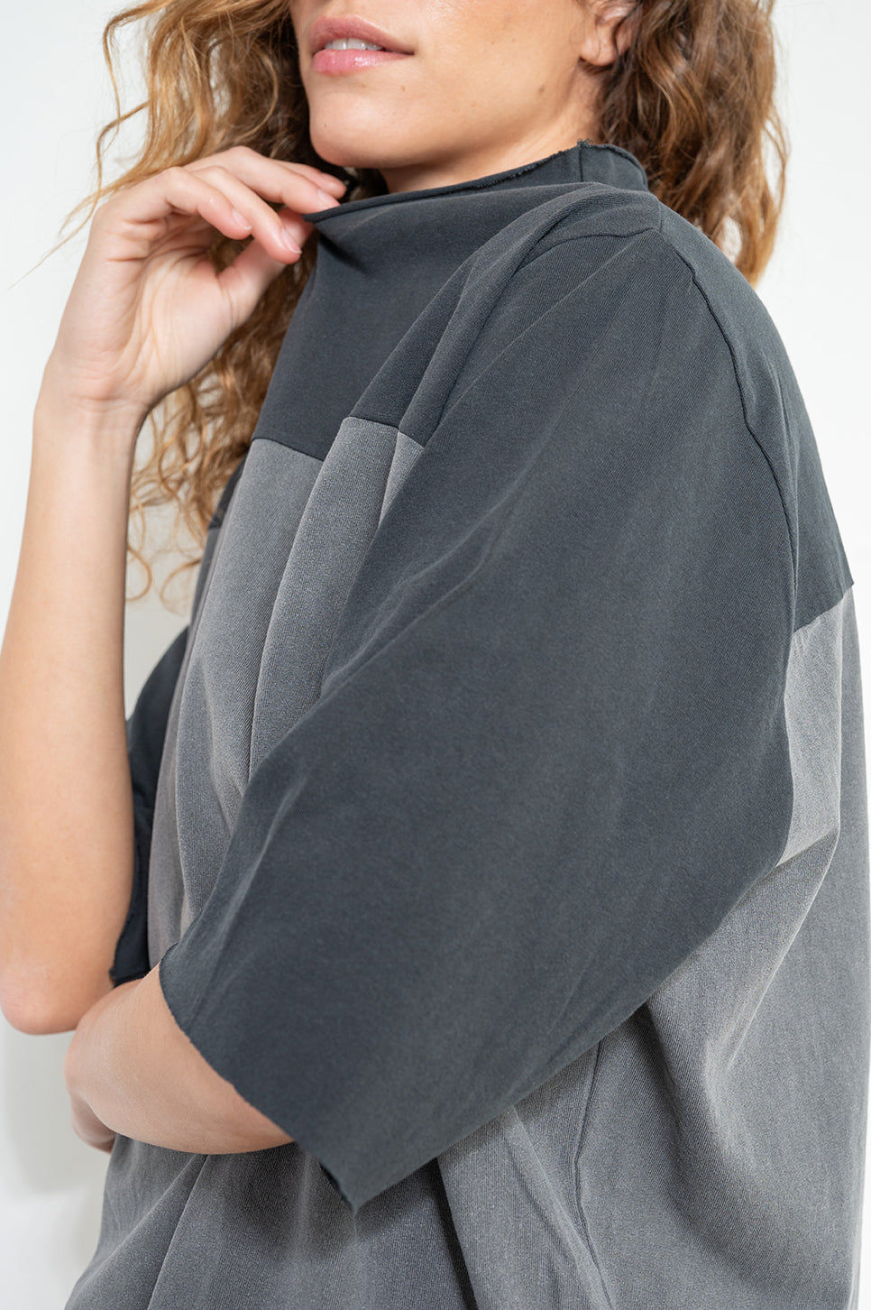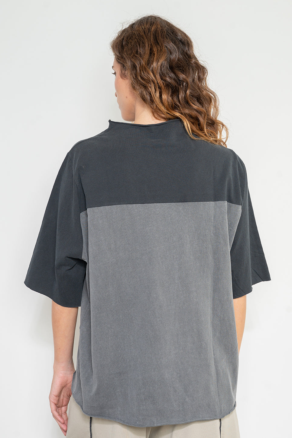 חולצת טישירט אוברסייז בגזרה ישרה עם צווארון גבוה ומתגלגל. בעלת סיומות גוף, ידיים וצוואר גזורות.