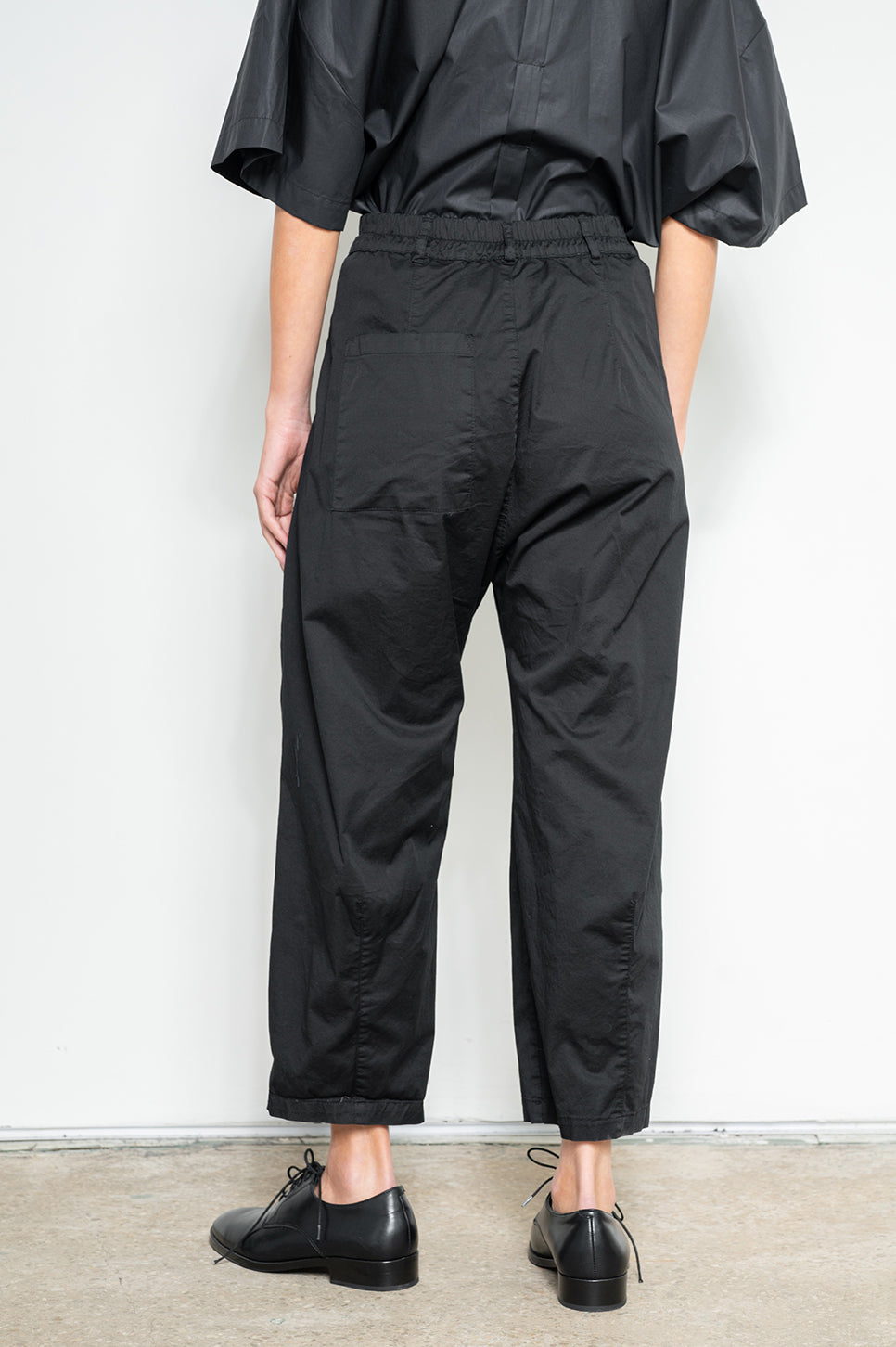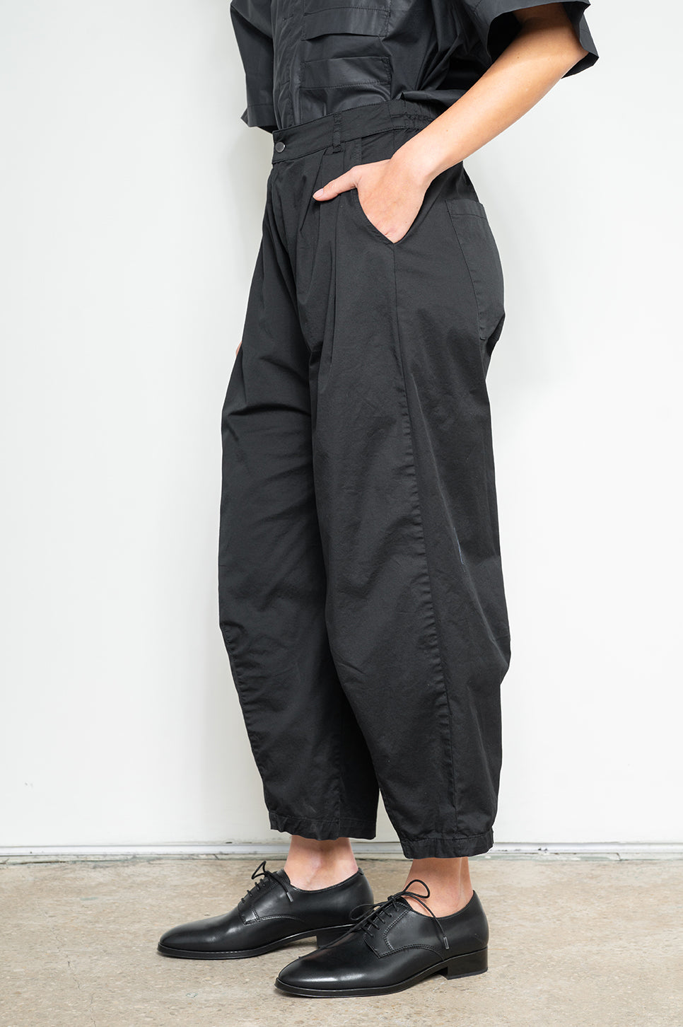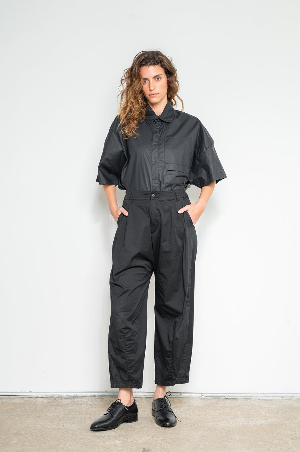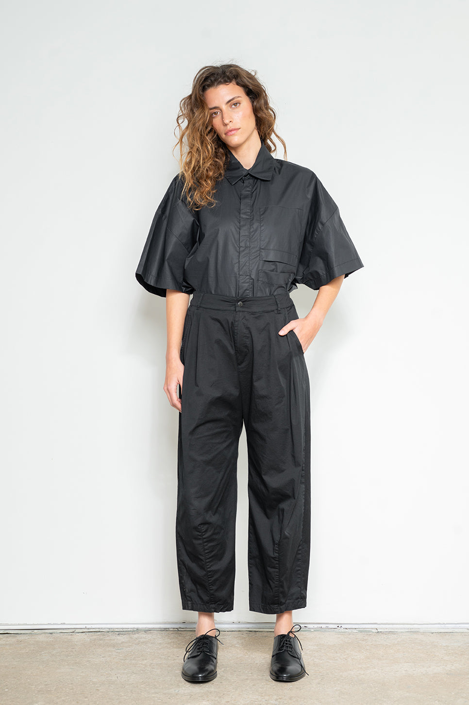 מכנסיים בסגנון מחוייט בגזרת בלון עם כפלים בחזית. חגורה עם גומי בגב ורכיסה סטנדרטית מלפנים. שני כיסי צד וכיס אחורי אחד. עשויים בד אריג כותנה דק עם מעט לייקרה לנוחות מירבית.- מאיה: גובה 178 ס"מ. היקפים: חזה 80 ס"מ | מותן 60 ס"מ | אגן 92 ס"מ, לובשת מידה 1.