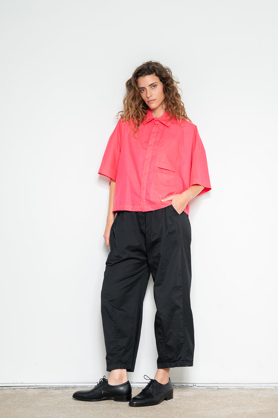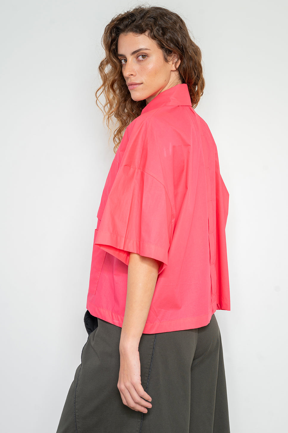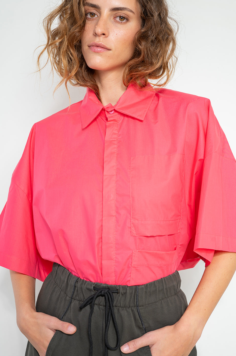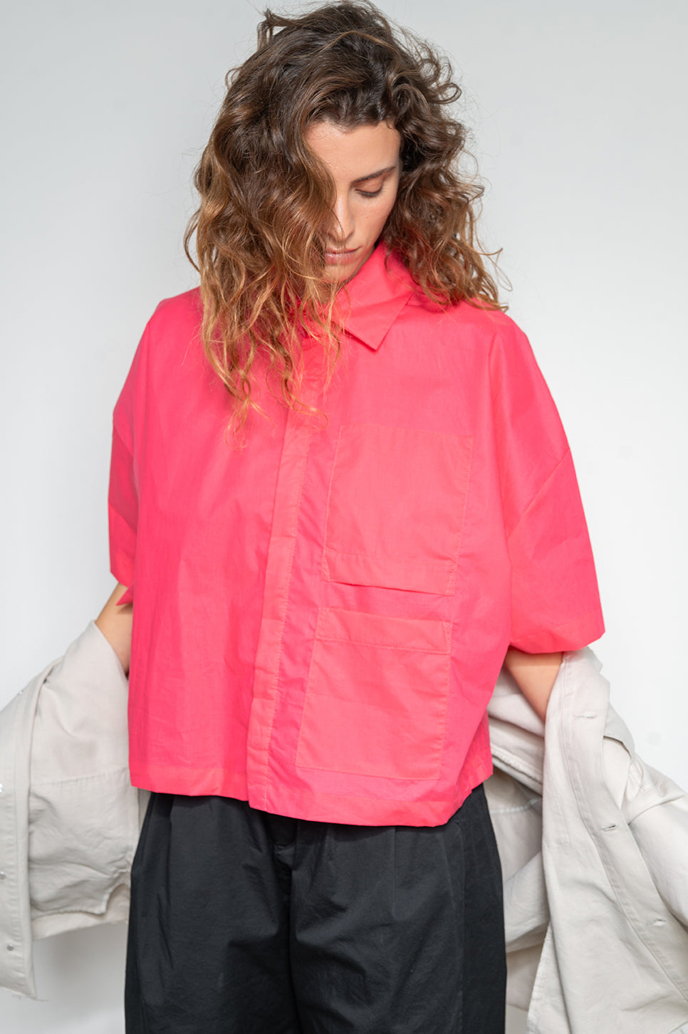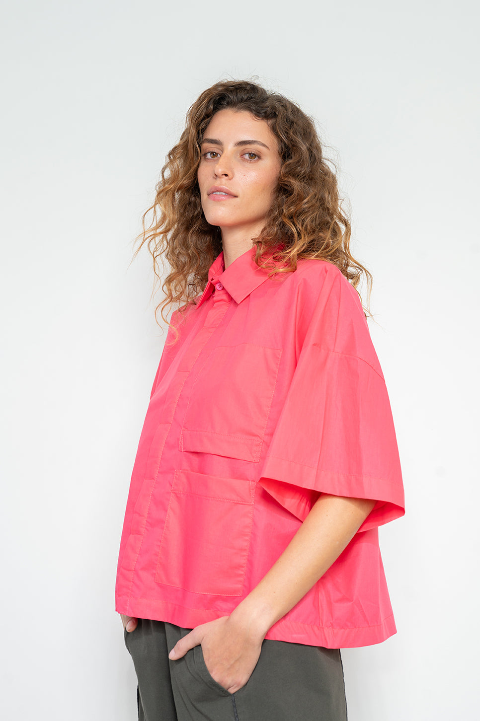חולצה מכופתרת בגזרה רחבה וקצרה. עם שני כיסים פרונטליים בצד שמאל - אחד רגיל ואחד הפוך שמשמש כדיטייל. כפתרה נסתרת. עשויה בד אריג כותנה קריספי עם מעט ברק.- מאיה: גובה 178 ס"מ. היקפים: חזה 80 ס"מ | מותן 60 ס"מ | אגן 92 ס"מ, לובשת מידה OS.