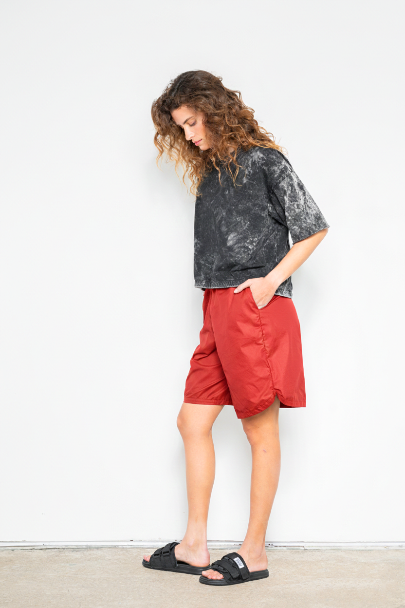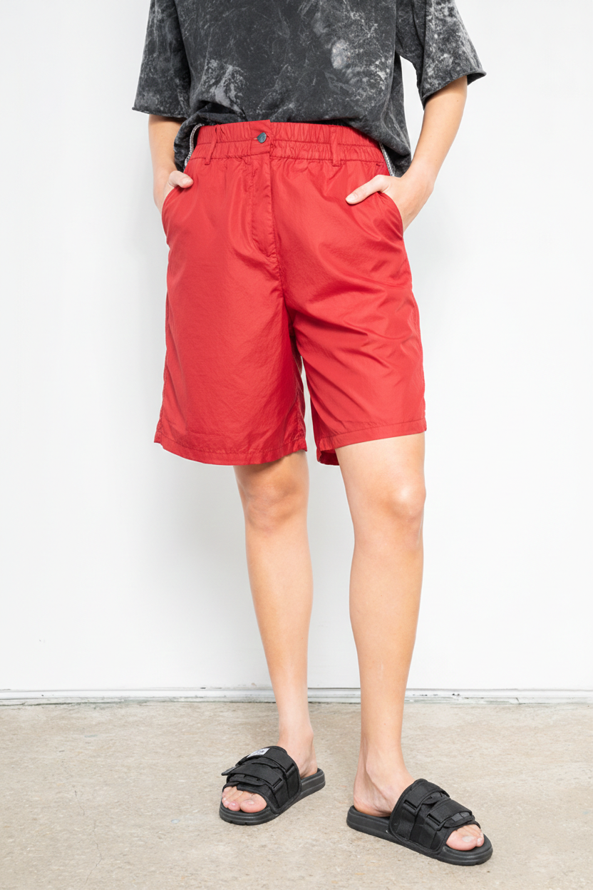 מכנסיים קצרים באורך הברך, בגזרה רחבה עם סיומת רגל מעוגלת. חגורת גומי עם רוכסן וכפתור, שני כיסי צד וכיס אחורי אחד. עשויים בד אריג כותנה דק.- מאיה: גובה 178 ס"מ. היקפים: חזה 80 ס"מ | מותן 60 ס"מ | אגן 92 ס"מ, לובשת מידה 1.