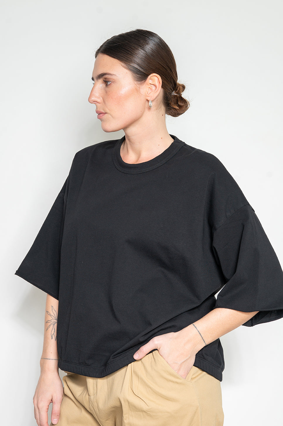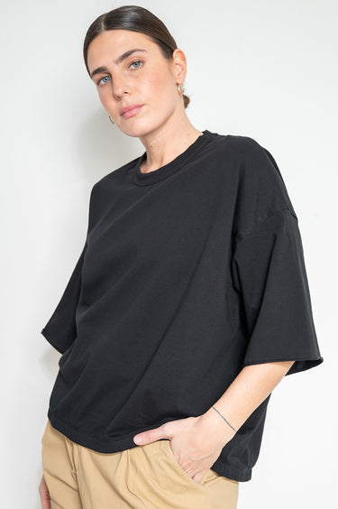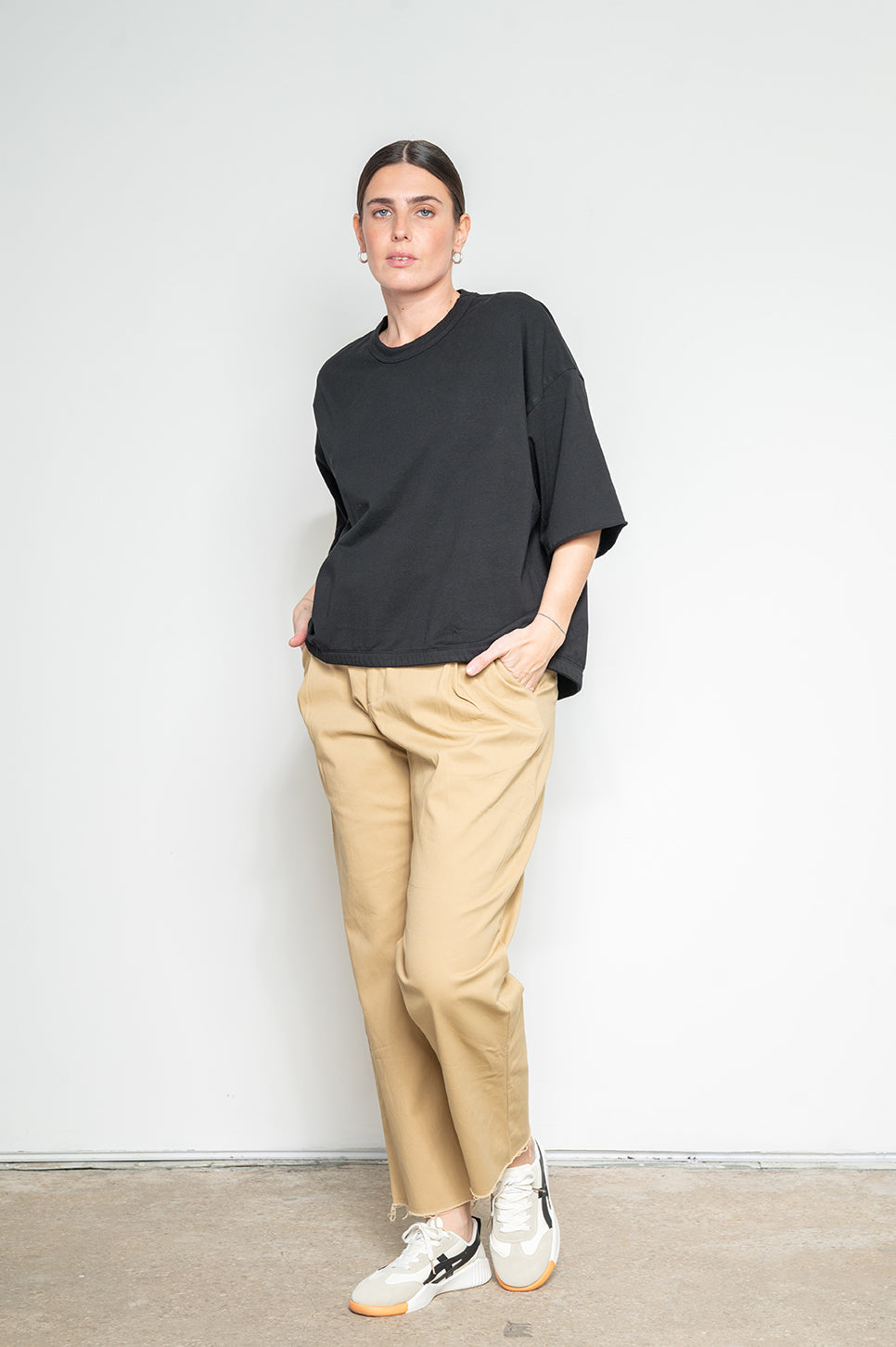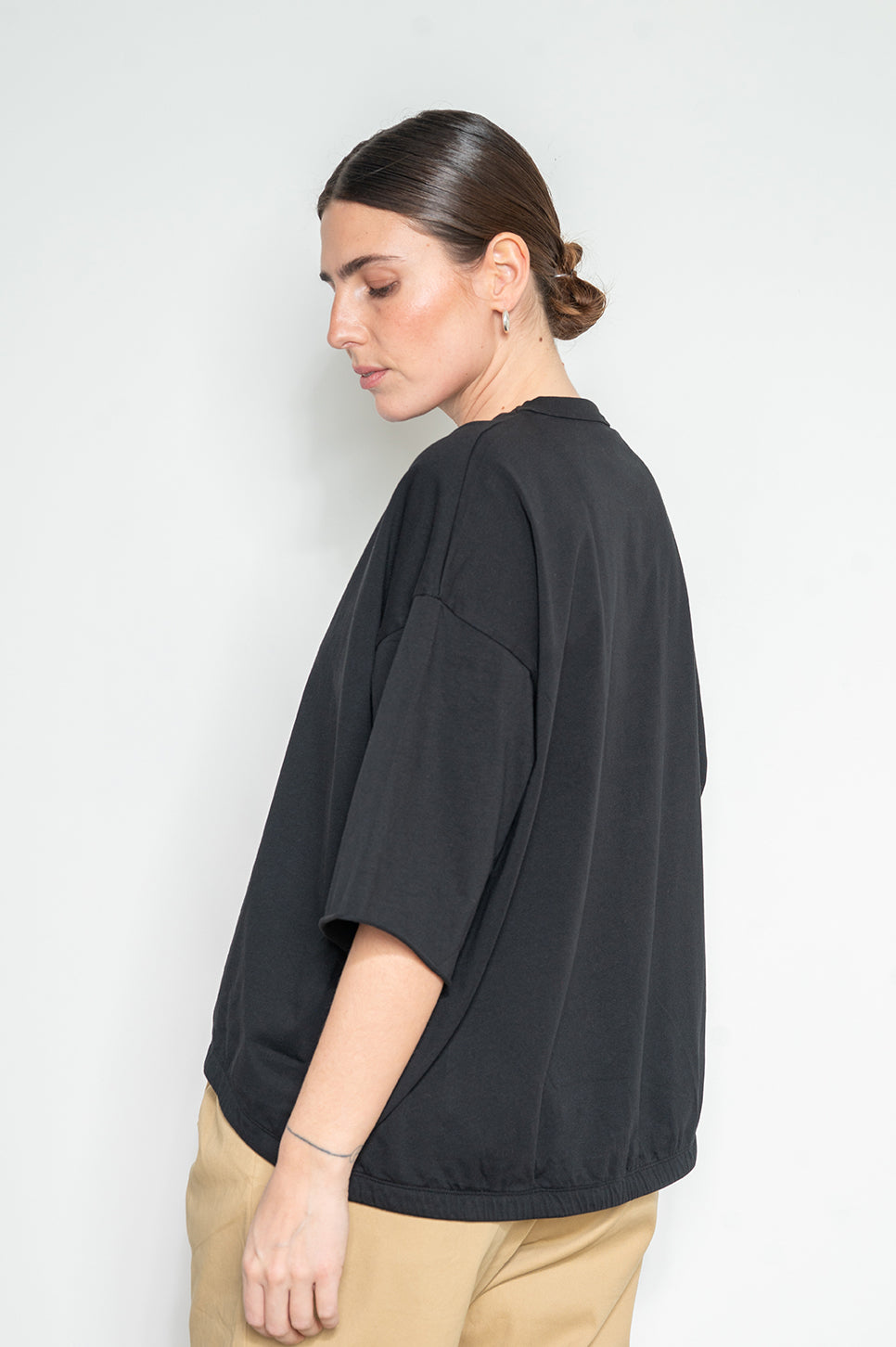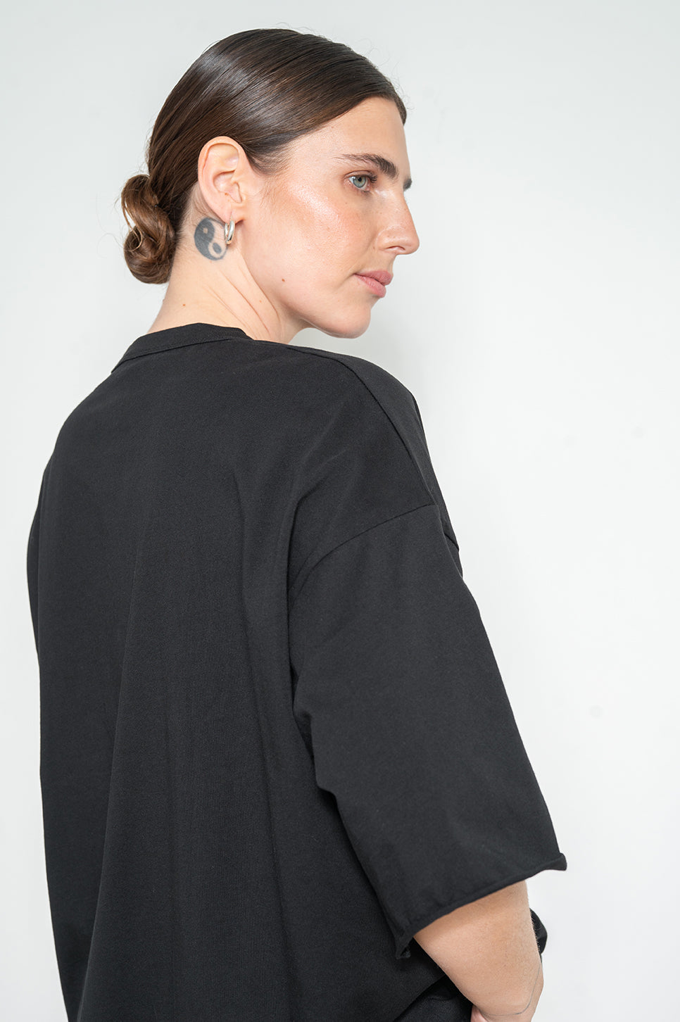 חולצת טישירט אוברסייז בגזרה ישרה, קצרה מלפנים ומעט ארוכה יותר מאחור. עם סיומת גוף עבה ועגולה, דמויית גומי, ששומרת על גזרתה ה"בוקסית" של החולצה. צווארון עגול עם סיומת מנג'ט אלסטי ושרוולים בסיומת גזורה.- מאיה: גובה 178 ס"מ. היקפים: חזה 80 ס"מ | מותן 60 ס"מ | אגן 92 ס"מ, לובשת ורוד ואסיד במידה S/M.