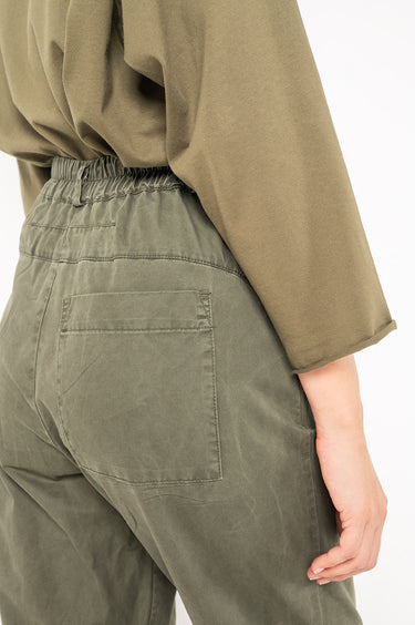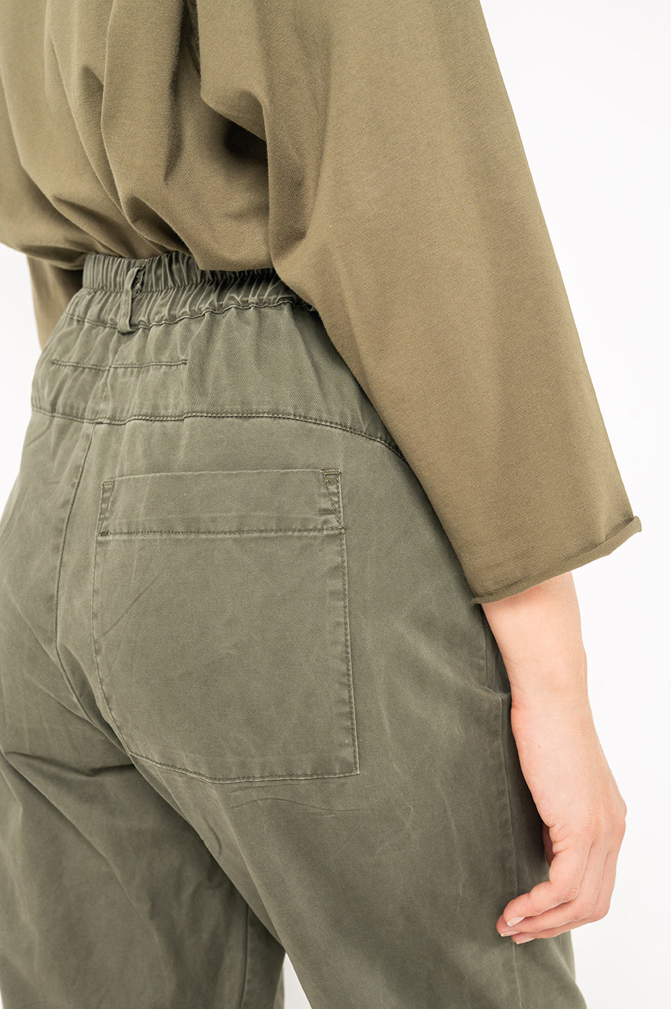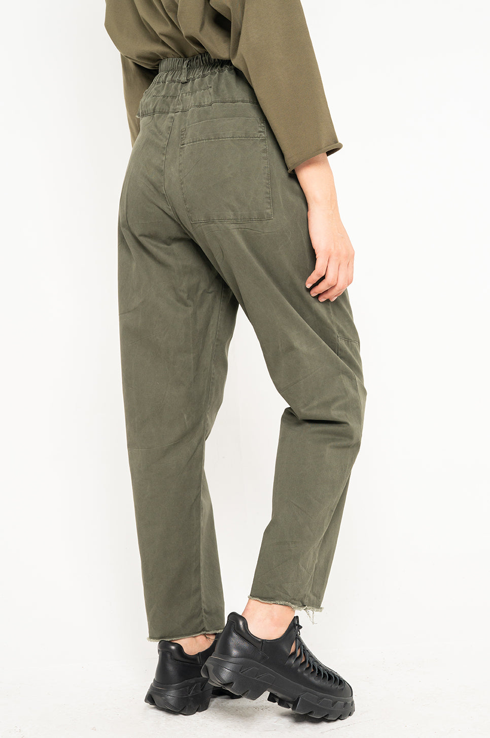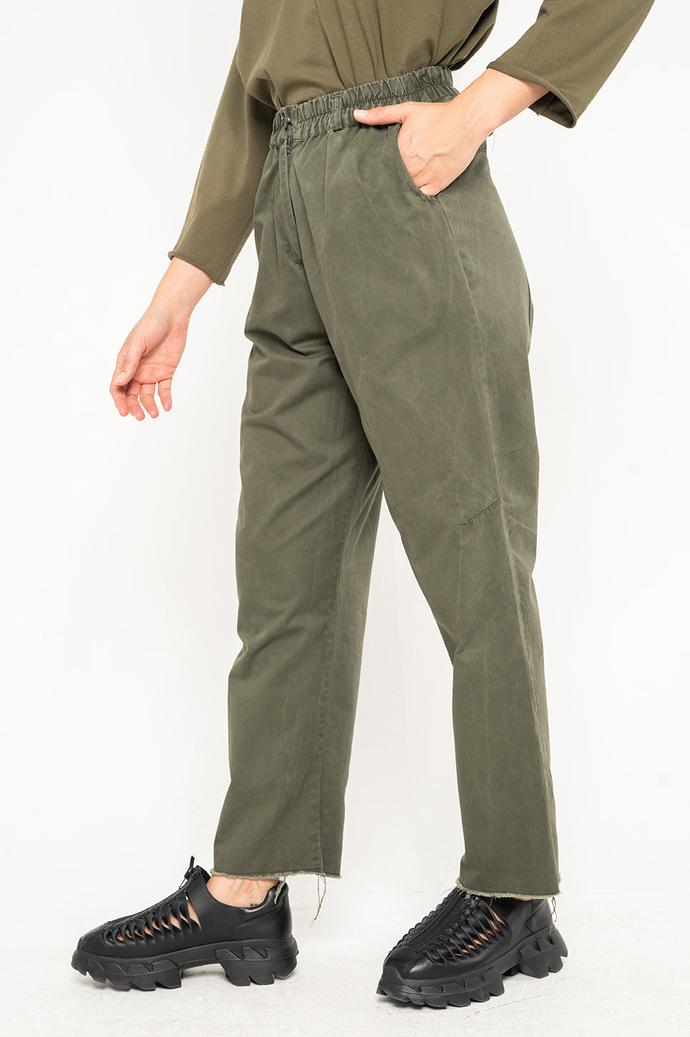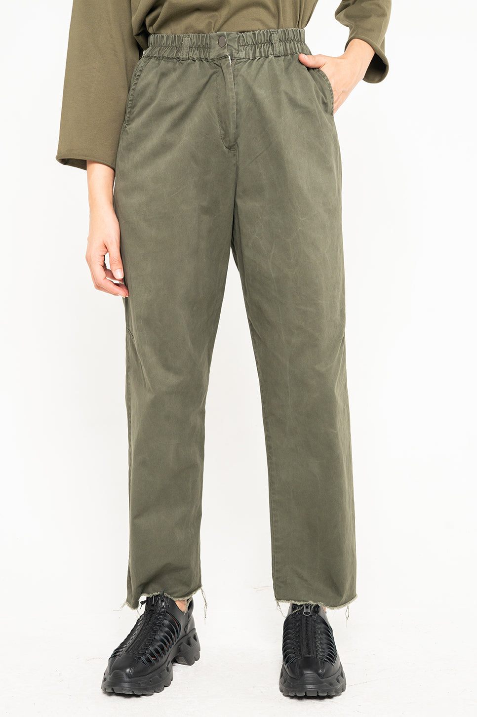 מכנסיים נינוחים בגזרה ישרה עם גומי בחגורה. בעלי רכיסה סטנדרטית ולולאות לחגורה, שני כיסי צד וכיס אחורי אחד. סיומת רגל במראה פרום.