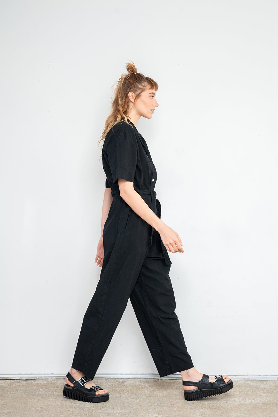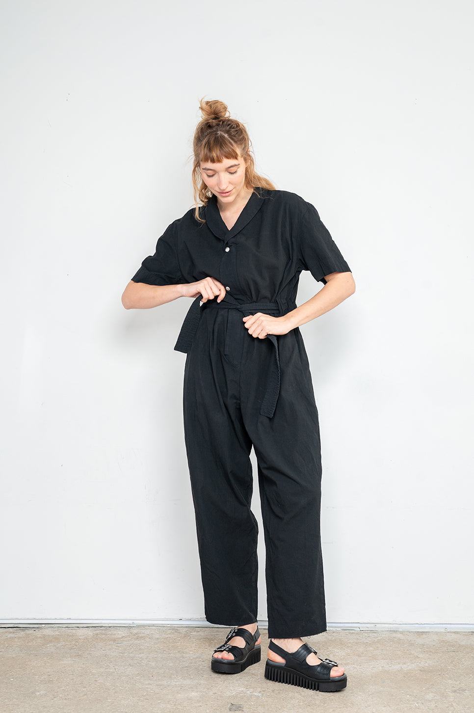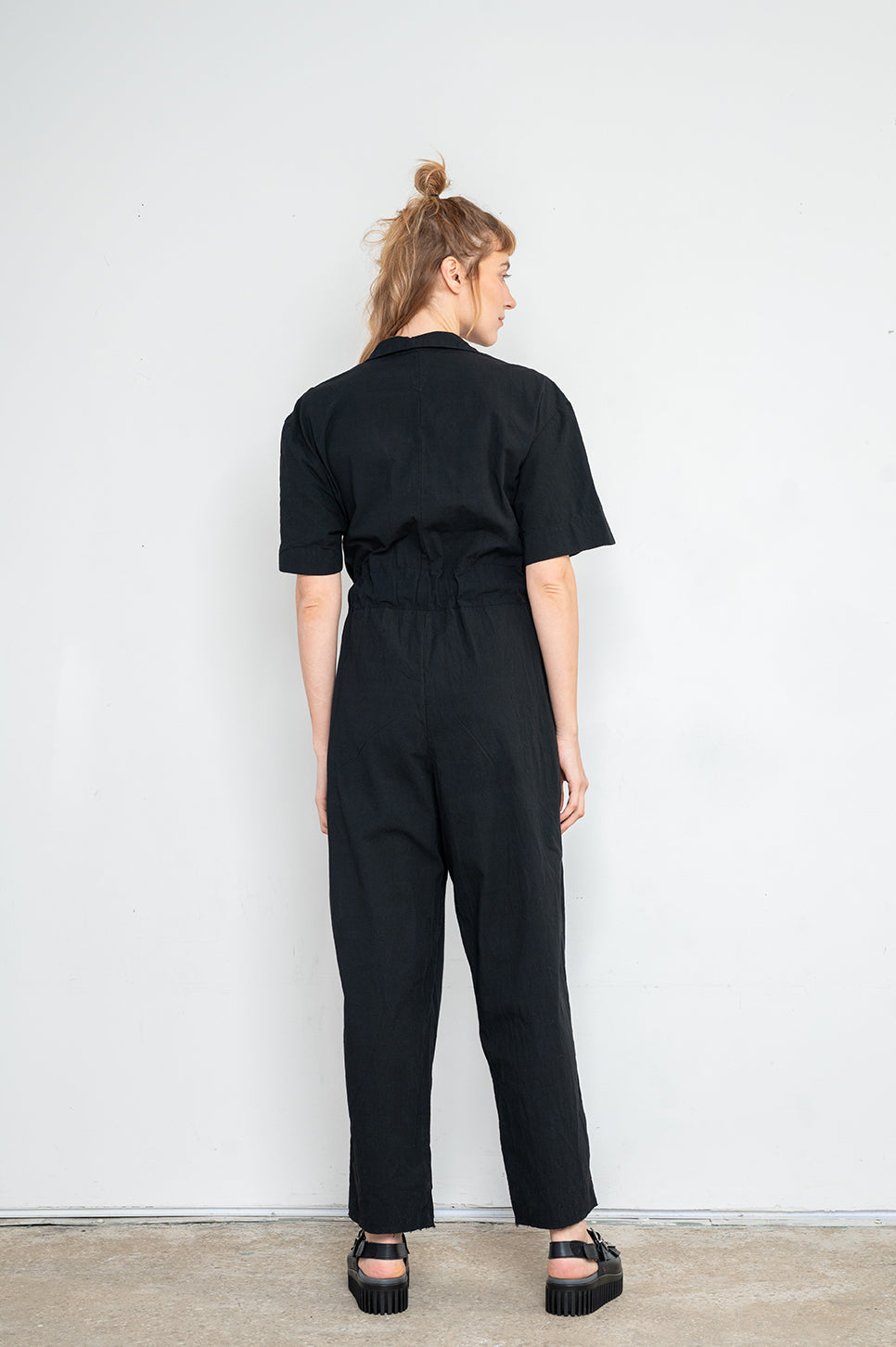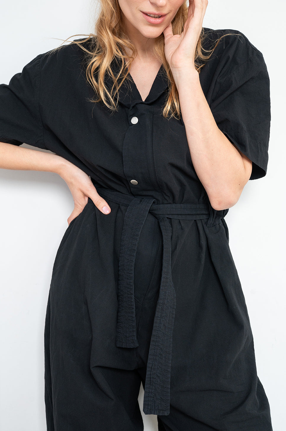 אוברול עם רוכסן פנימי ושני כפתורי תיקתק לסגירת צווארון מעטפת. עשוי בד כותנה טבעי, בעל שרוולים קצרים ושני כיסים קדמיים. ישנו גומי במותן אחורי ושרוך עבה לקשירה והידוק מלפנים.