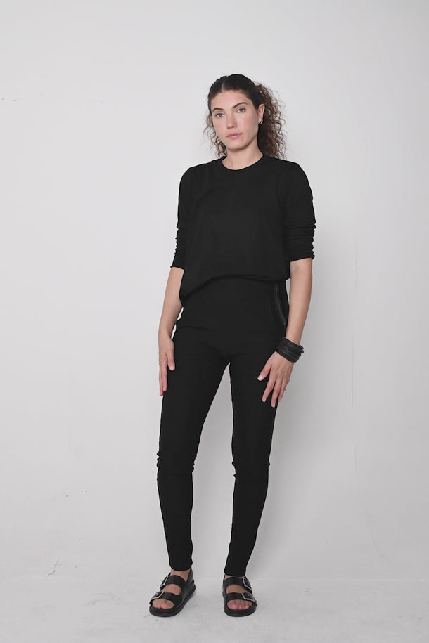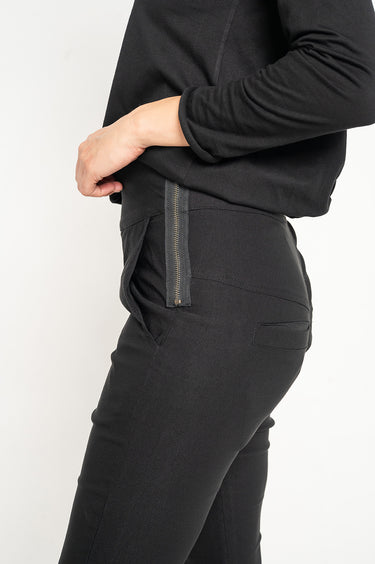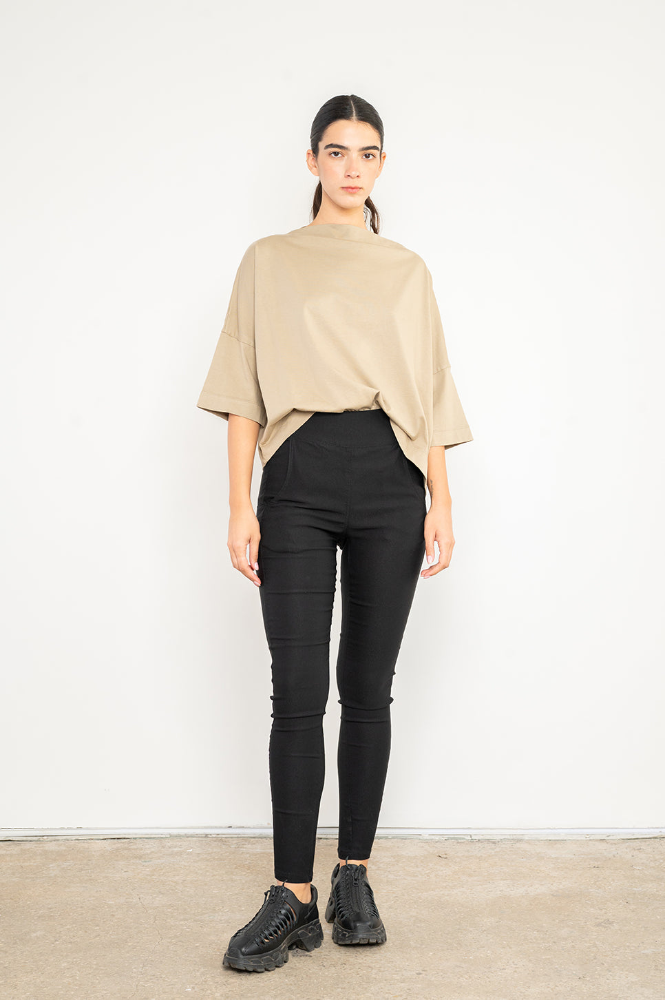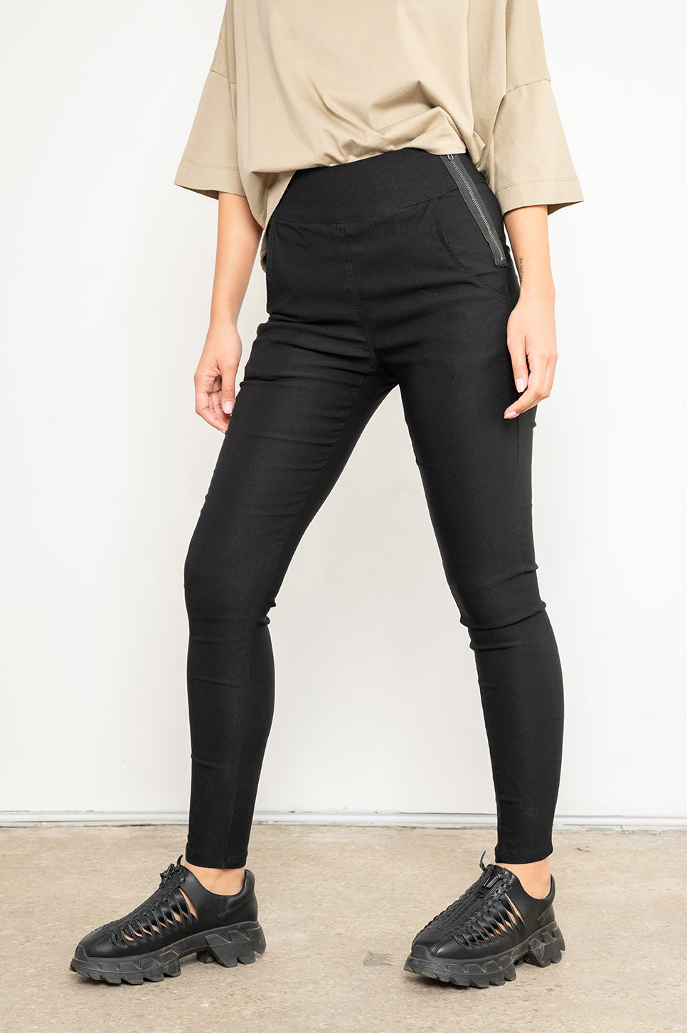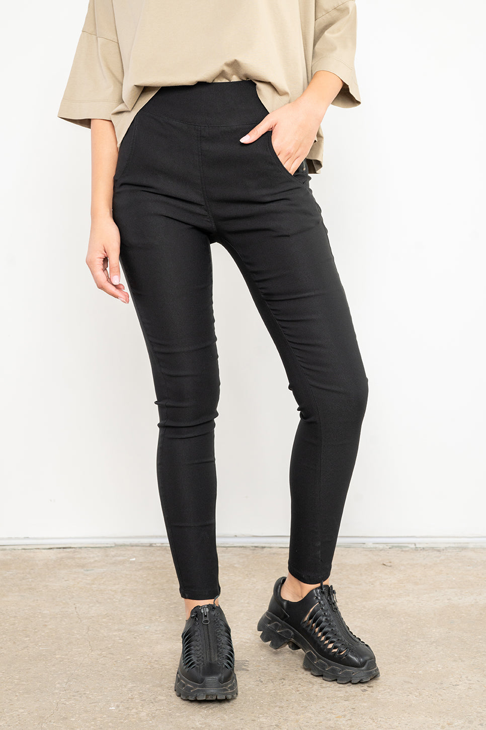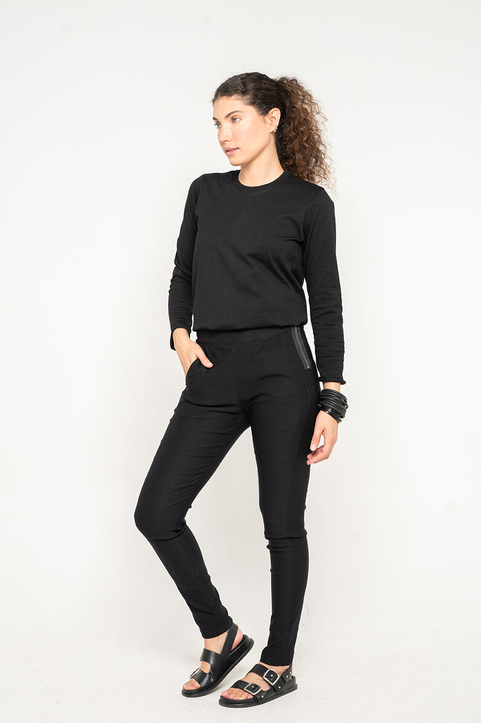 מכנסיים בגזרת סקיני גבוהה עם סגירת רוכסן בצד, אוספים אך לא לוחצים. עם כיסים מלפנים ומאחור. עשויים בד אריג אלסטי.- יובל: גובה 170 ס"מ | היקפים: חזה 86 ס"מ | מותן 65 ס"מ | אגן 95 ס"מ, לובשת מידה 36.