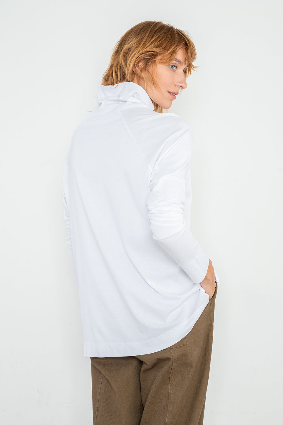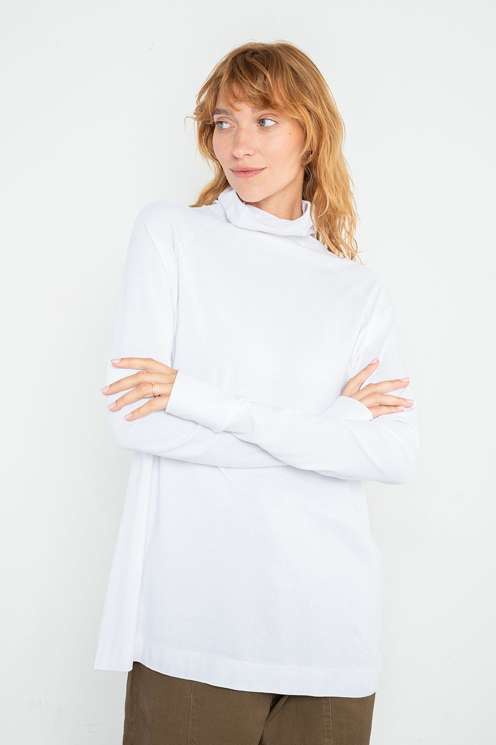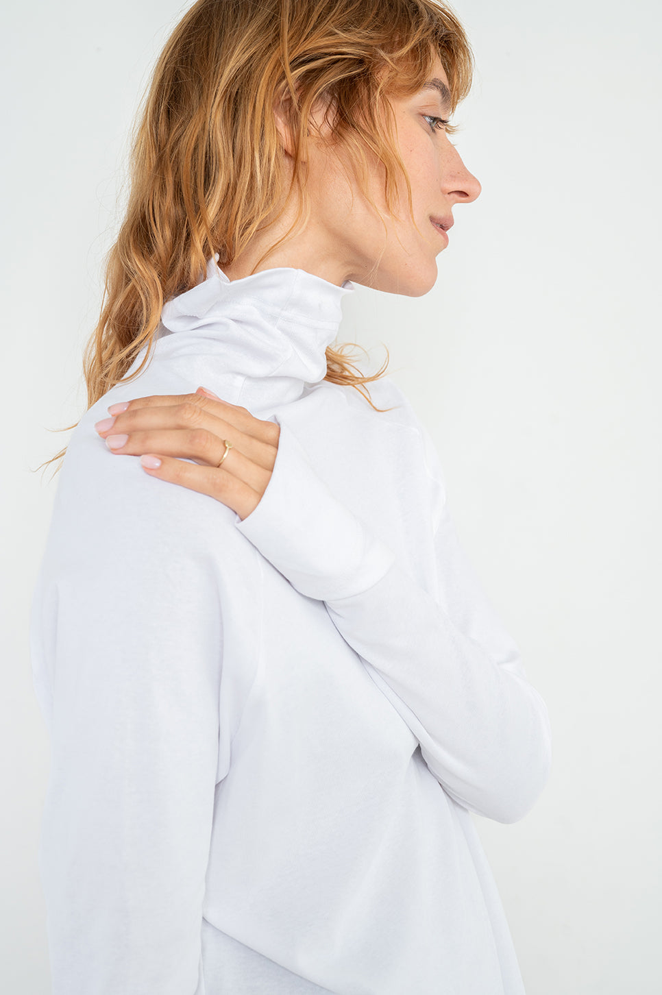 חולצת גולף ארוכה בגזרה ישרה עם שרוולי רגלן. בקצה השרוול פתח לאגודל. המאסט-האב שלנו לחורף!- אנה: גובה 178 ס"מ. היקפים: חזה 88 ס"מ | מותן 70 ס"מ | אגן 88 ס"מ, לובשת מידה 2.