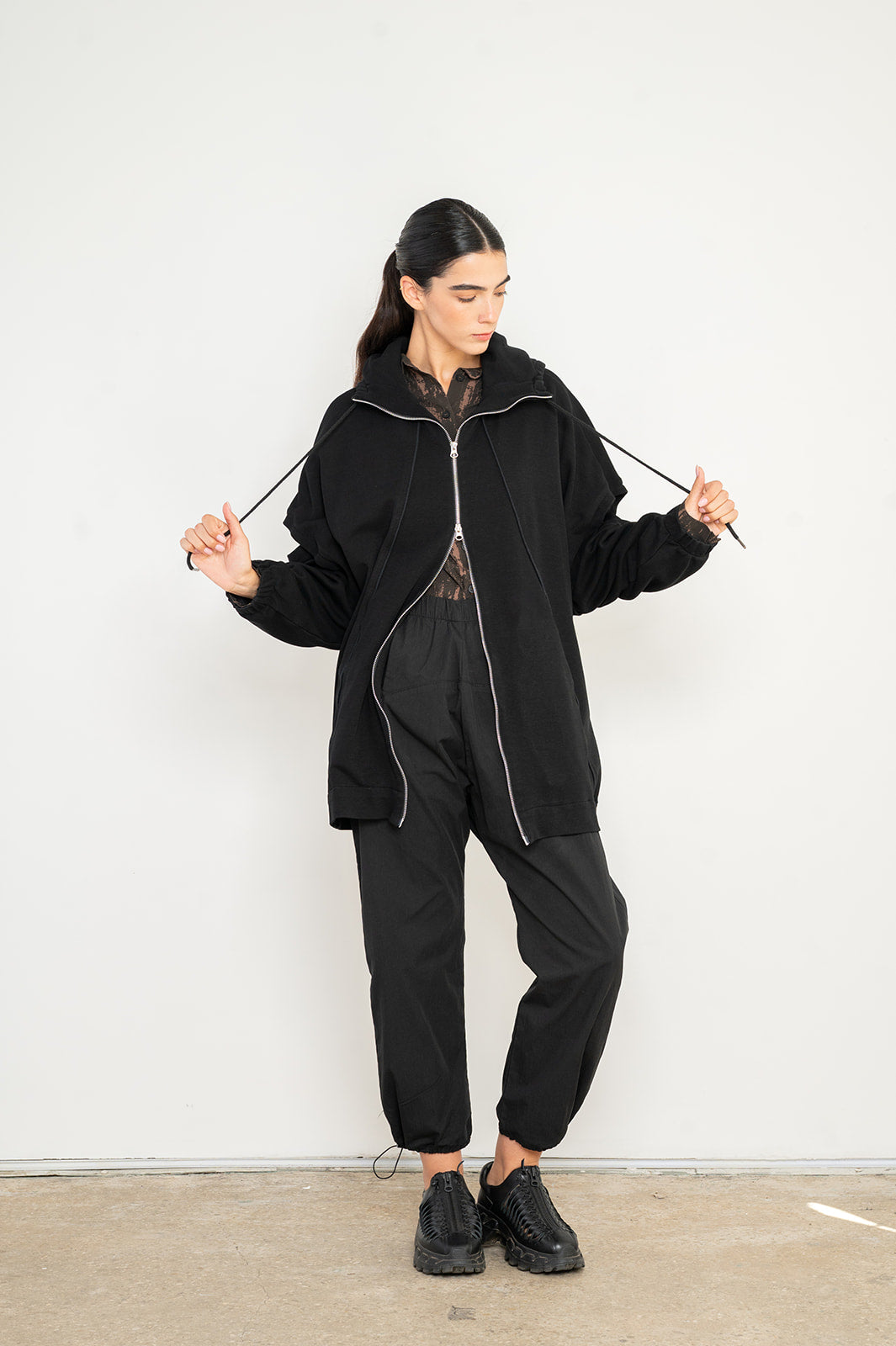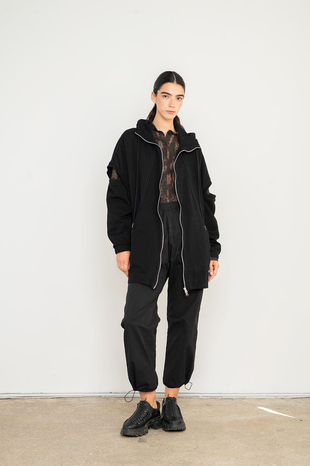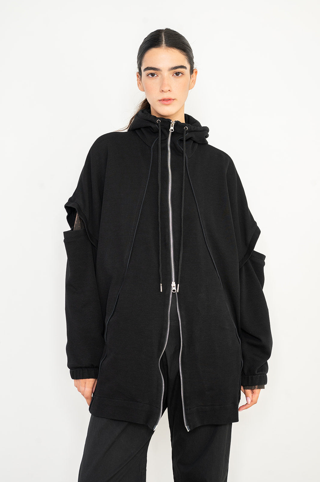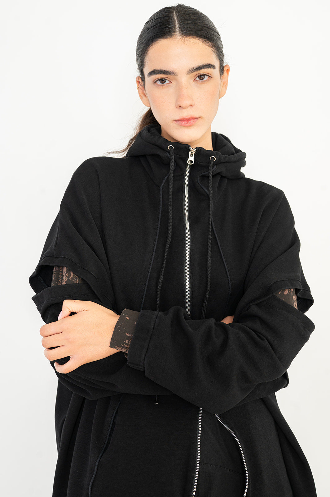 סווטשירט עם קפוצ'ון במראה אקסטרה-אוברסייז. בעל רוכסן מתכת דו-צדדי ושני כיסים קדמיים. עם פתחים בשרוולים מעל קו המרפק וסיומת גומי בידיים.- אנה: גובה 178 ס"מ. היקפים: חזה 88 ס"מ | מותן 70 ס"מ | אגן 88 ס"מ.