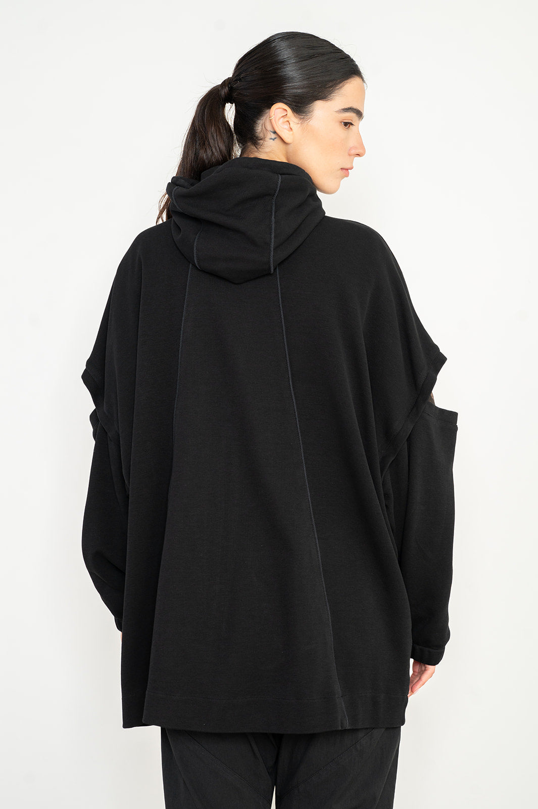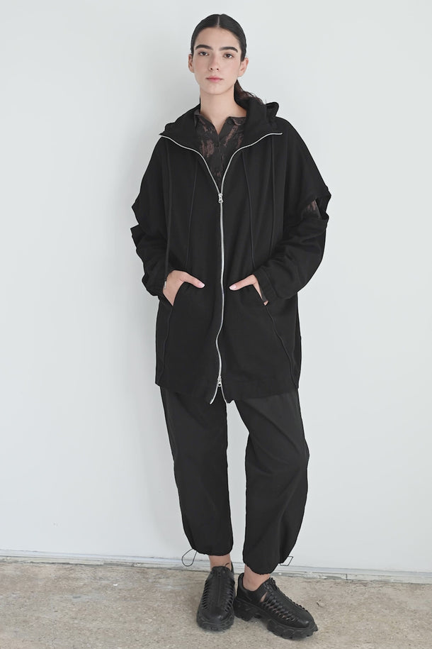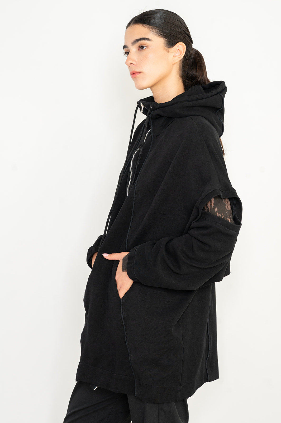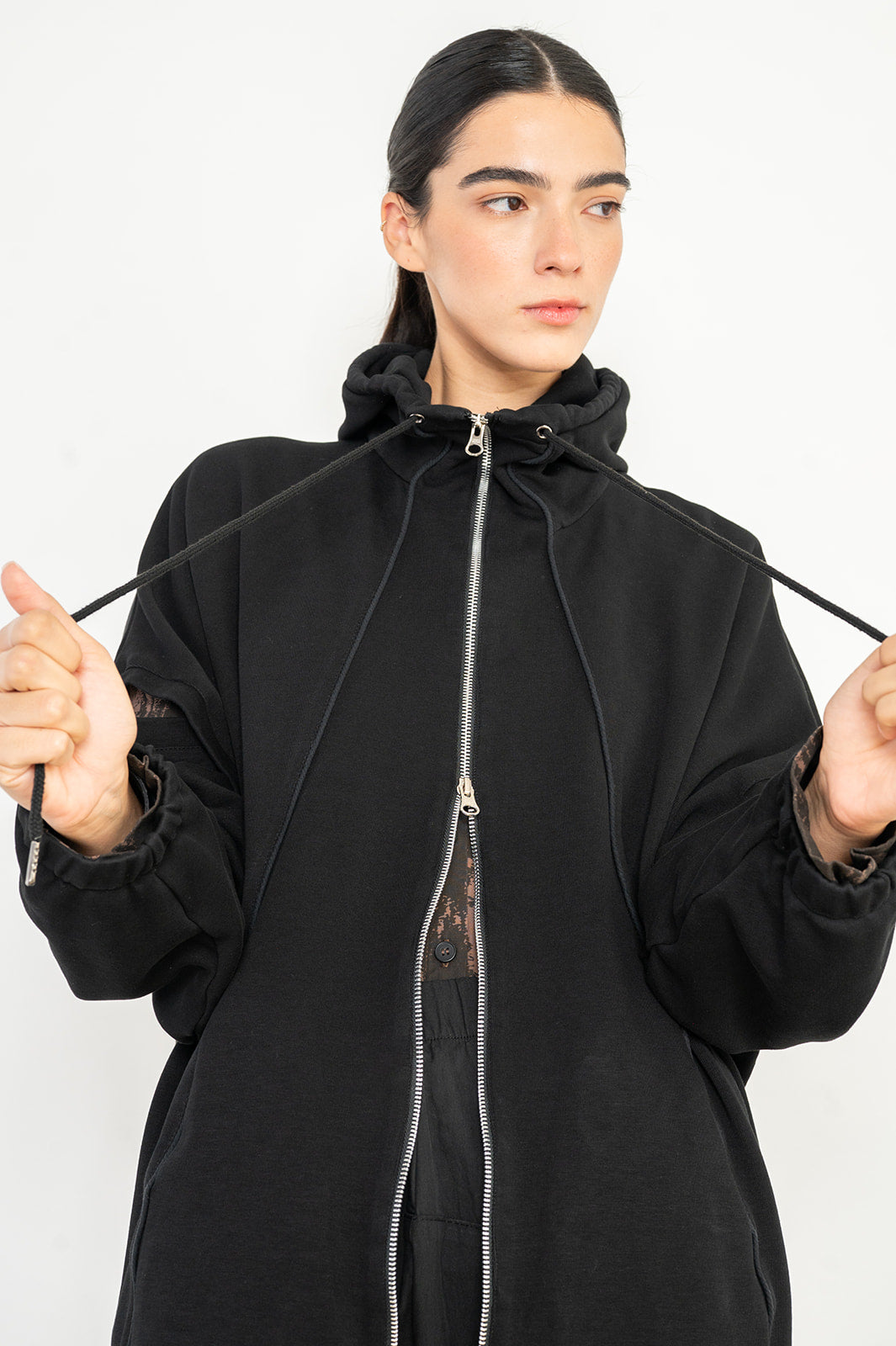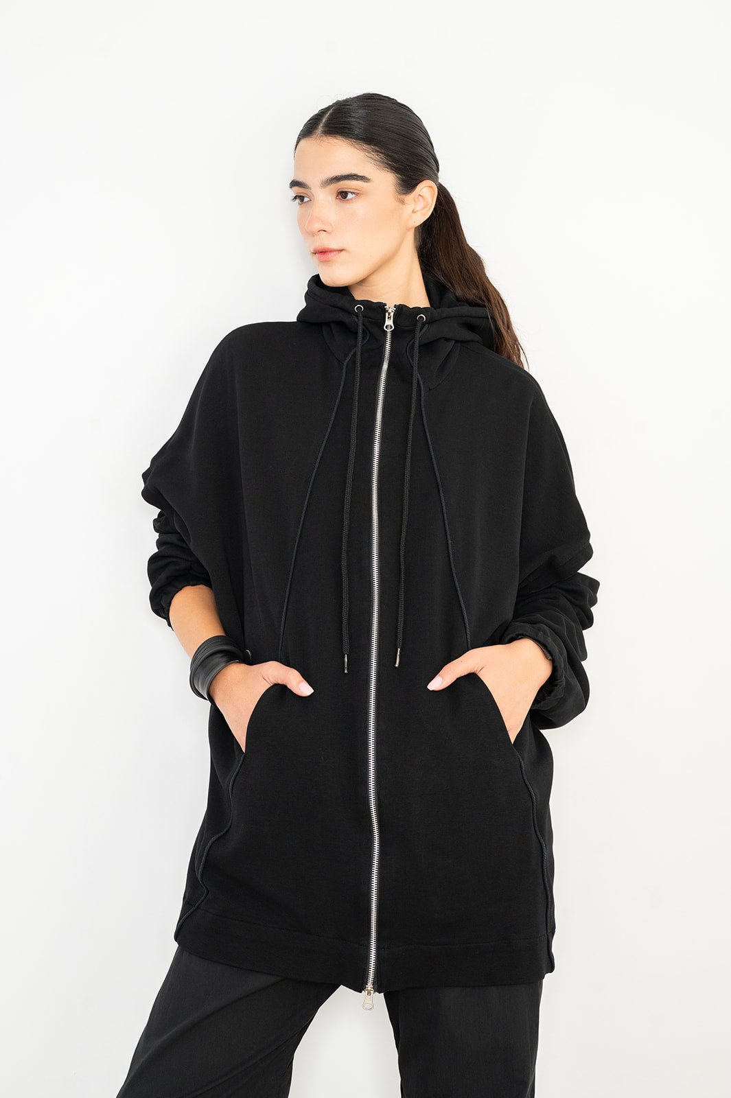 סווטשירט עם קפוצ'ון במראה אקסטרה-אוברסייז. בעל רוכסן מתכת דו-צדדי ושני כיסים קדמיים. עם פתחים בשרוולים מעל קו המרפק וסיומת גומי בידיים.- אנה: גובה 178 ס"מ. היקפים: חזה 88 ס"מ | מותן 70 ס"מ | אגן 88 ס"מ.