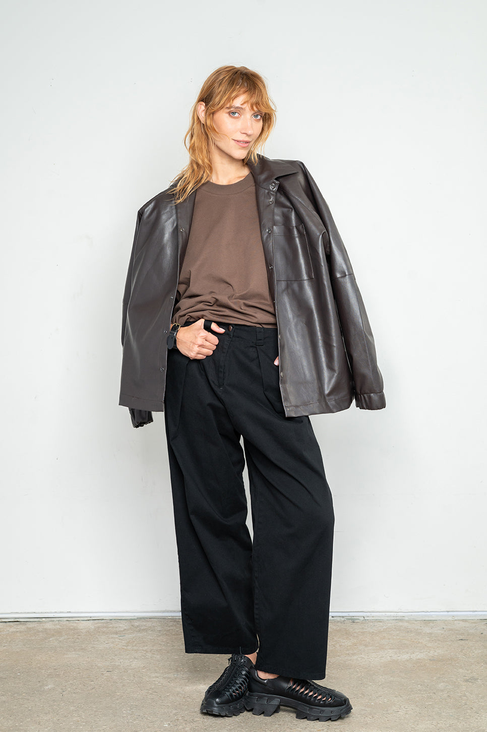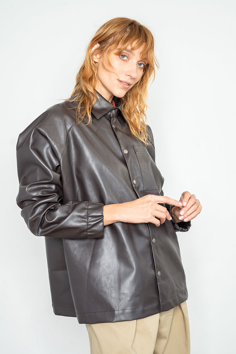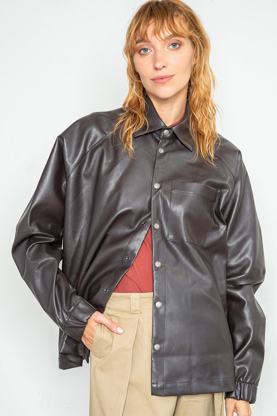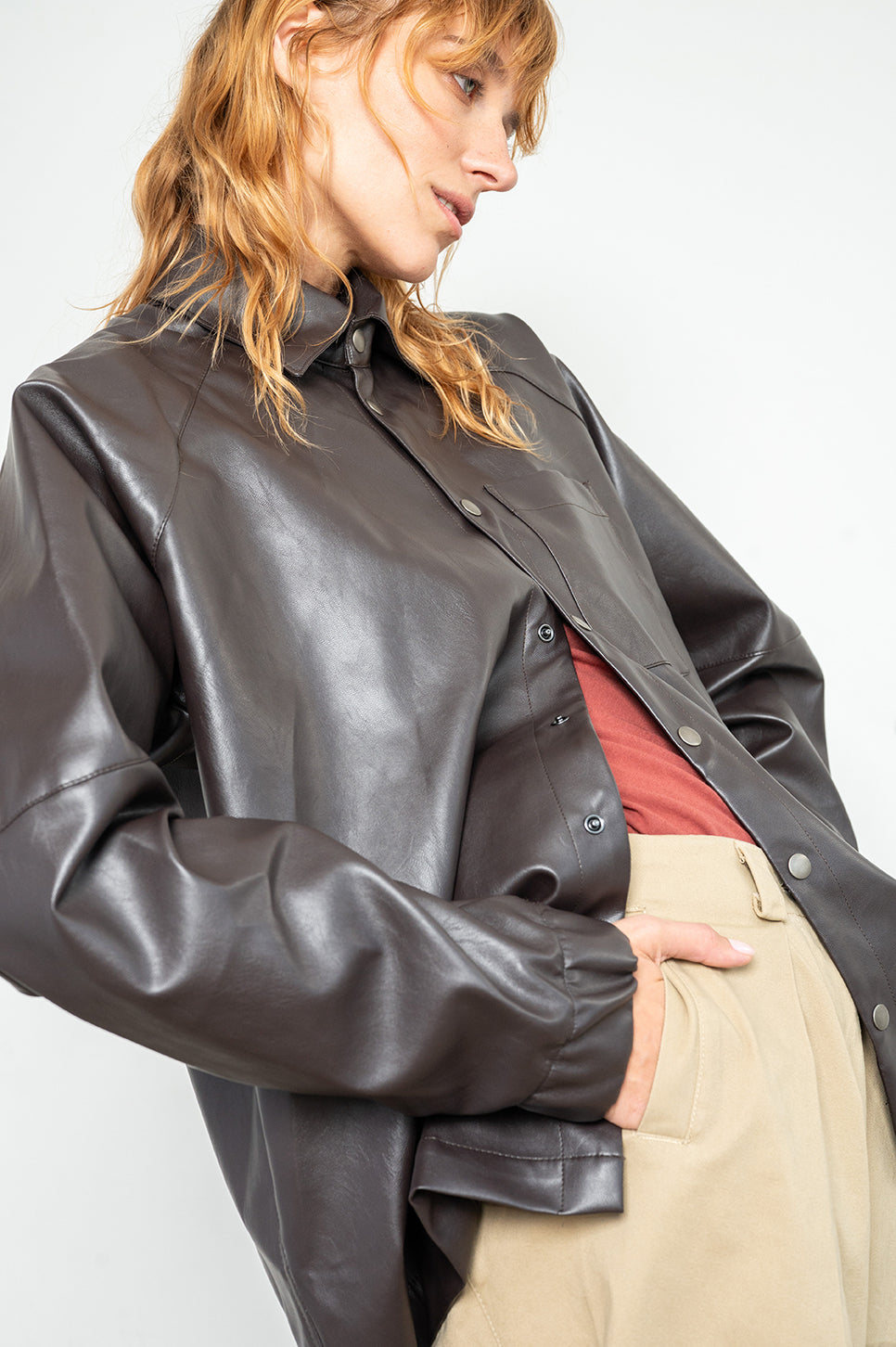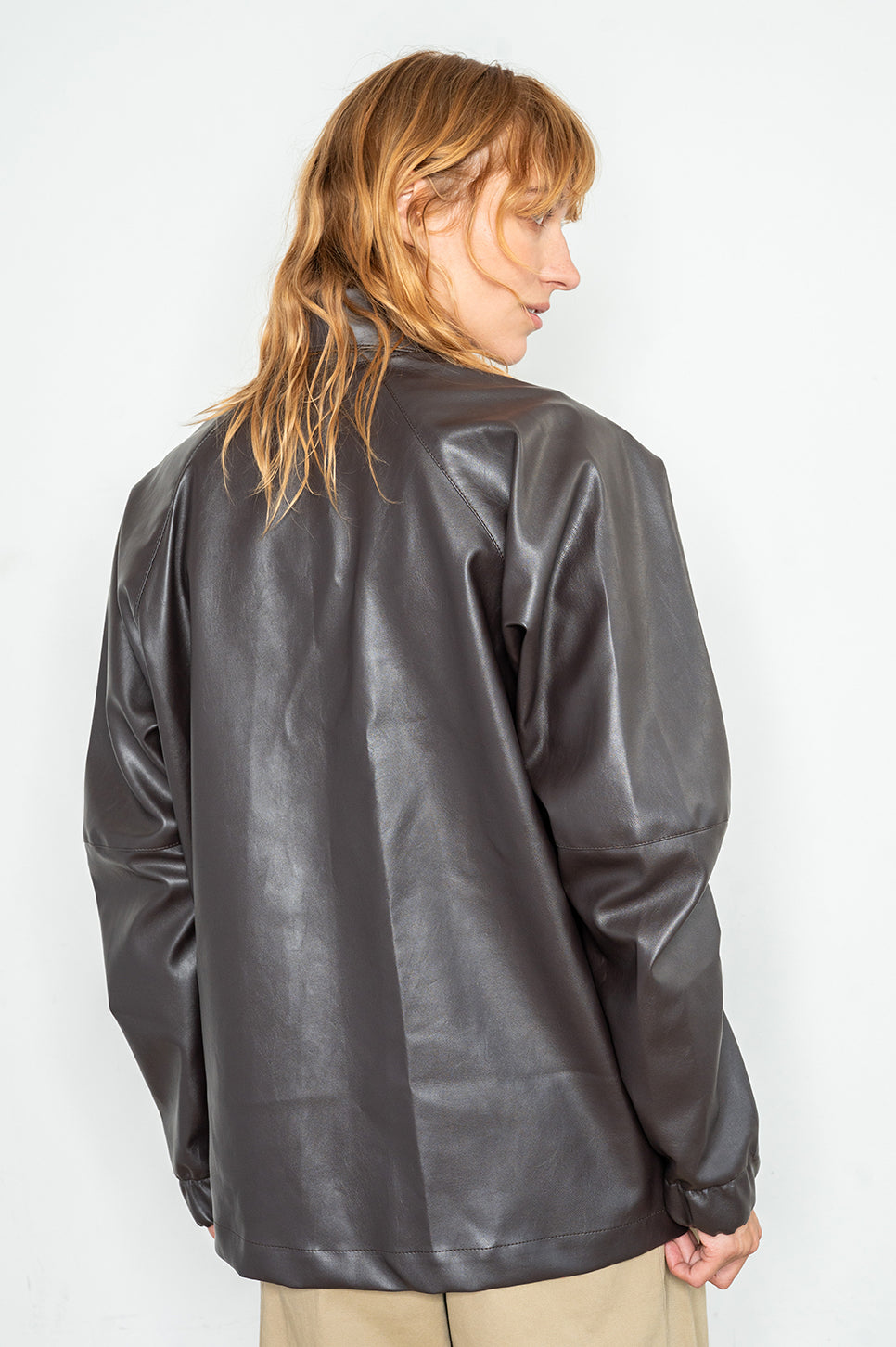 ג'קט קליל מבד דמוי עור בגזרה ישרה עם צווארון קלאסי ושרוולי רגלן בסיומת גומי. בעל רכיסת טיקטקים בחזית ושני כיסי צד. אנה: גובה 178 ס"מ. היקפים: חזה 88 ס"מ | מותן 70 ס"מ | אגן 88 ס"מ, לובשת מידה S/M.