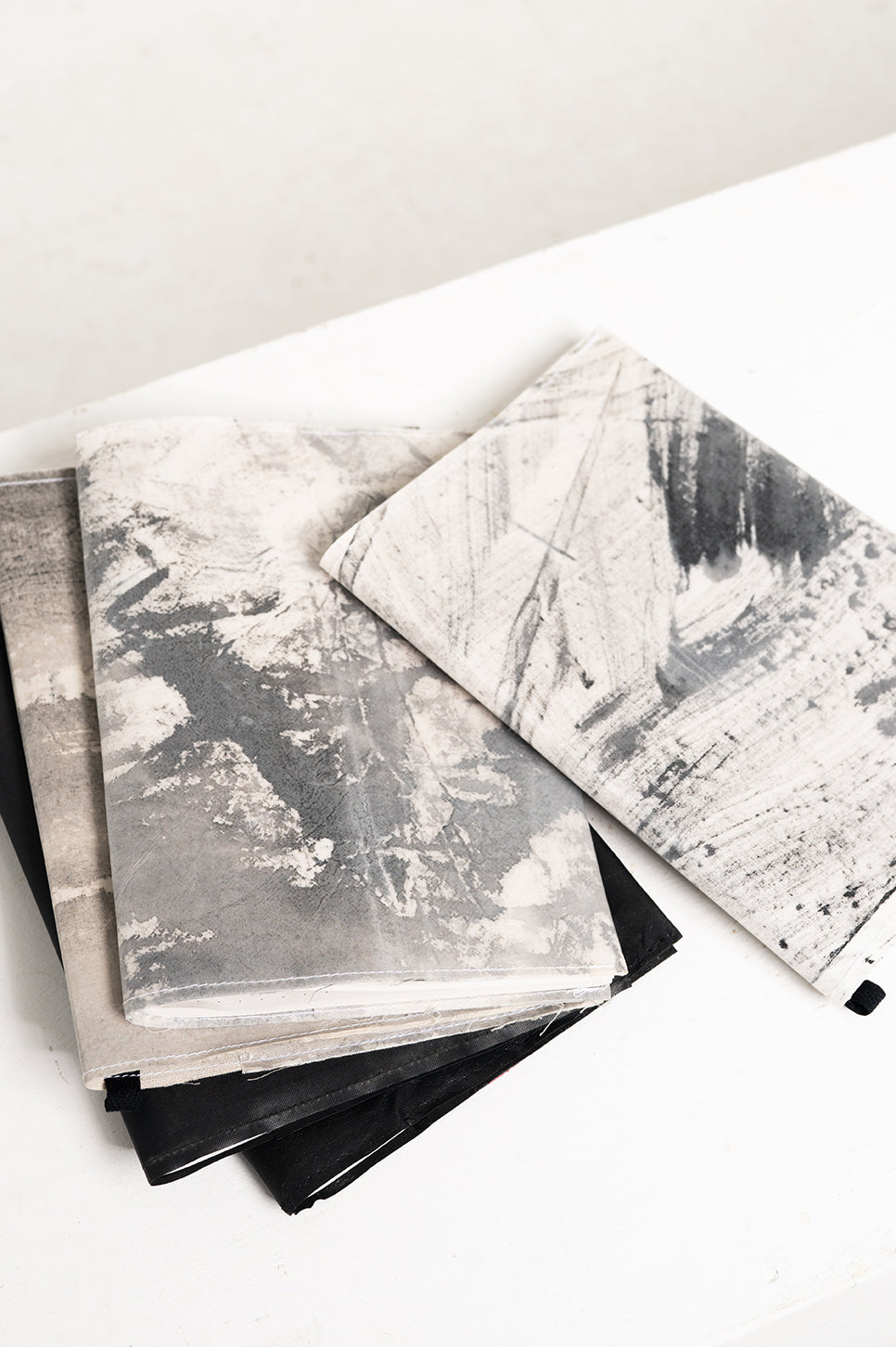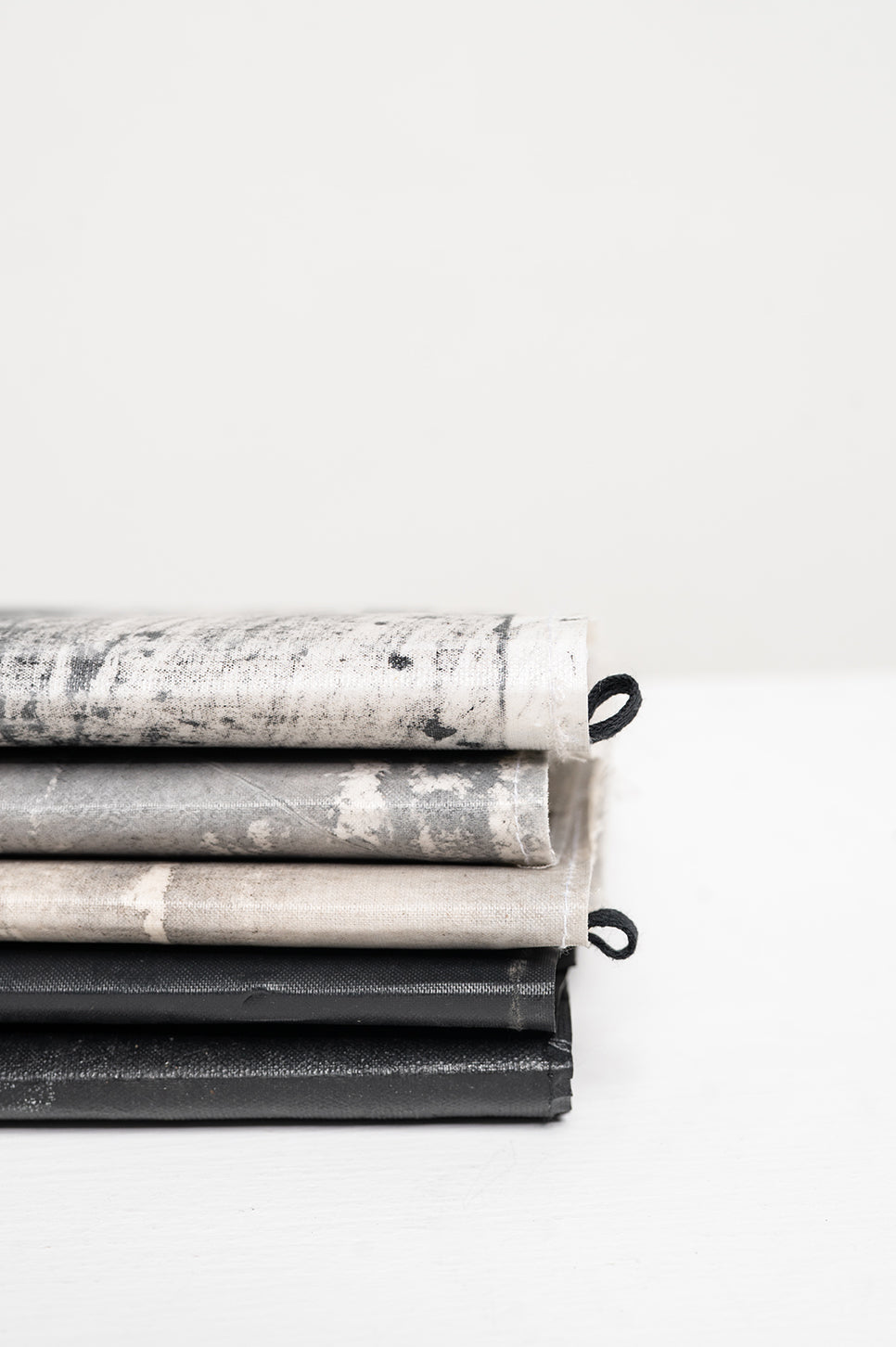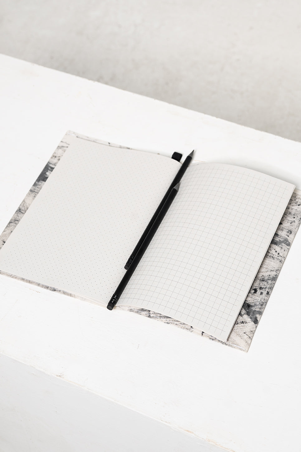 מחברת בגודל A5 מנייר ממוחזר בגריד משולב (שורות/משבצות/נקודות), עם כריכה ייחודית לשימוש חוזר עשויה למינציית בד וניילון בטכניקה ידנית ייחודית, כל אחת קצת אחרת.הרכב בד