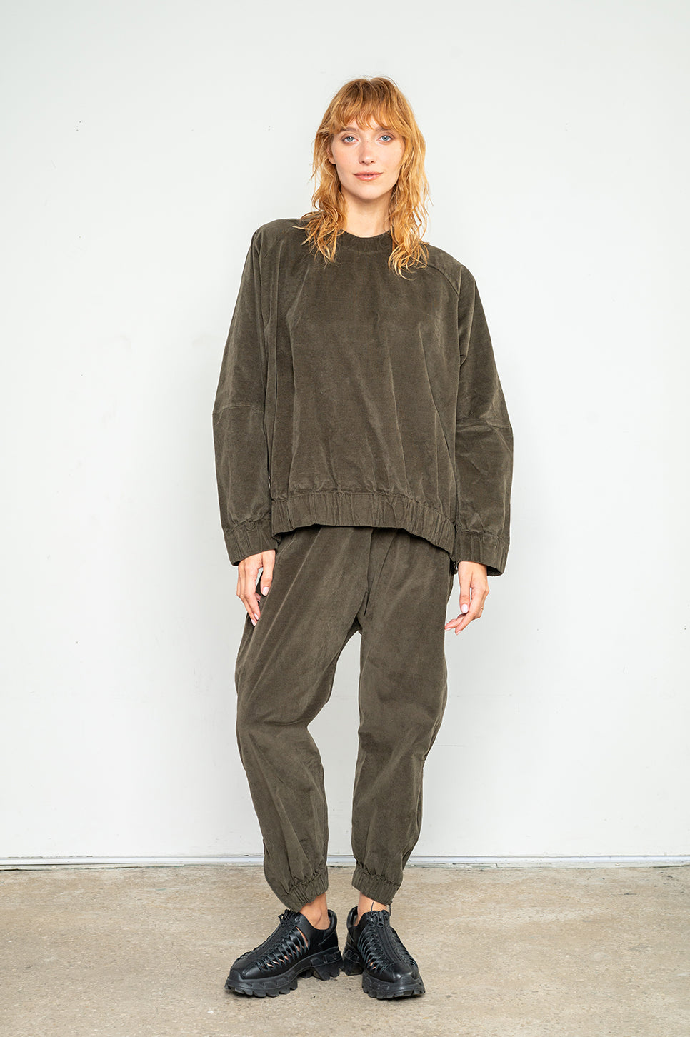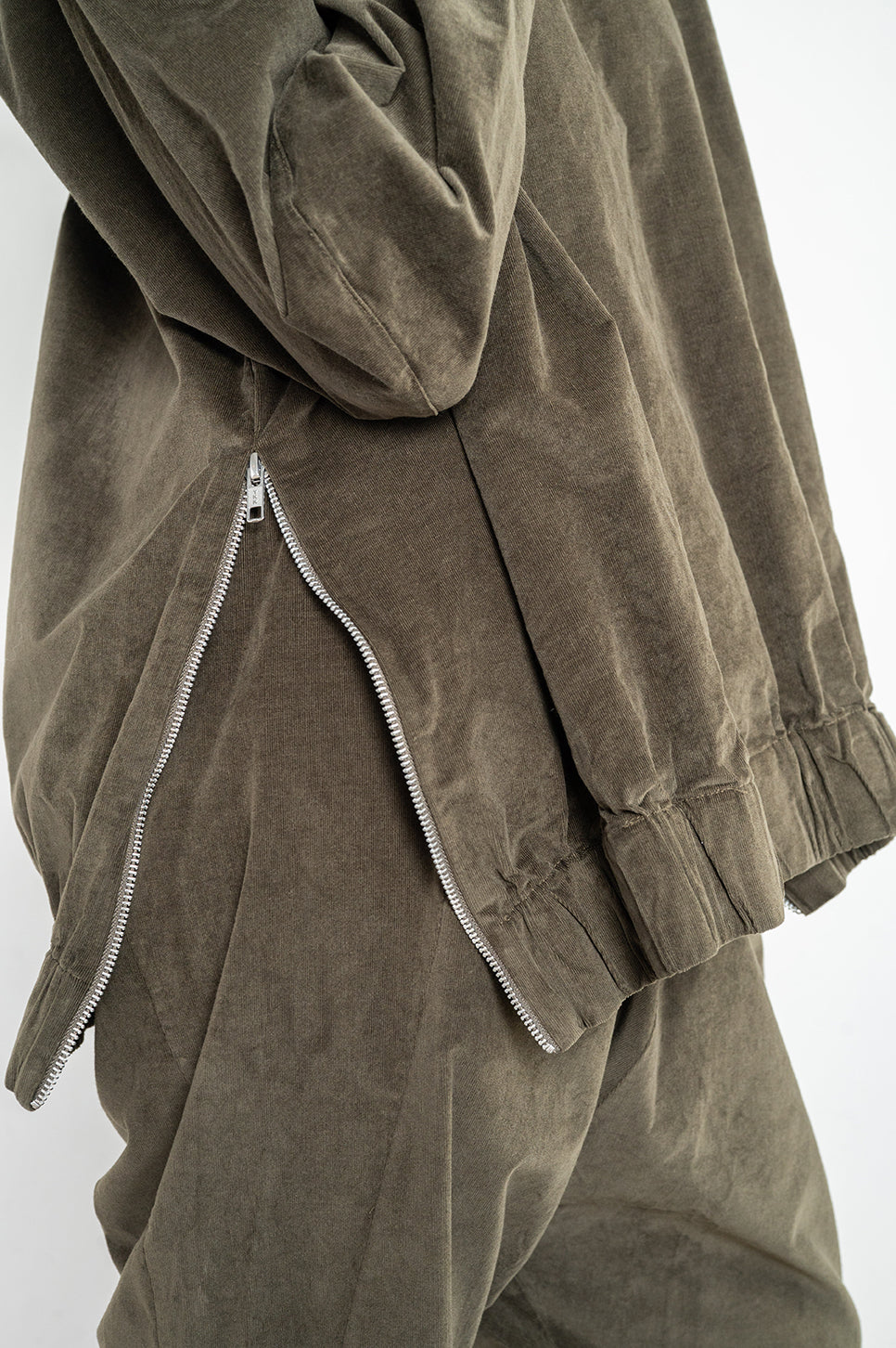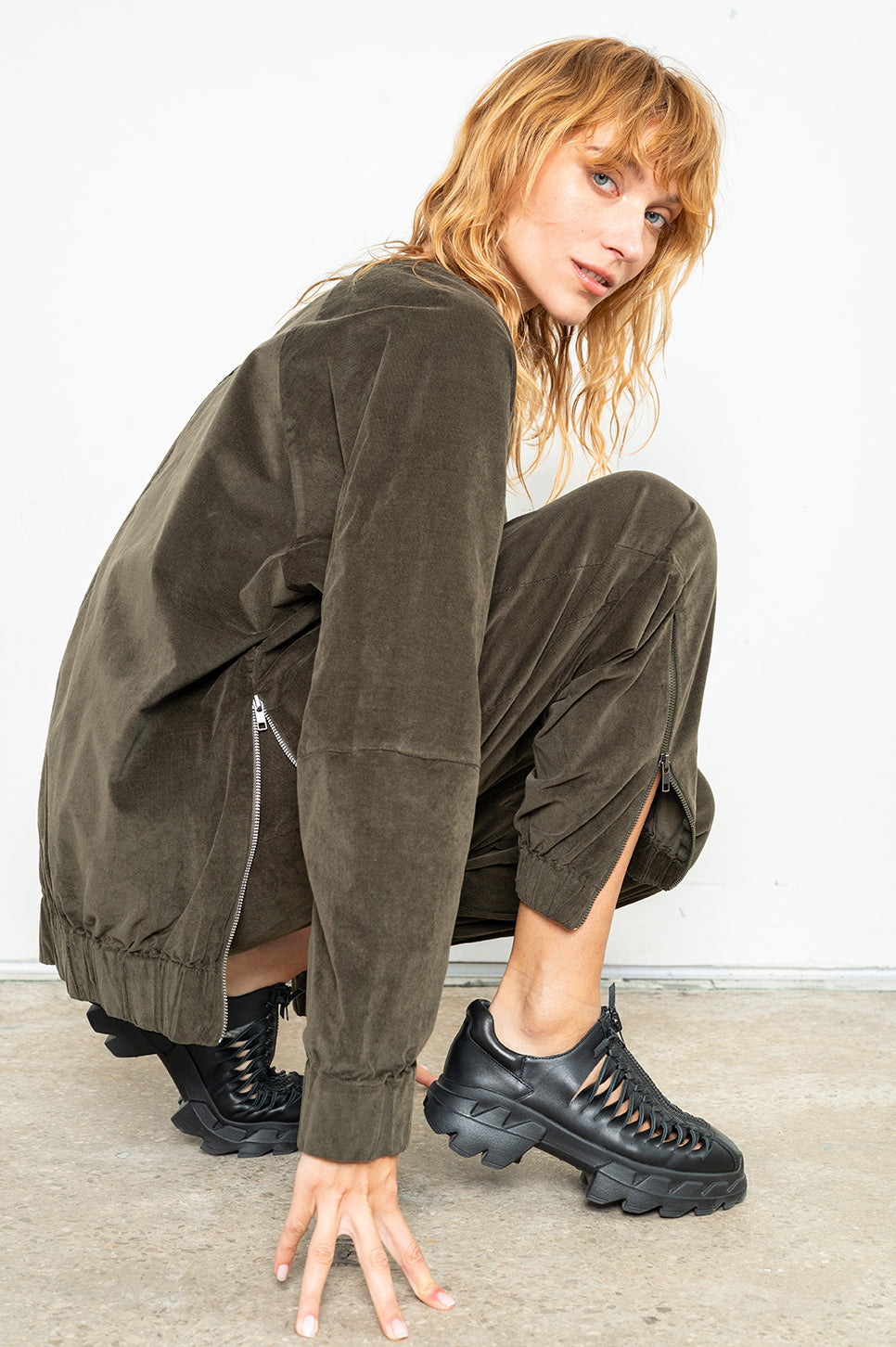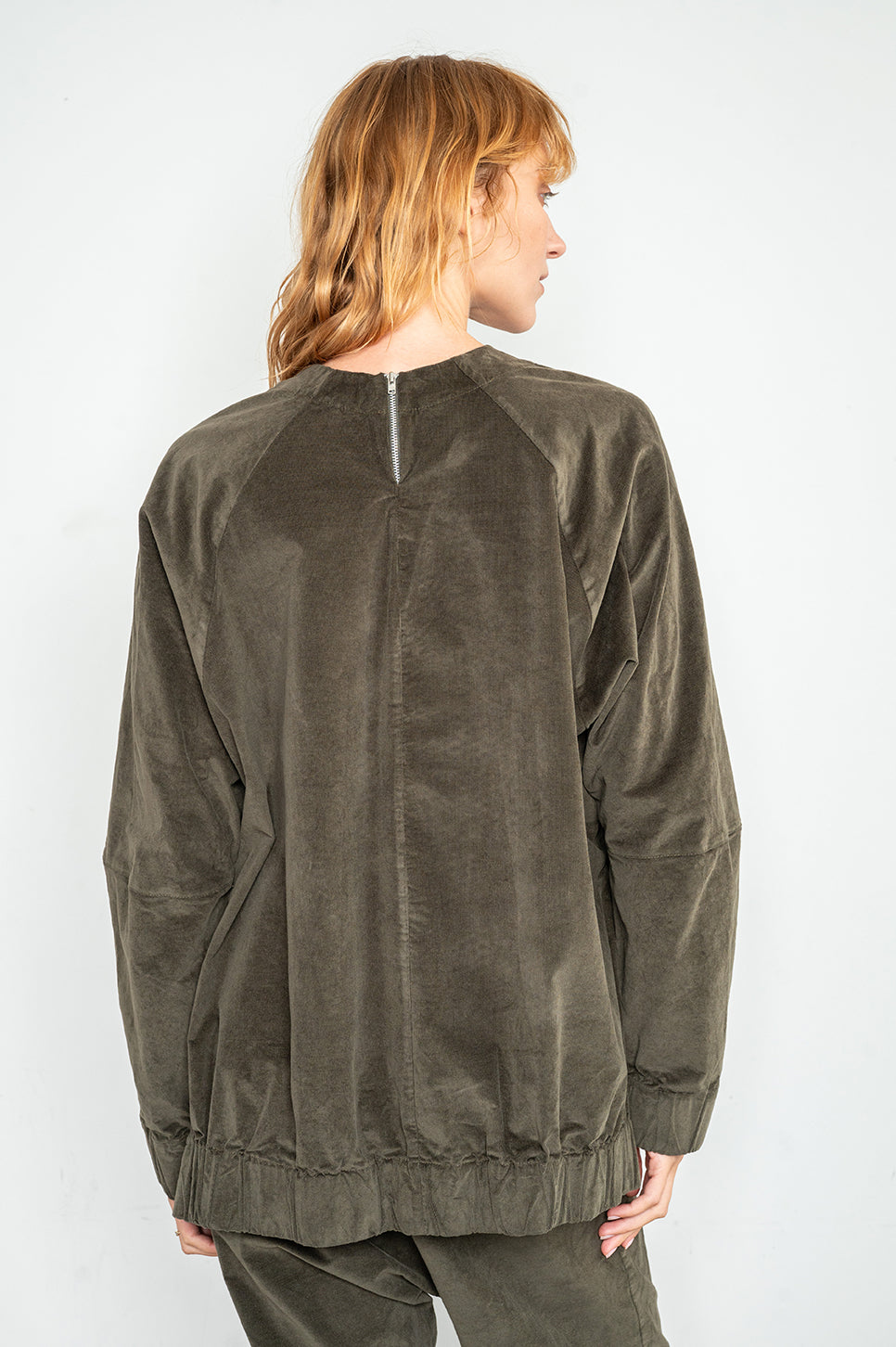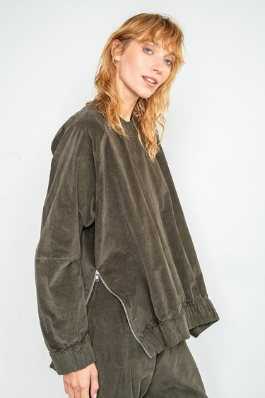 סווטשירט מבד אריג קטיפה בגזרת אוברסייז ישרה עם שרוולי רגלן. שני רוכסני מתכת קצרים בצידי הגוף מאפשרים משחק עם הגזרה, ורוכסן קצר בעורף משמש לכניסה קלה. עם סיומת מנג'ט גומי בשרוולים ובגוף. אנה: גובה 178 ס"מ. היקפים: חזה 88 ס"מ | מותן 70 ס"מ | אגן 88 ס"מ, לובשת מידה S/M.הרכב בד