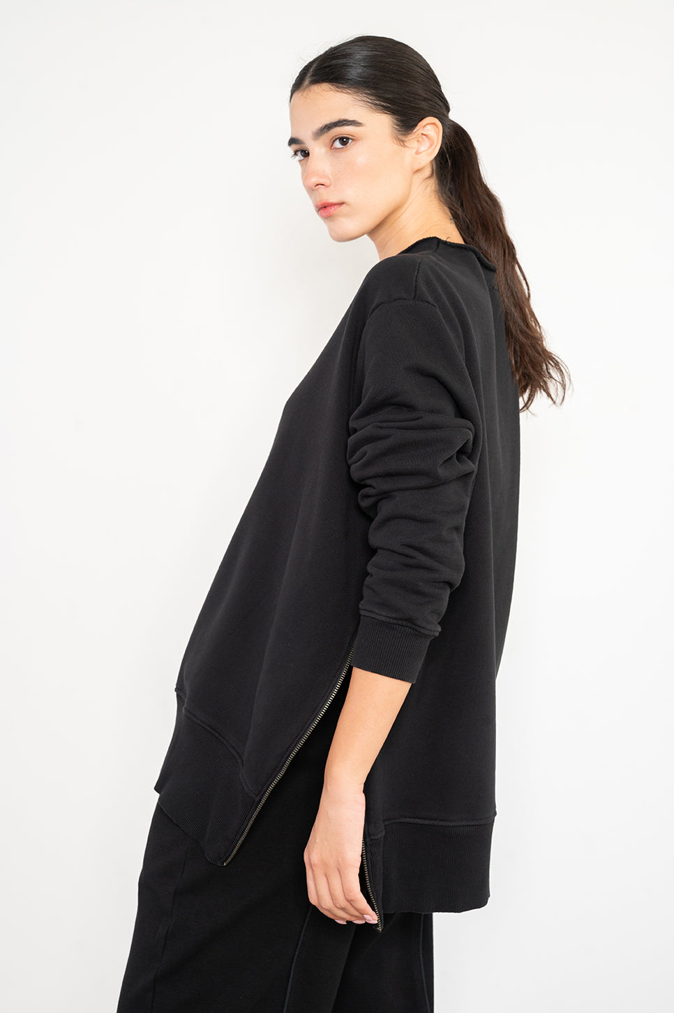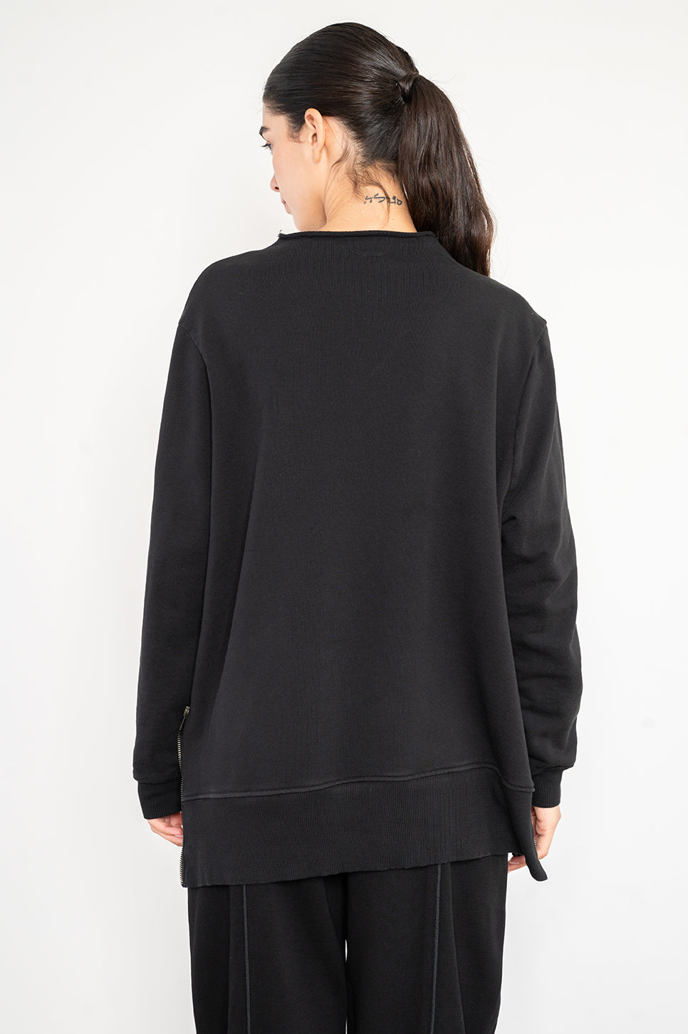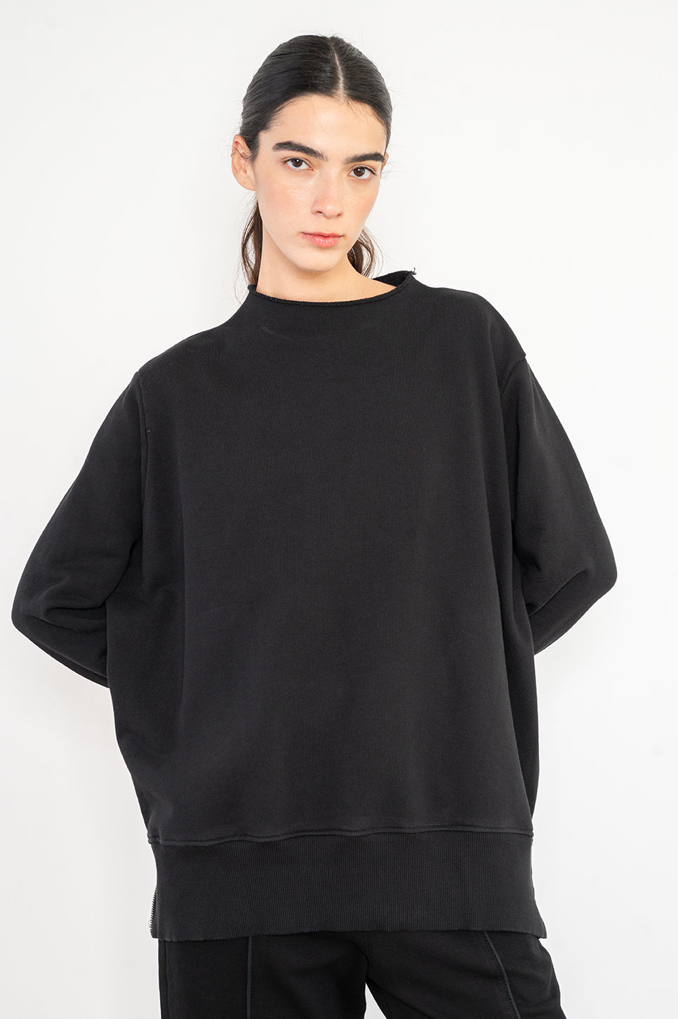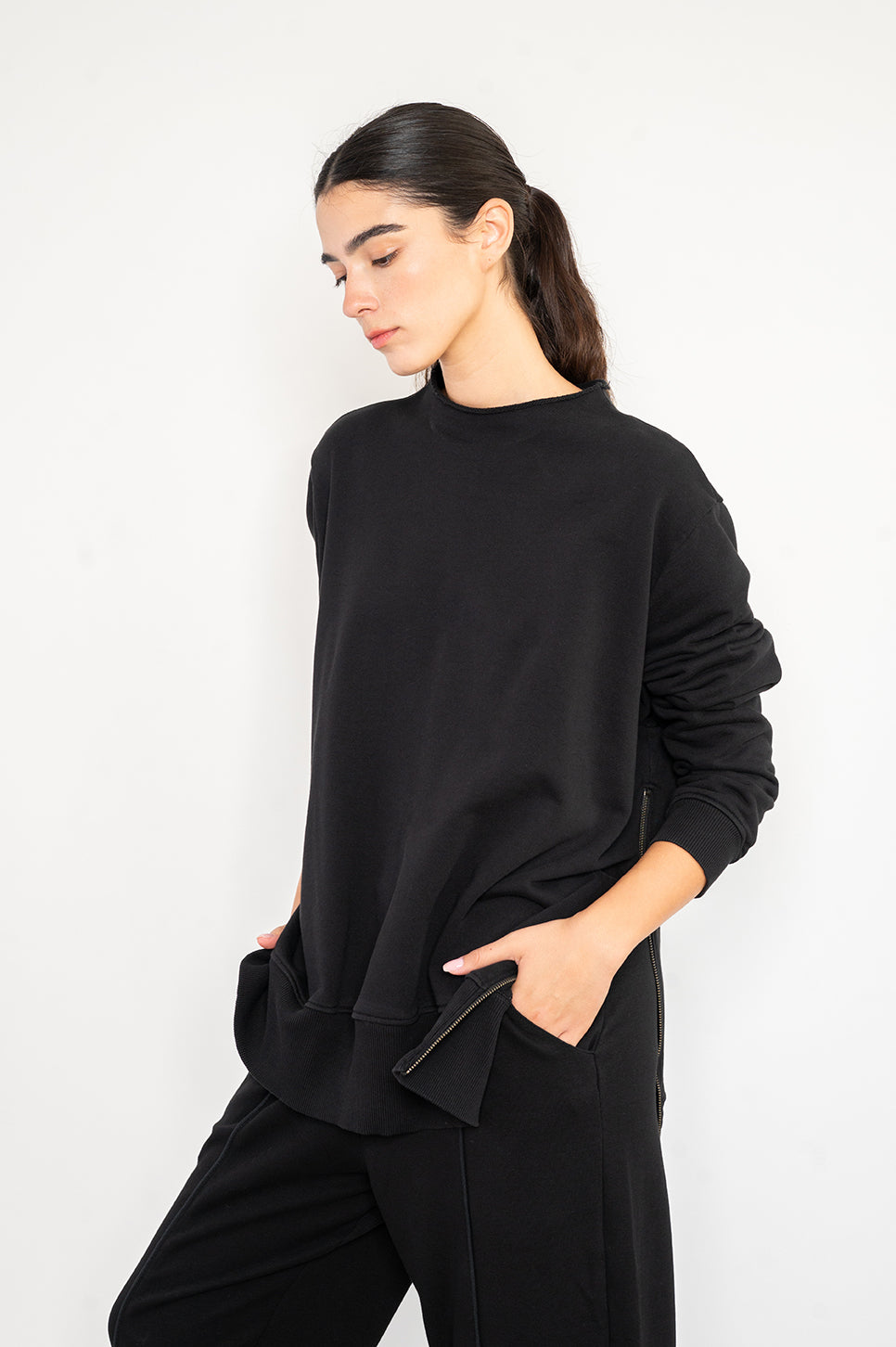 סווטשירט בגזרה ישרה עם רוכסנים בצדדים למשחק וצווארון גבוה. סיומות גוף וידיים עם מנג'ט ריב רחב ואלסטי, סיומת צווארון גזורה במראה פרום ומתגלגל.