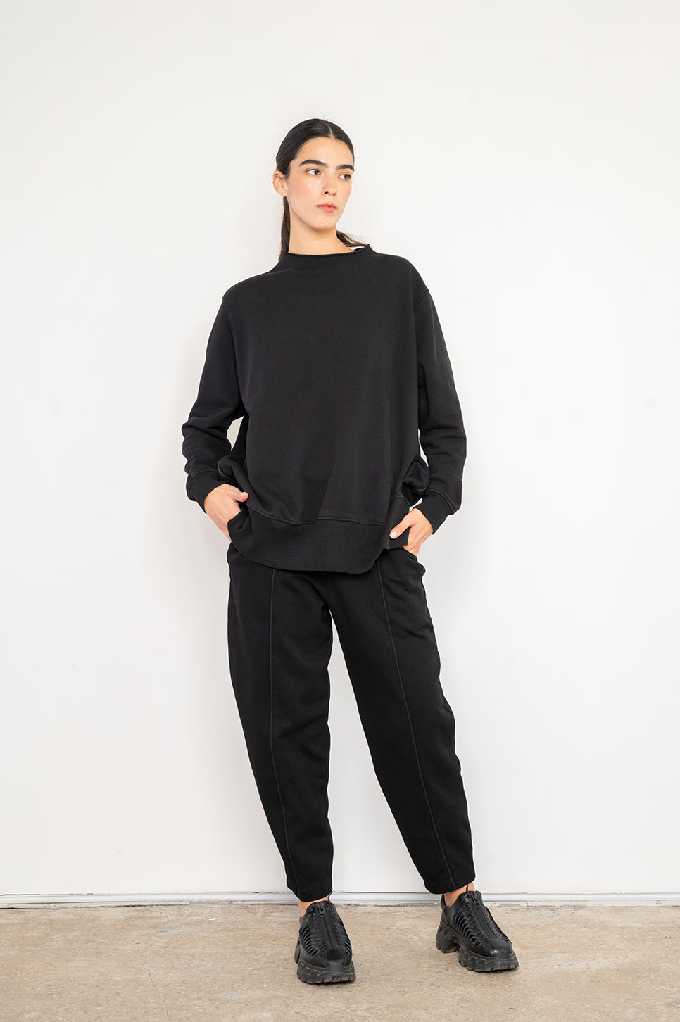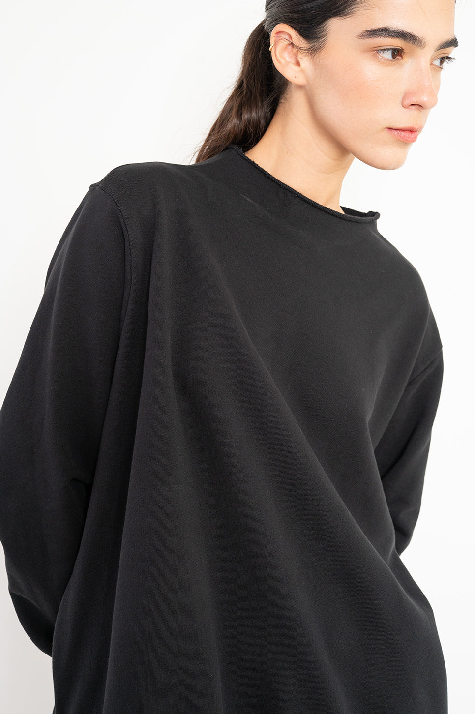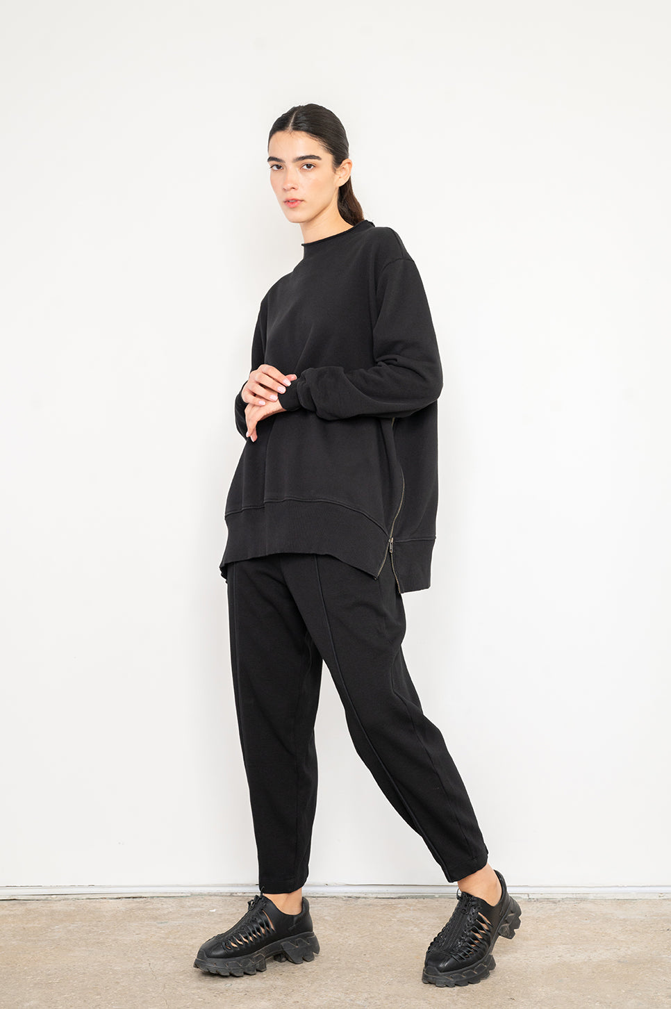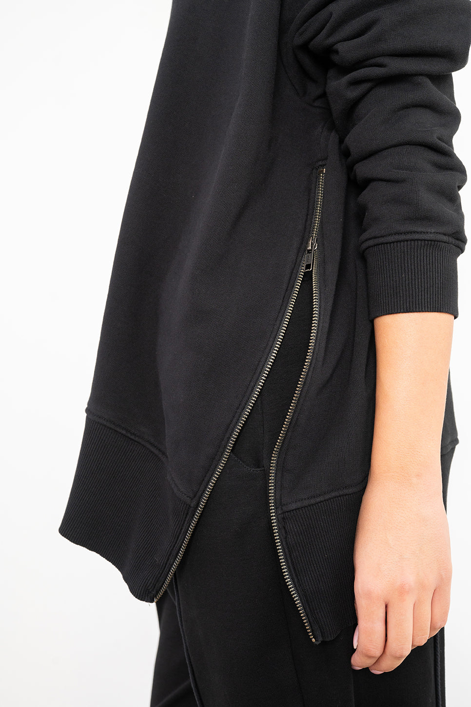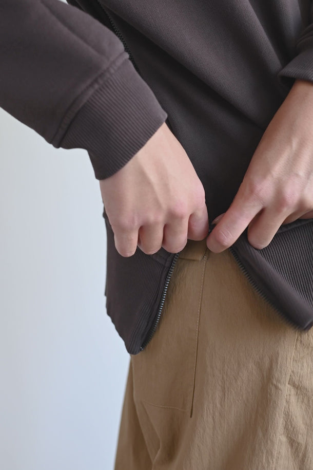 סווטשירט בגזרה ישרה עם רוכסנים בצדדים למשחק וצווארון גבוה. סיומות גוף וידיים עם מנג'ט ריב רחב ואלסטי, סיומת צווארון גזורה במראה פרום ומתגלגל.
