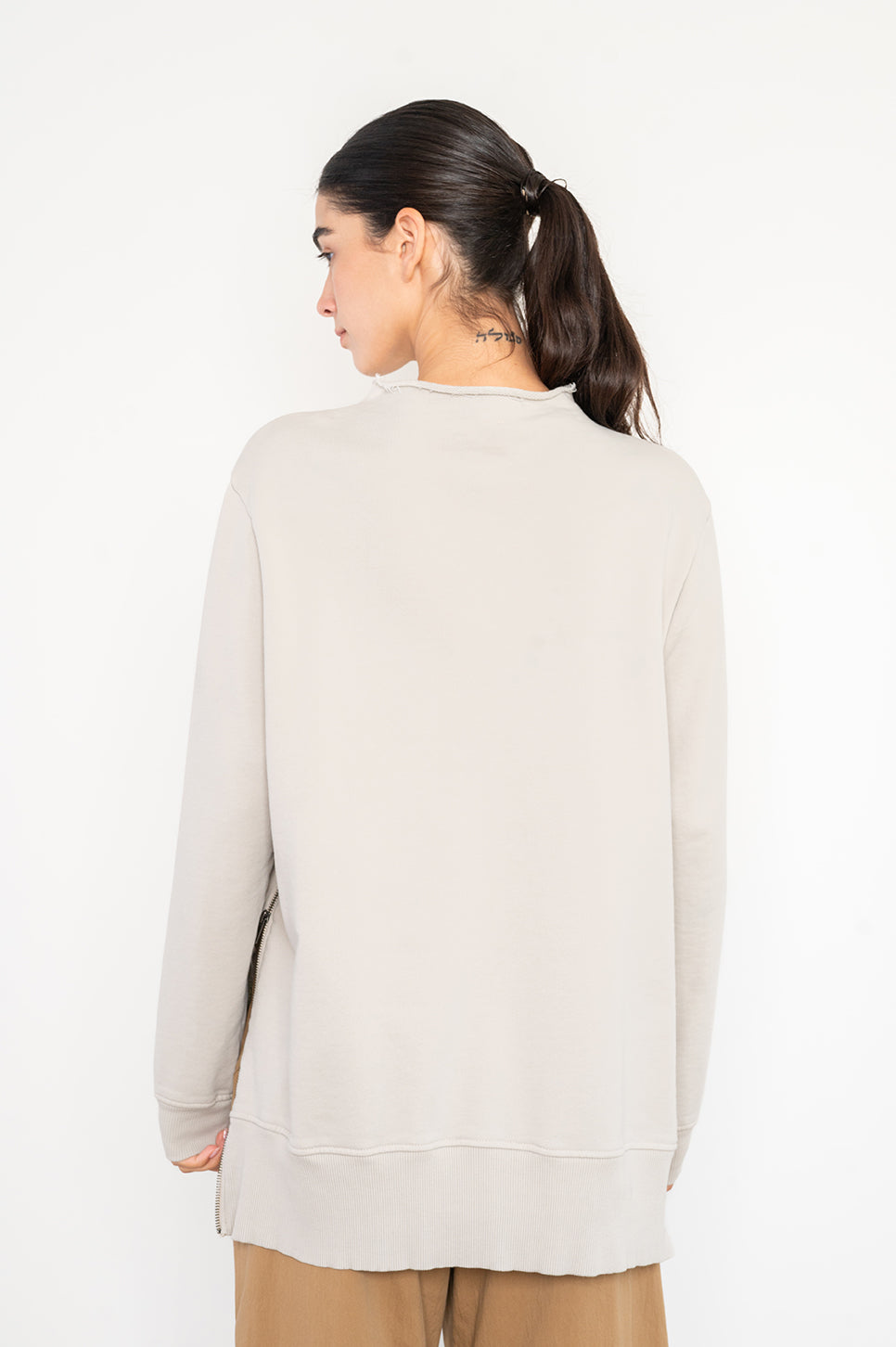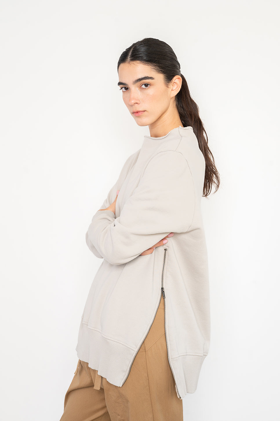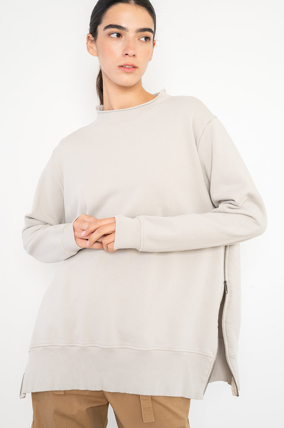 סווטשירט בגזרה ישרה עם רוכסנים בצדדים למשחק וצווארון גבוה. סיומות גוף וידיים עם מנג'ט ריב רחב ואלסטי, סיומת צווארון גזורה במראה פרום ומתגלגל.- סיון: גובה 178 ס"מ. היקפים: חזה 80 ס"מ | מותן 60 ס"מ | אגן 91 ס"מ, לובשת מידה S/M.