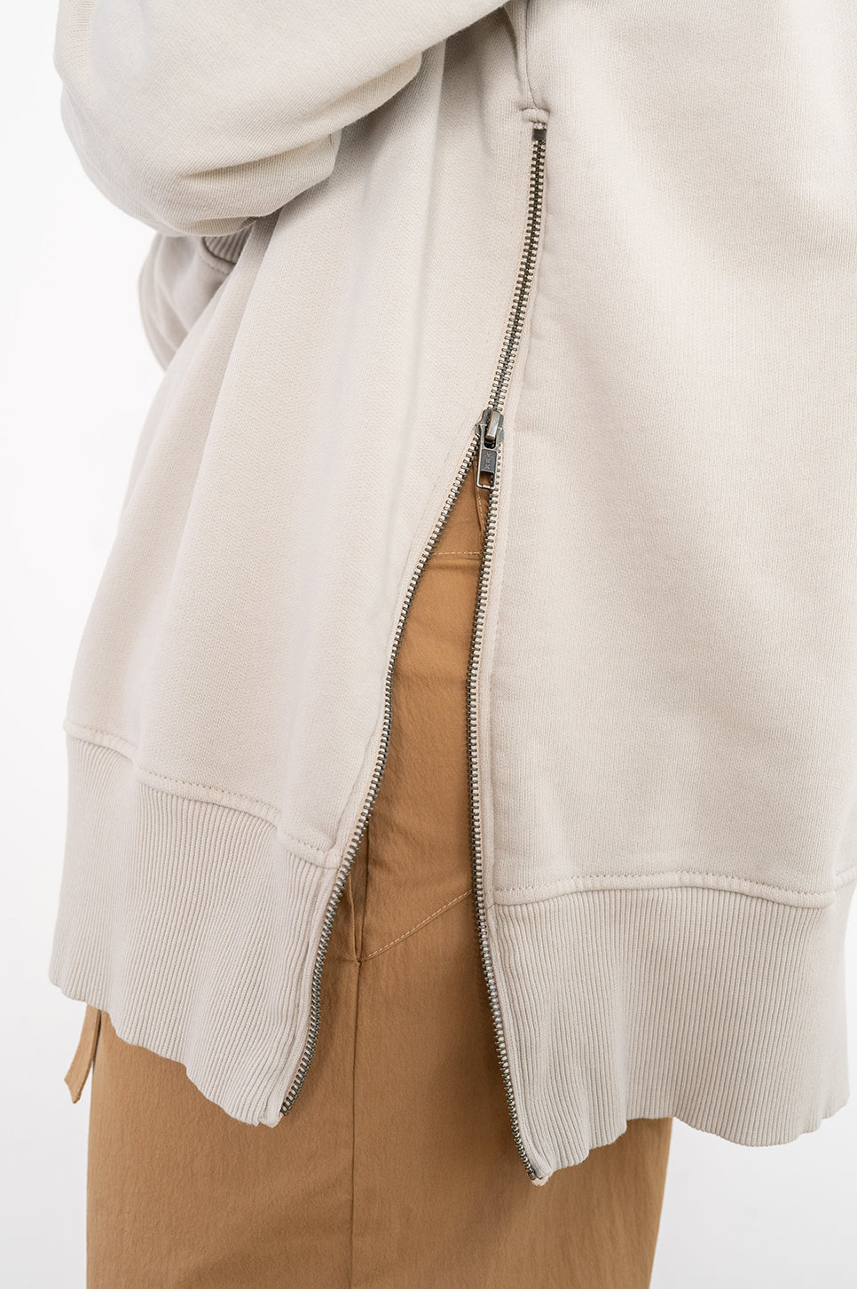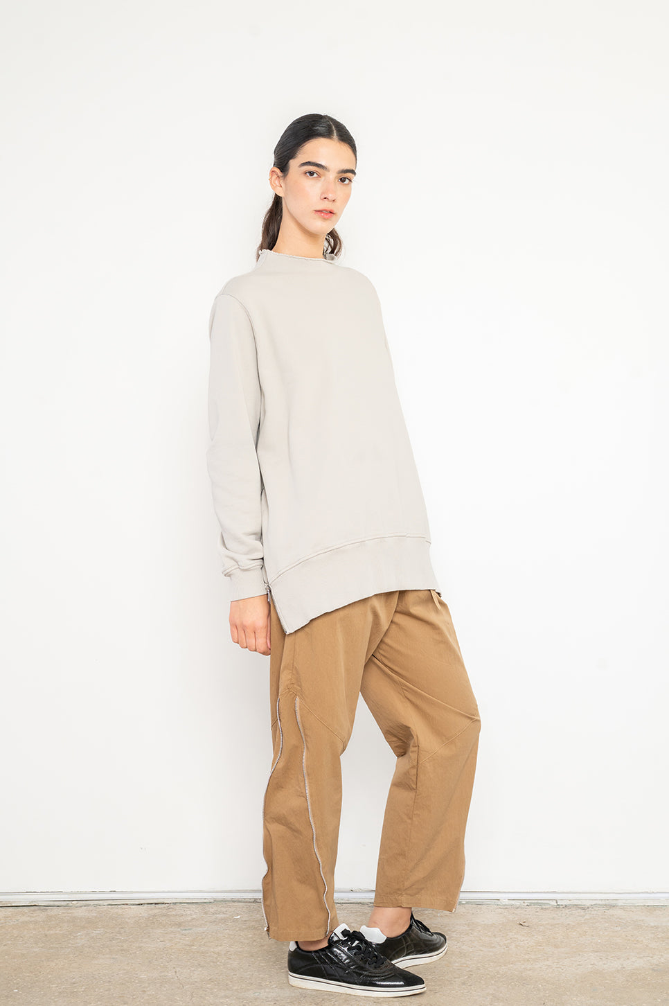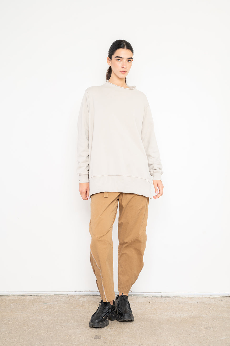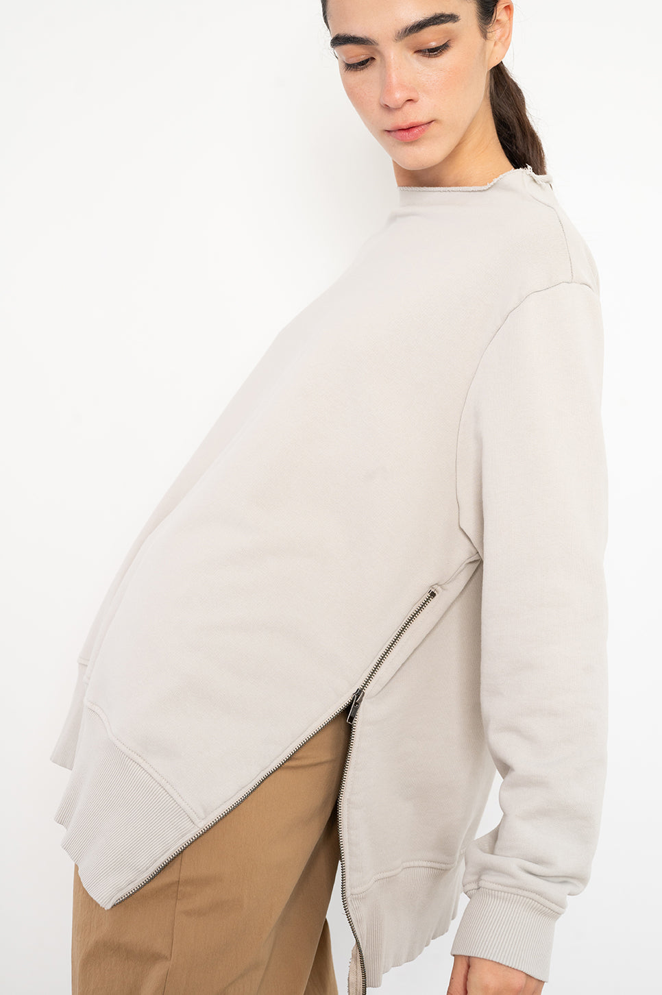 סווטשירט בגזרה ישרה עם רוכסנים בצדדים למשחק וצווארון גבוה. סיומות גוף וידיים עם מנג'ט ריב רחב ואלסטי, סיומת צווארון גזורה במראה פרום ומתגלגל.- סיון: גובה 178 ס"מ. היקפים: חזה 80 ס"מ | מותן 60 ס"מ | אגן 91 ס"מ, לובשת מידה S/M.