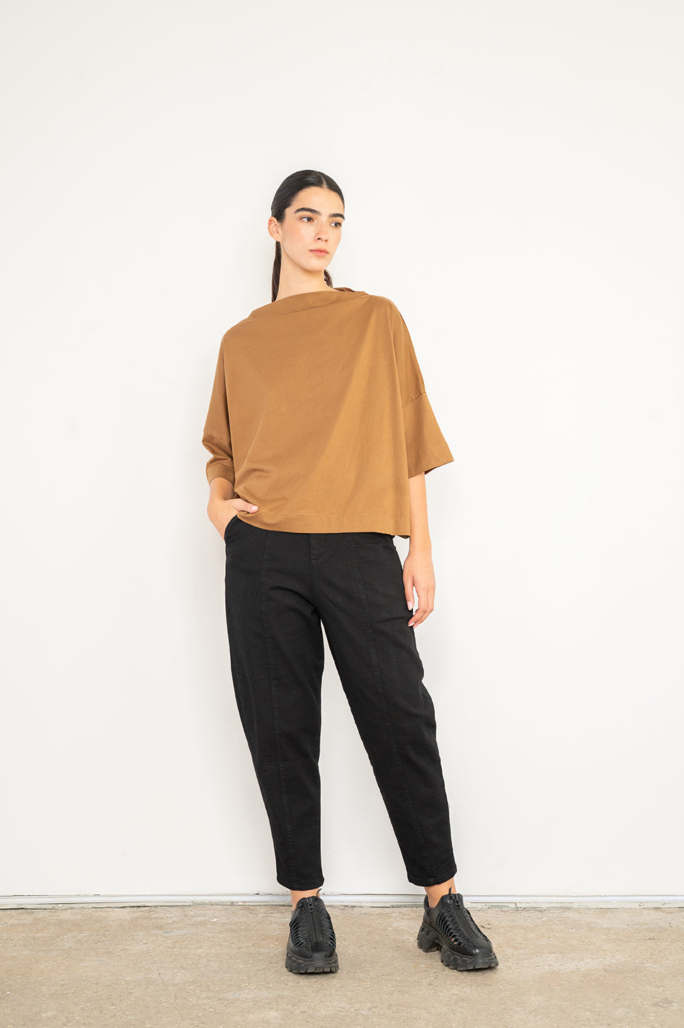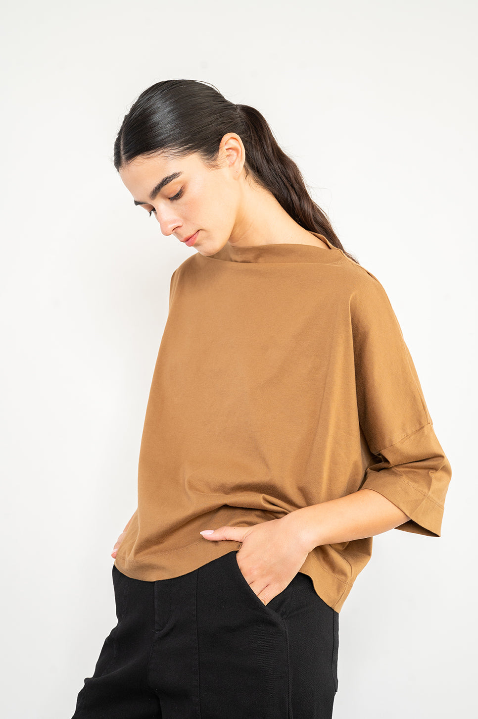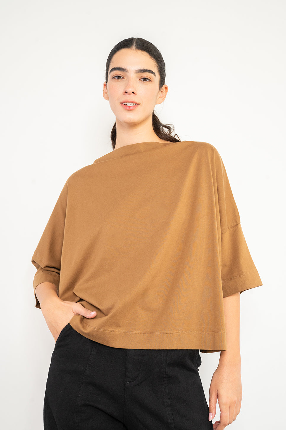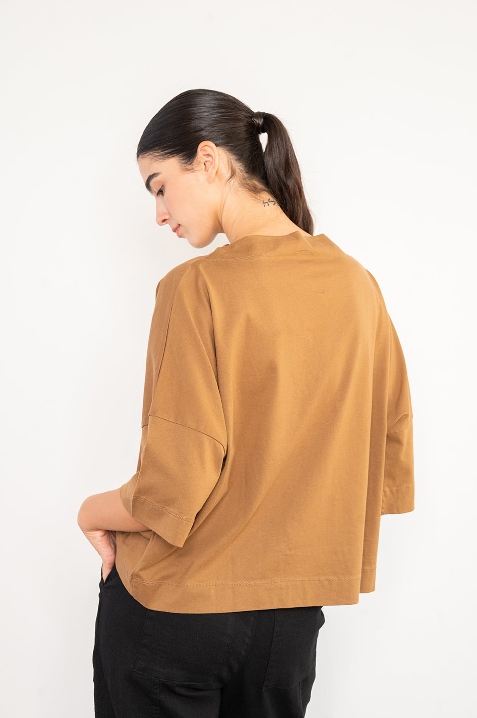 חולצת טי קצרה בגזרה ישרה ורחוקה מהגוף, בעלת צווארון במפתח סירה ושרוולי 3/4. עשויה בד סריג רך ונעים ומתאימה לכל עונה.- סומי: גובה 172 ס"מ. היקפים: חזה 82 ס"מ I מותן 61 ס"מ I אגן 88 ס"מ, לובשת מידה OS.