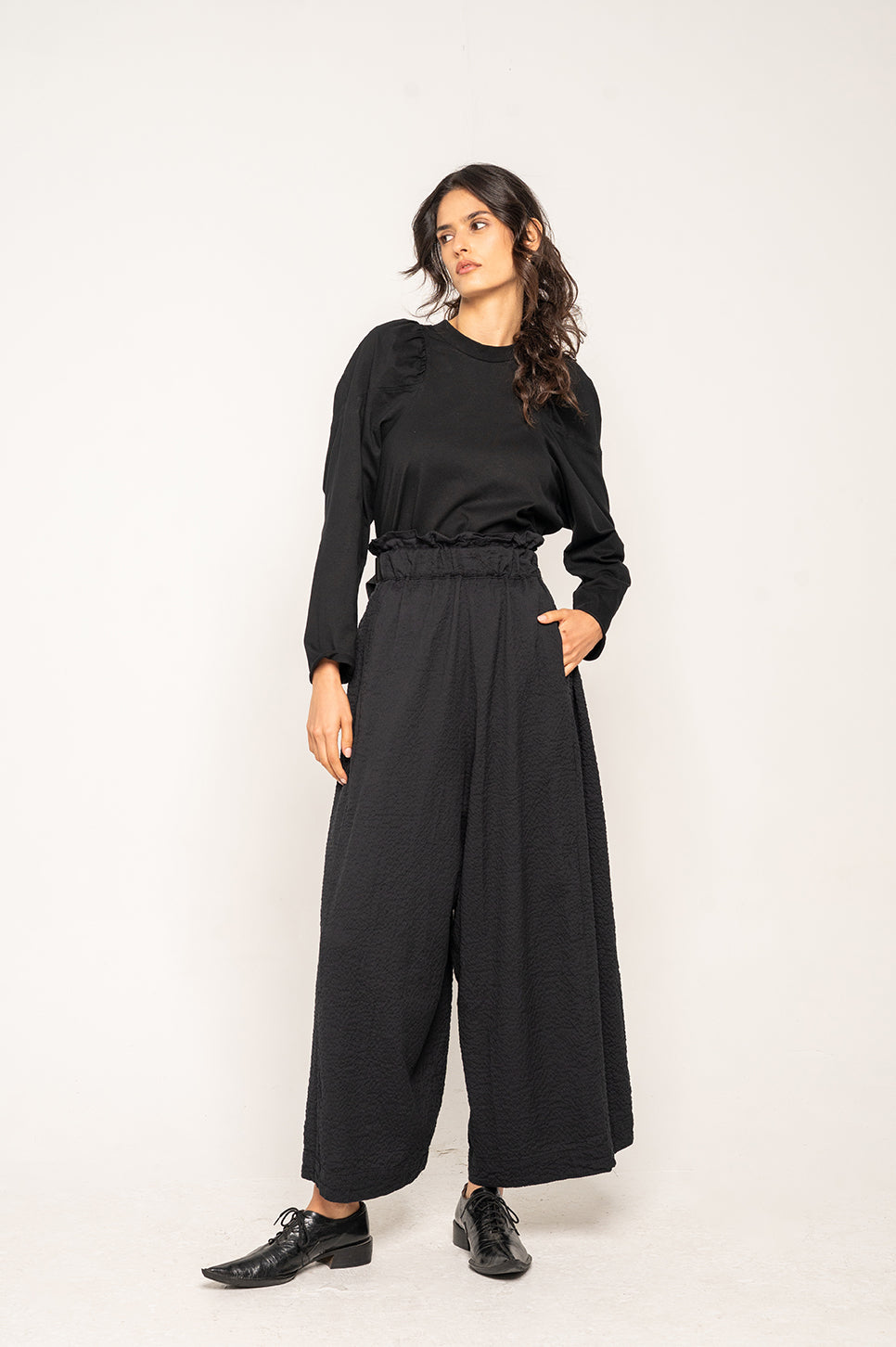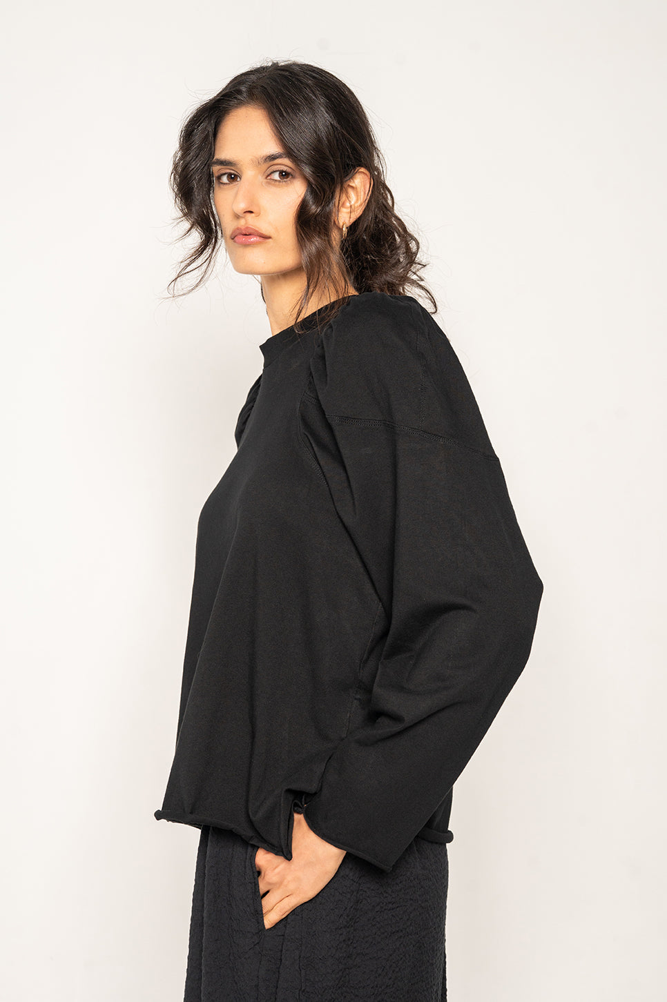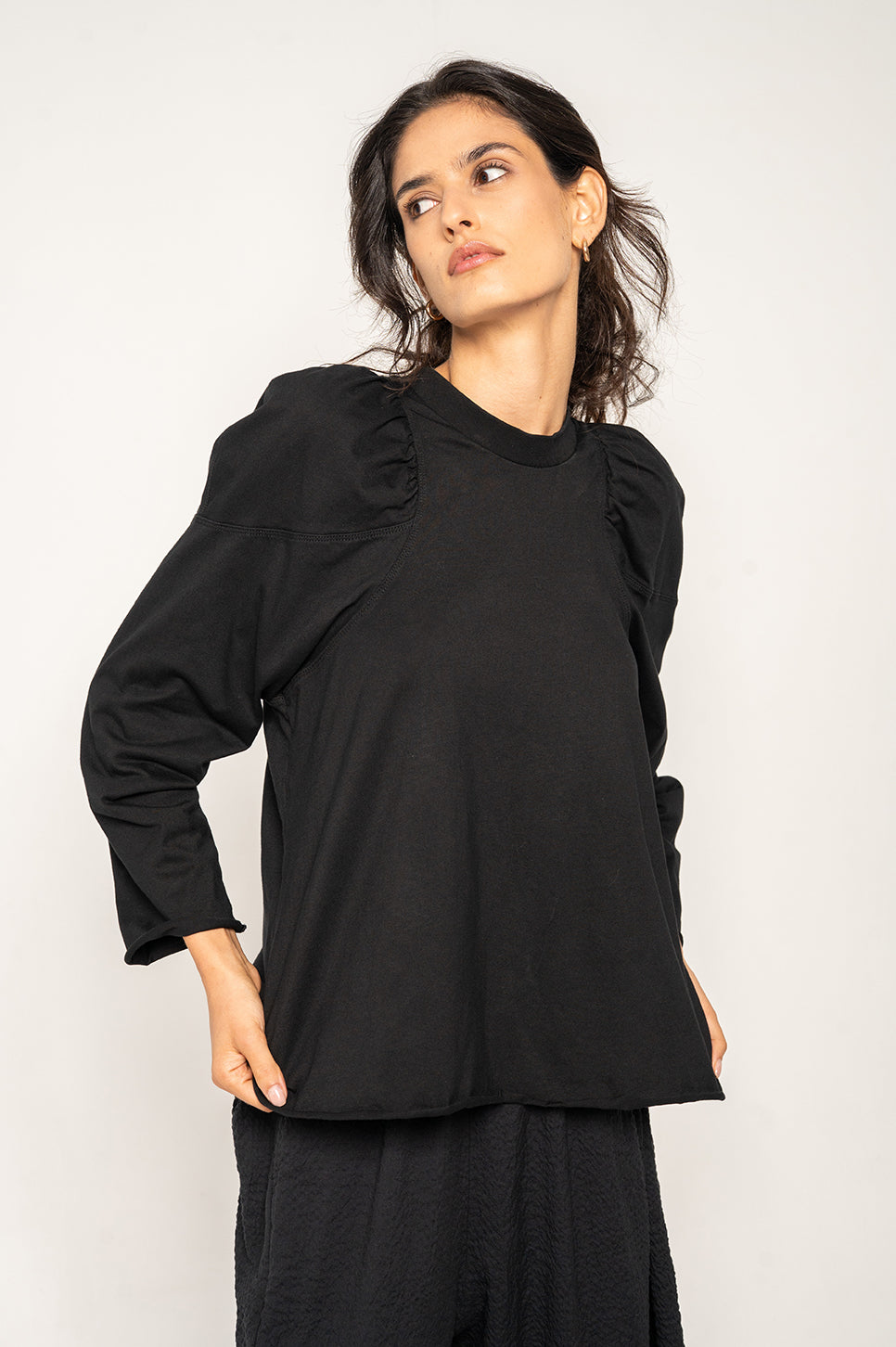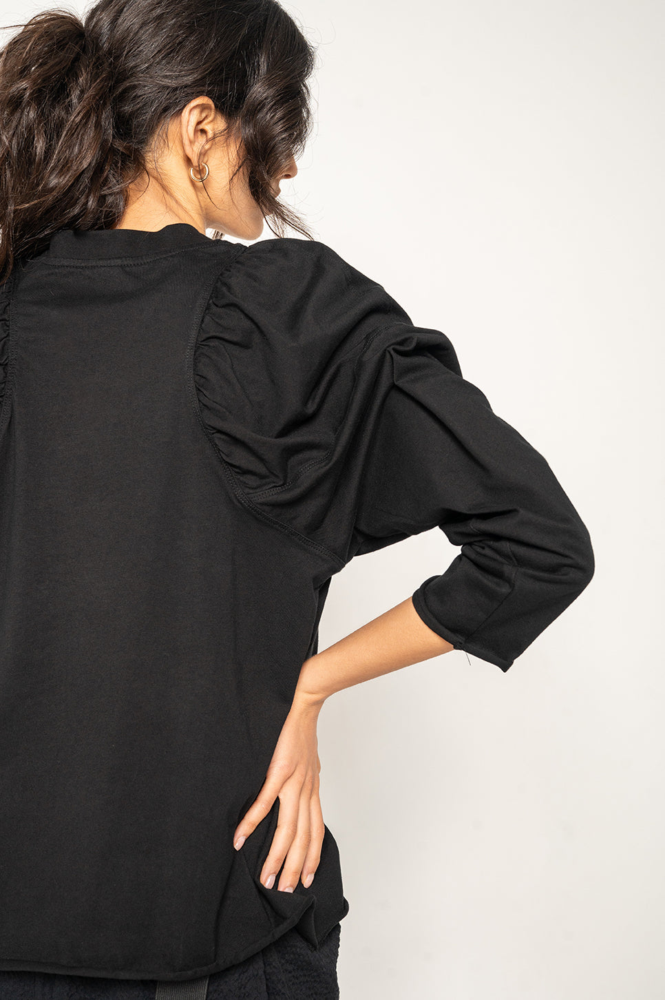 חולצת טריקו עם נוכחות. בעלת שרוולים נפוחים וארוכים, בגזרה ישרה וקרובה לגוף. עם מפתח צוואר עגול וצר, עשויה בד סריג כותנה אלסטי.- אבישג: גובה 176 ס"מ | היקפים: חזה 76 ס"מ | מותן 62 ס"מ | אגן 86 ס"מ, לובשת מידה 0.