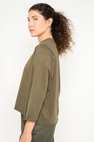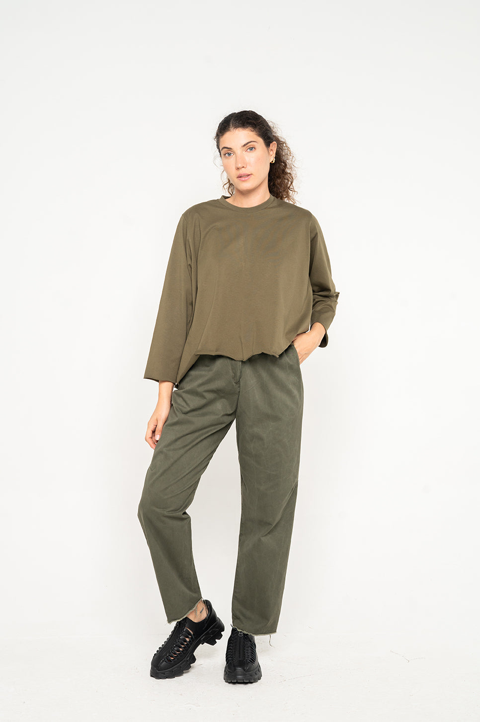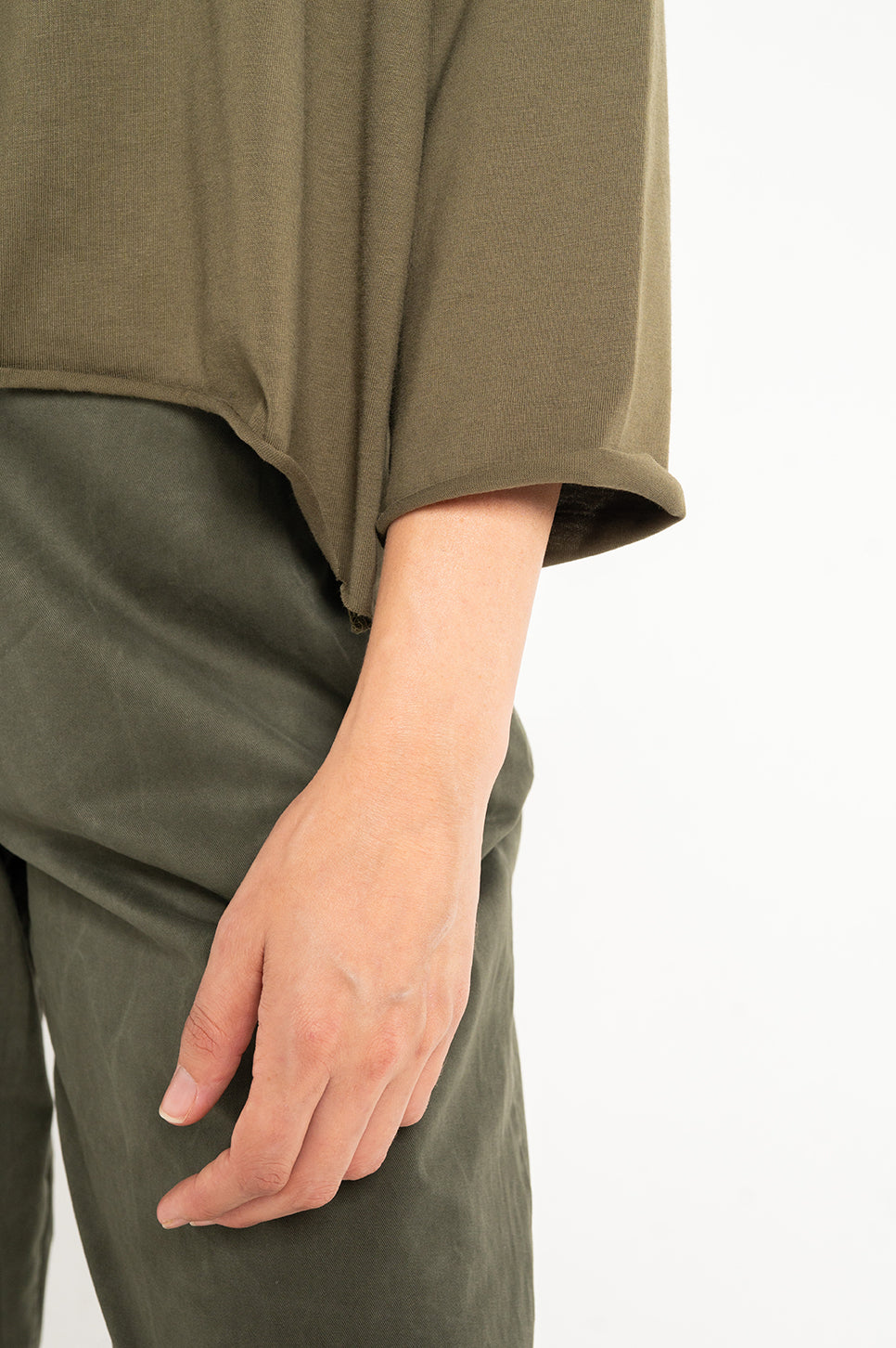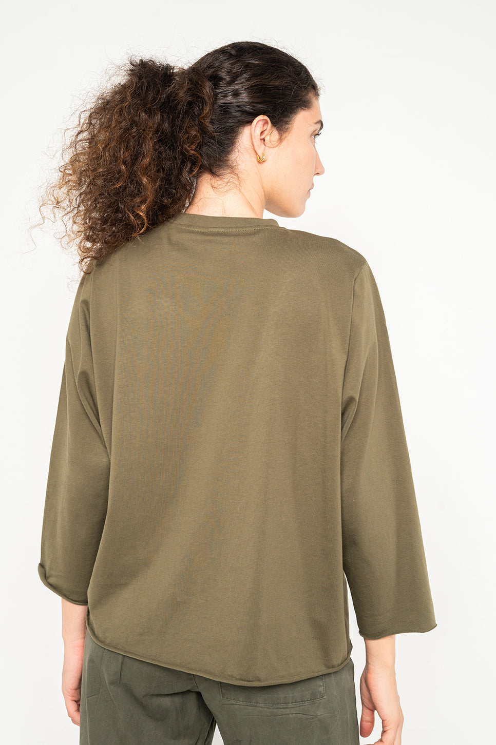טישירט בגזרה בוקסית קצרה וישרה עם שרוולי 3/4. בעלת מפתח צוואר עגול וסגור וסיומות גוף וידיים גזורות ומתגלגלות.- יובל: גובה 170 ס"מ | היקפים: חזה 86 ס"מ | מותן 65 ס"מ | אגן 95 ס"מ, לובשת מידה S/M.
