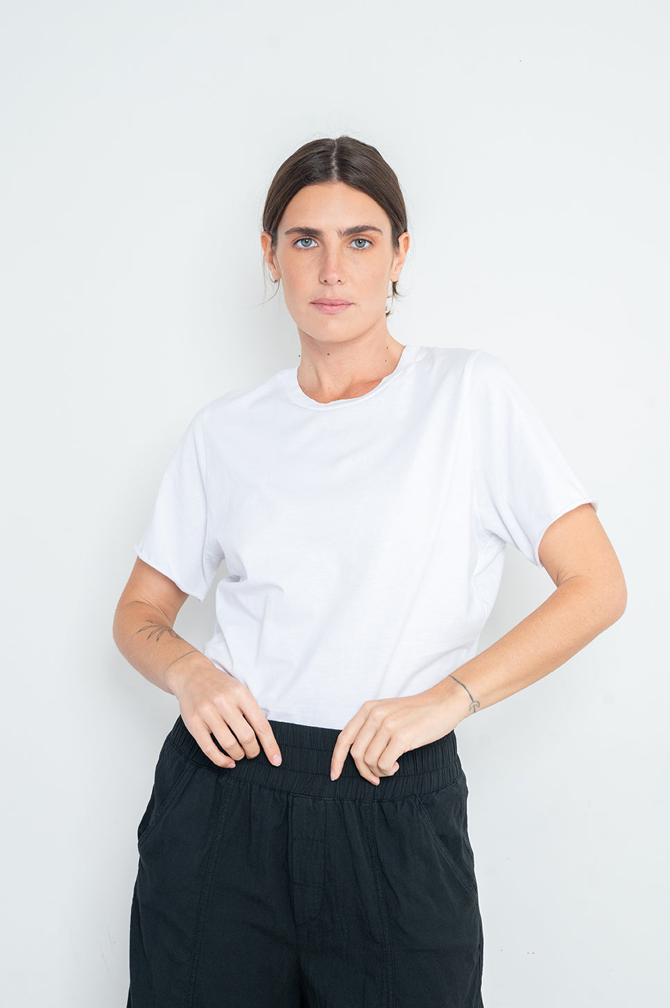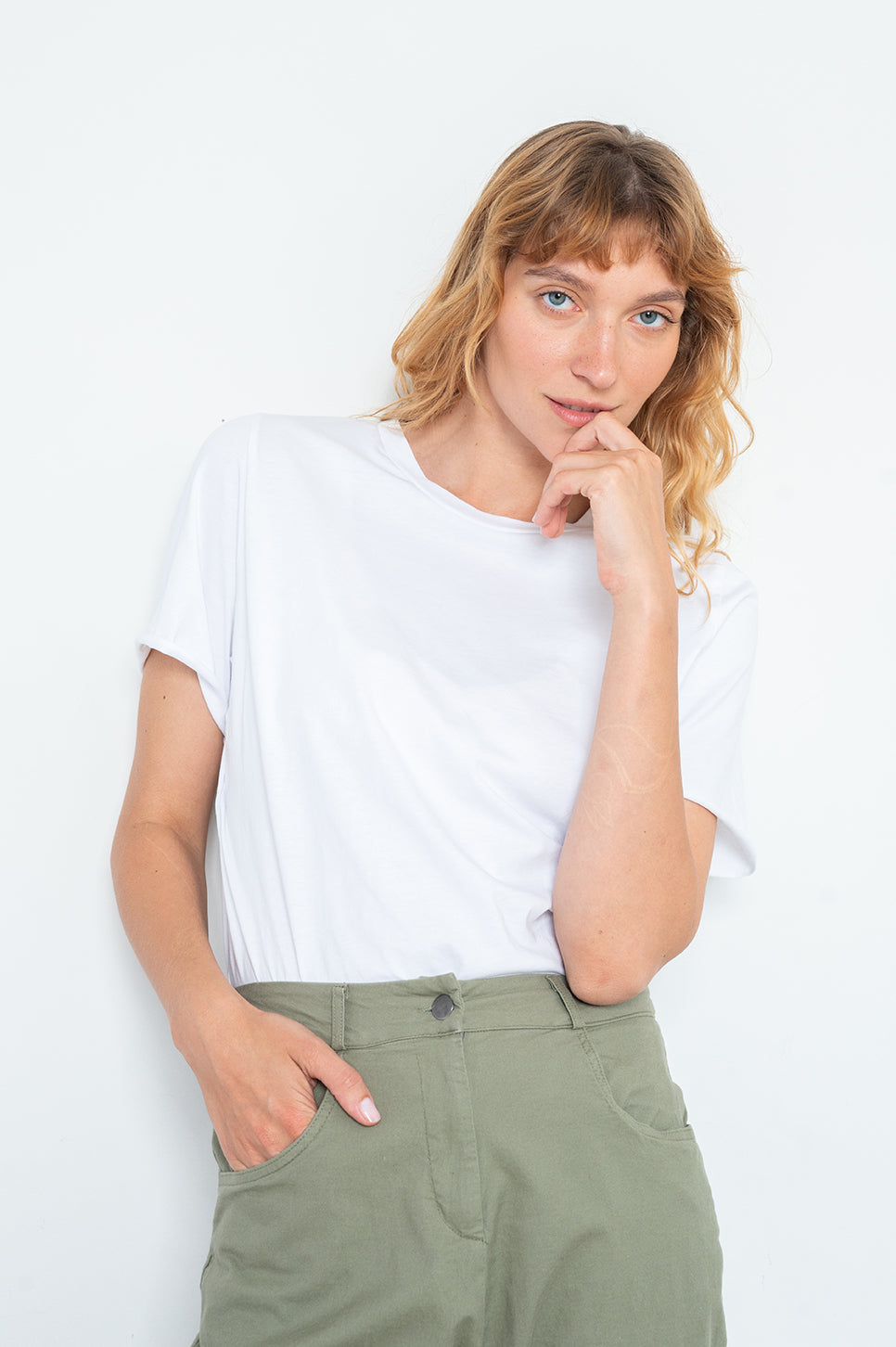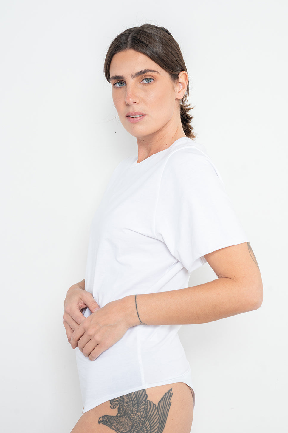 טישירט שהיא בגד גוף, כזאת שנשארת תמיד בתוך המכנסיים. עשוי בד כותנה משוחרר ונעים, עם סגירת טיקטק נוחה. בעל שרוולים קצרים עם סיומת גזורה וצווארון ריב עגול.- אנה: גובה 178 ס"מ. היקפים: חזה 88 ס"מ | מותן 70 ס"מ | אגן 88 ס"מ, לובשת מידה 1.