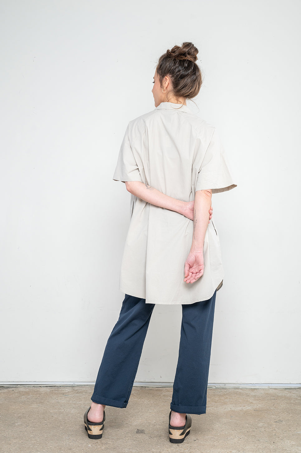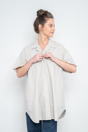 חולצה מכופתרת עם שרוולים קצרים וצווארון קלאסי מחוייט, עשויה בד כותנה טבעי. בעלת כפתרה נסתרת בחזית ותיפורי עיטור בכתף. גזרה ארוכה ומשוחררת, בעלת שני כיסי צד.