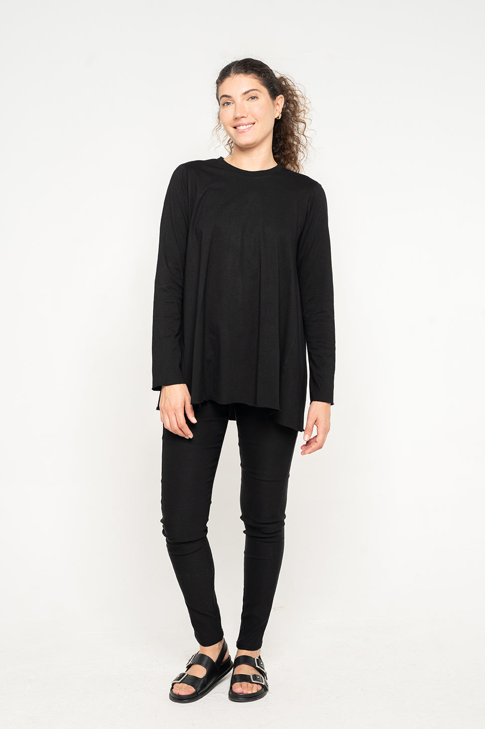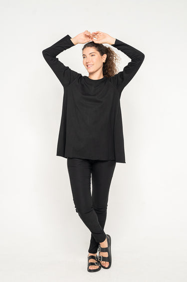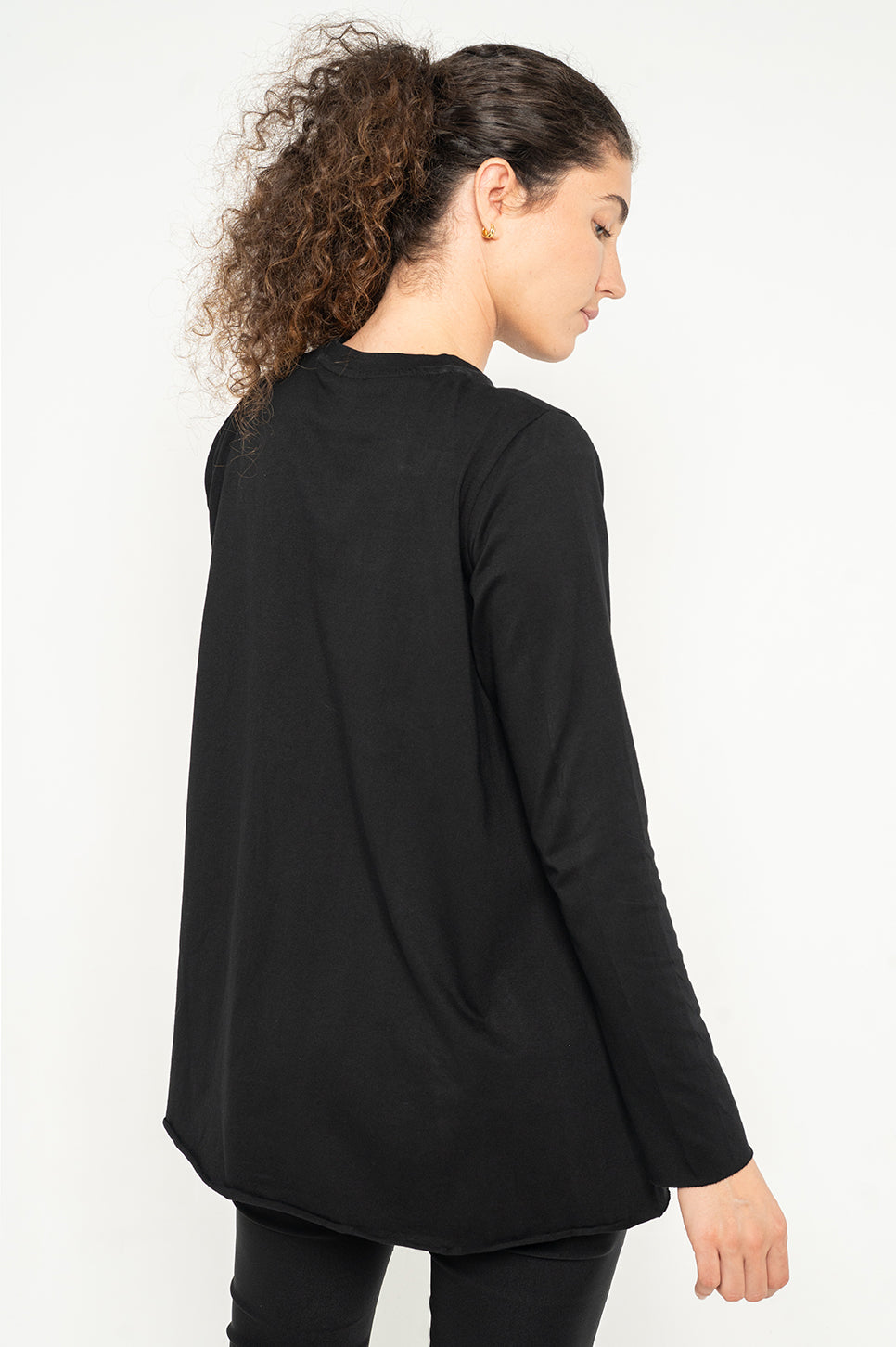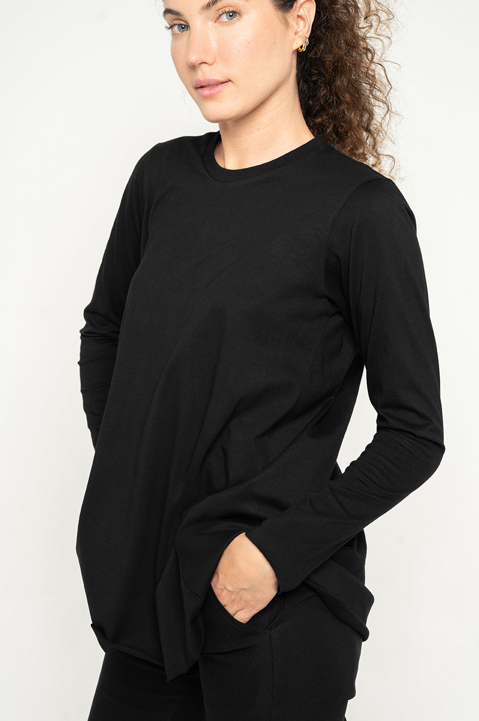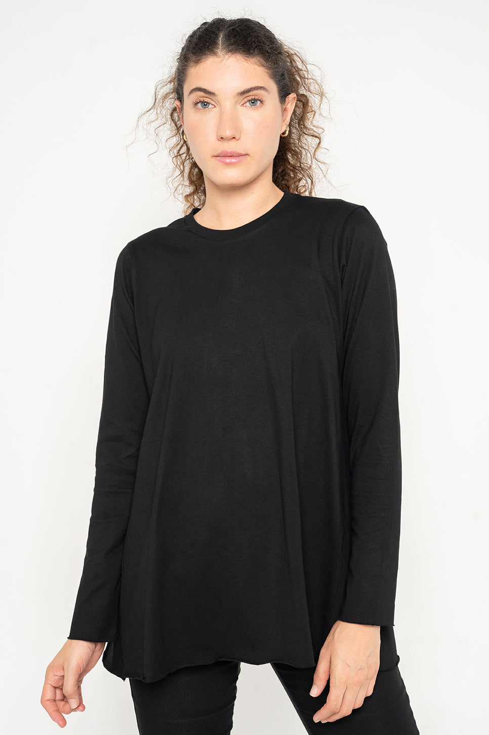 טישירט קלאסית בגזרת A מתרחבת עם שרוולים ארוכים וצמודים. עם סיומות גוף ושרוולים גזורות ומתגלגלות. עשויה בד טריקו כותנה דק ונעים.