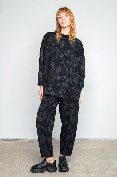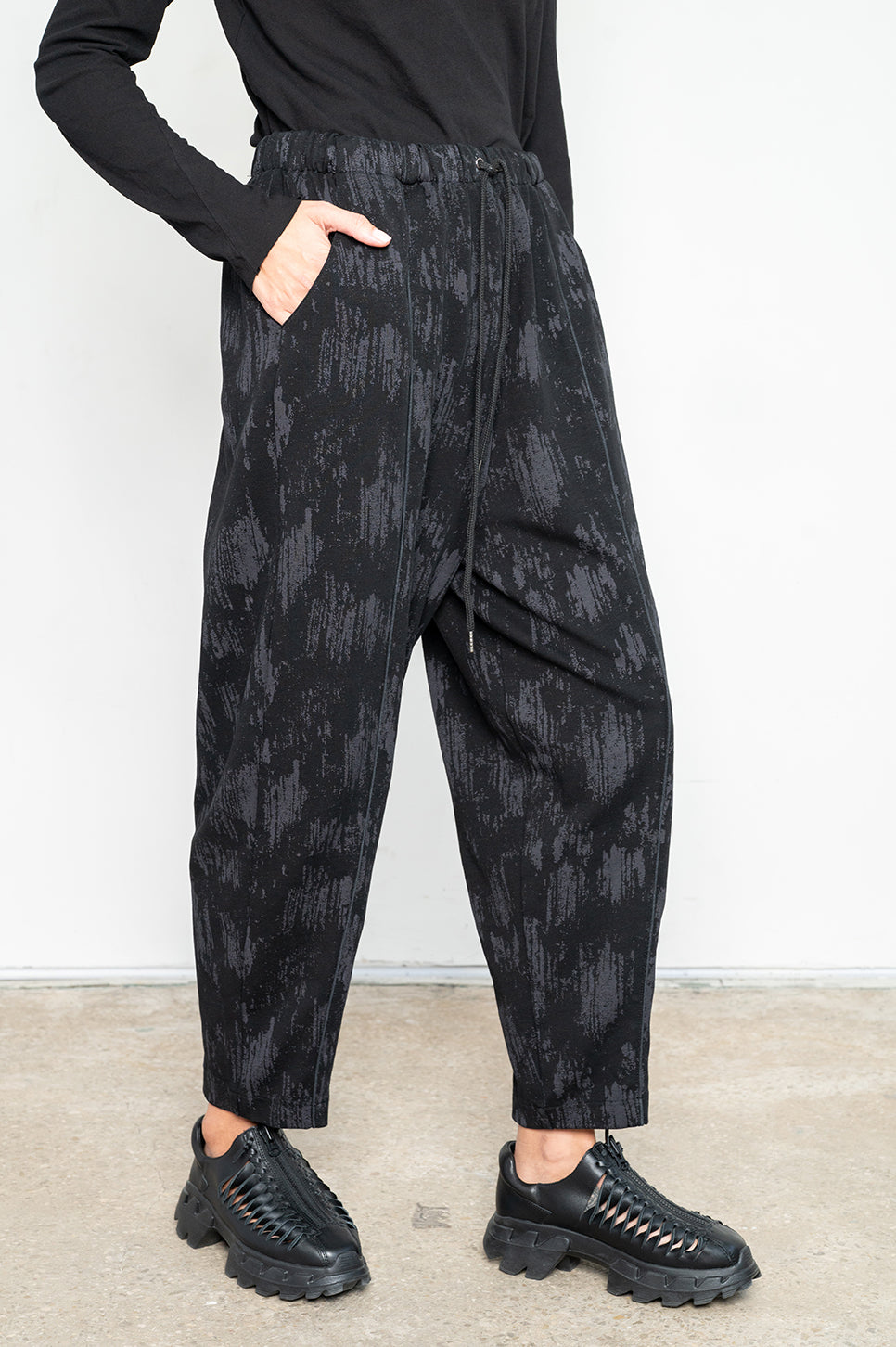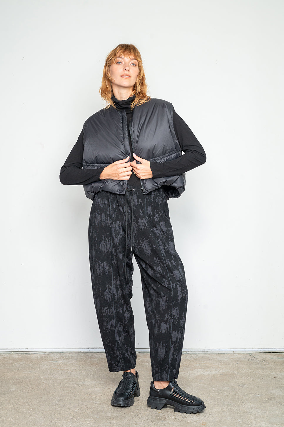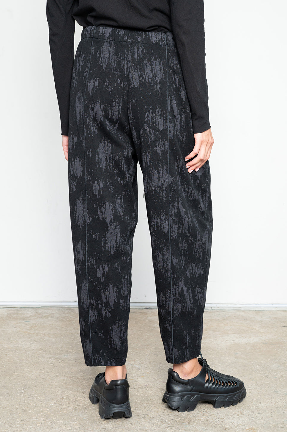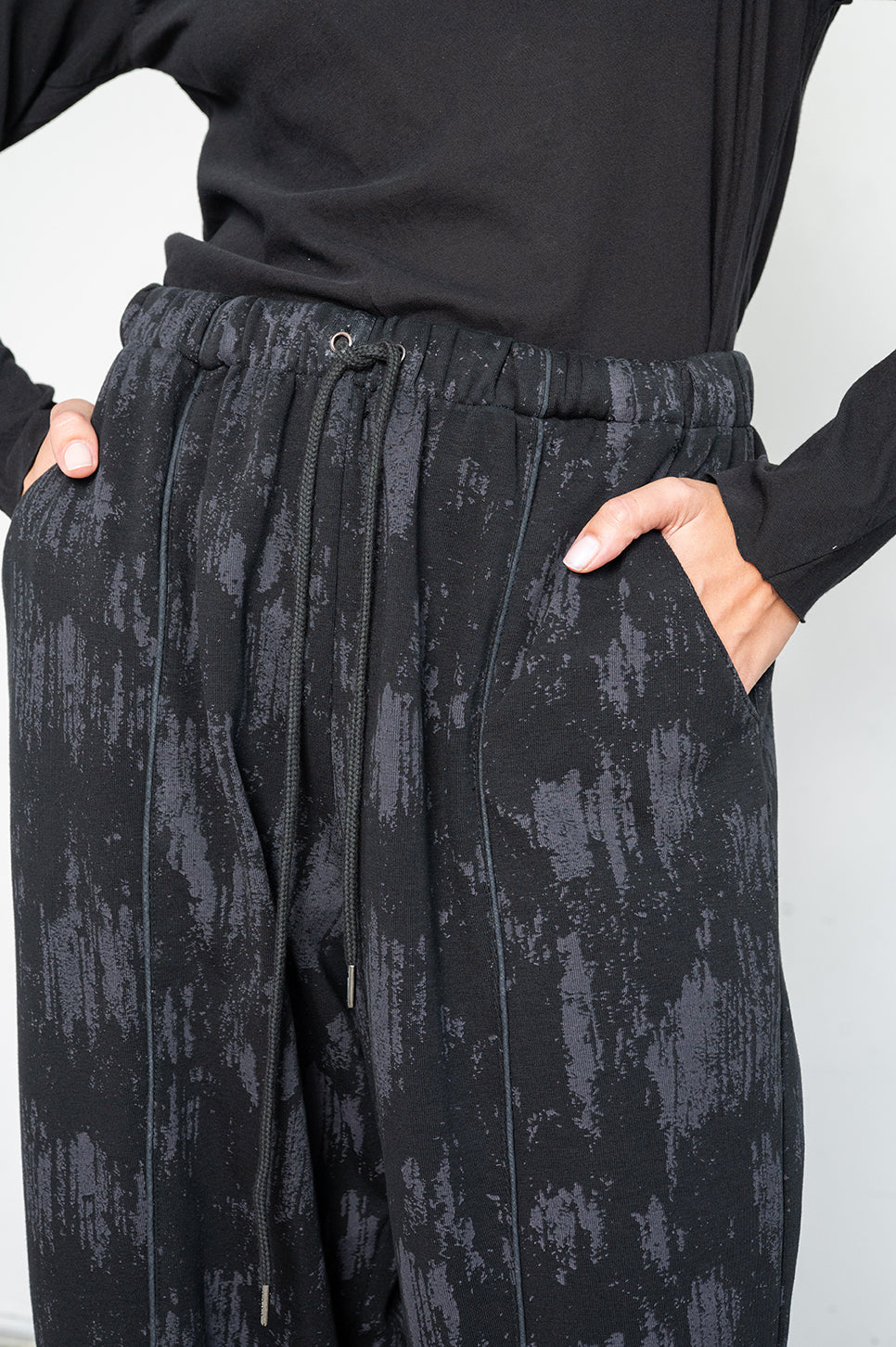 מכנסיי טרנינג בגזרת "בלון" - משוחררים באגן וברגליים ונאספים בקרסוליים. עם חגורת גומי, שרוך להידוק וקשירה ושני כיסי צד. תפר בולט עובר לאורך חזית וגב הרגל.- אנה: גובה 178 ס"מ. היקפים: חזה 88 ס"מ | מותן 70 ס"מ | אגן 88 ס"מ, לובשת מידה 2.
