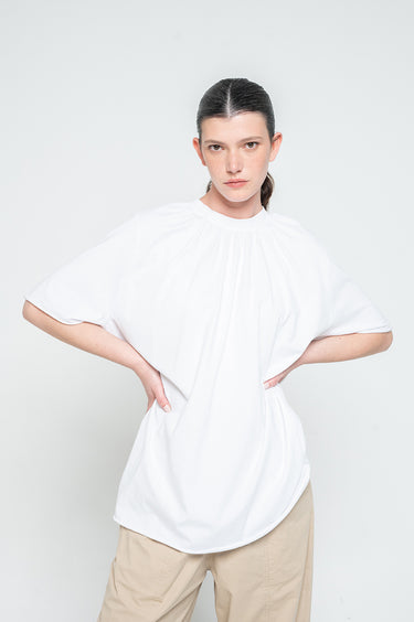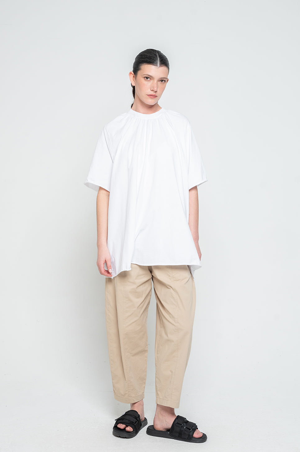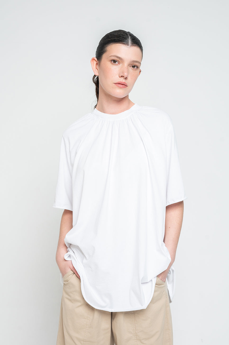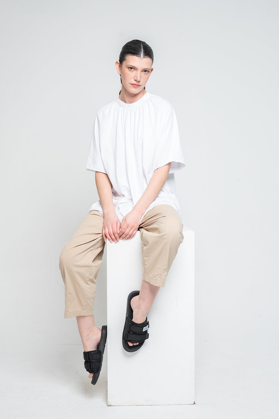 חולצת אוברסייז קצרה בגזרה ישרה עם כיווצים סביב הצוואר המעניקים לה מראה ייחודי. בעלת מפתח צוואר עגול וגמיש עם סיומת ריב דק, סיומות גוף ושרוולים גזורות.- אווה: גובה 172 ס"מ. היקפים: חזה 84 ס"מ I מותן 63 ס"מ I אגן 90 ס"מ, לובשת מידה OS. סיון: גובה 178 ס"מ. היקפים: חזה 80 ס"מ | מותן 60 ס"מ | אגן 91 ס"מ, לובשת מידה OS.