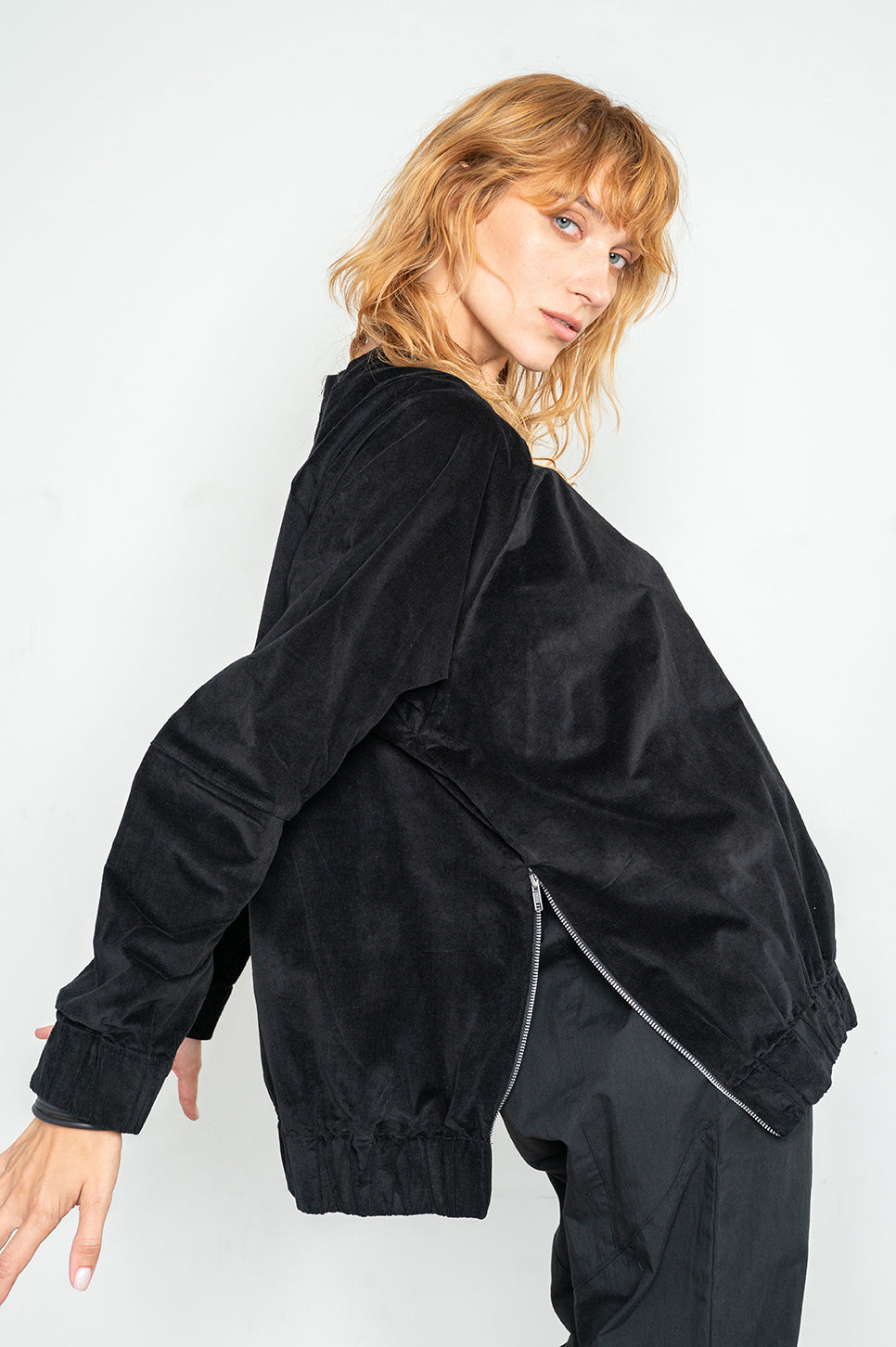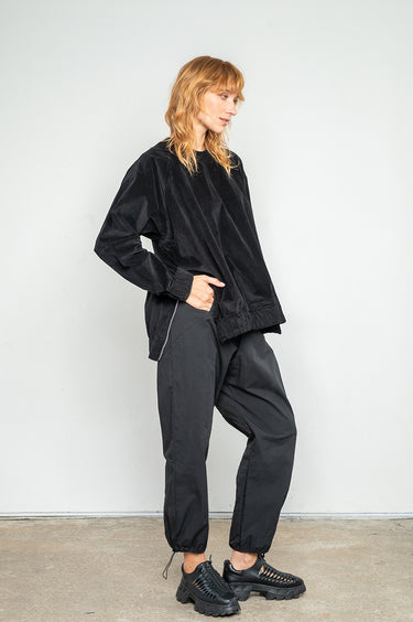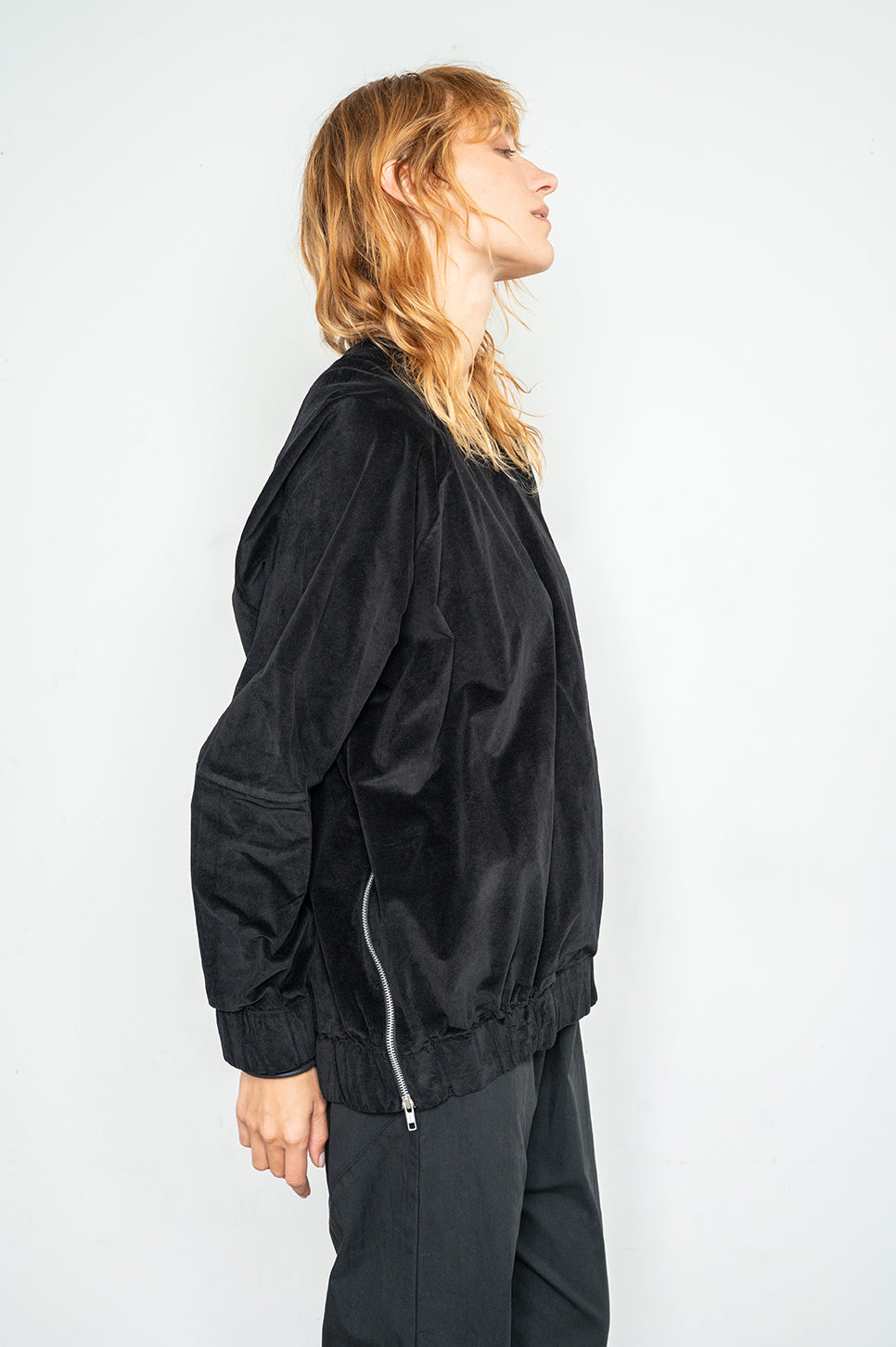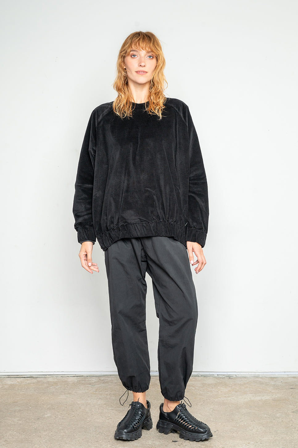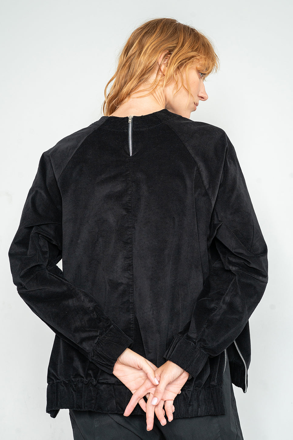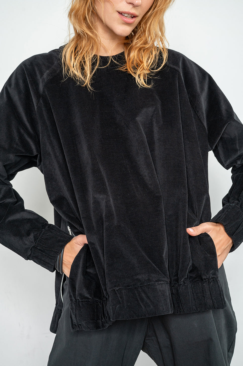 סווטשירט מבד אריג קטיפה בגזרת אוברסייז ישרה עם שרוולי רגלן. שני רוכסני מתכת קצרים בצידי הגוף מאפשרים משחק עם הגזרה, ורוכסן קצר בעורף משמש לכניסה קלה. עם סיומת מנג'ט גומי בשרוולים ובגוף. אנה: גובה 178 ס"מ. היקפים: חזה 88 ס"מ | מותן 70 ס"מ | אגן 88 ס"מ, לובשת מידה S/M.הרכב בד