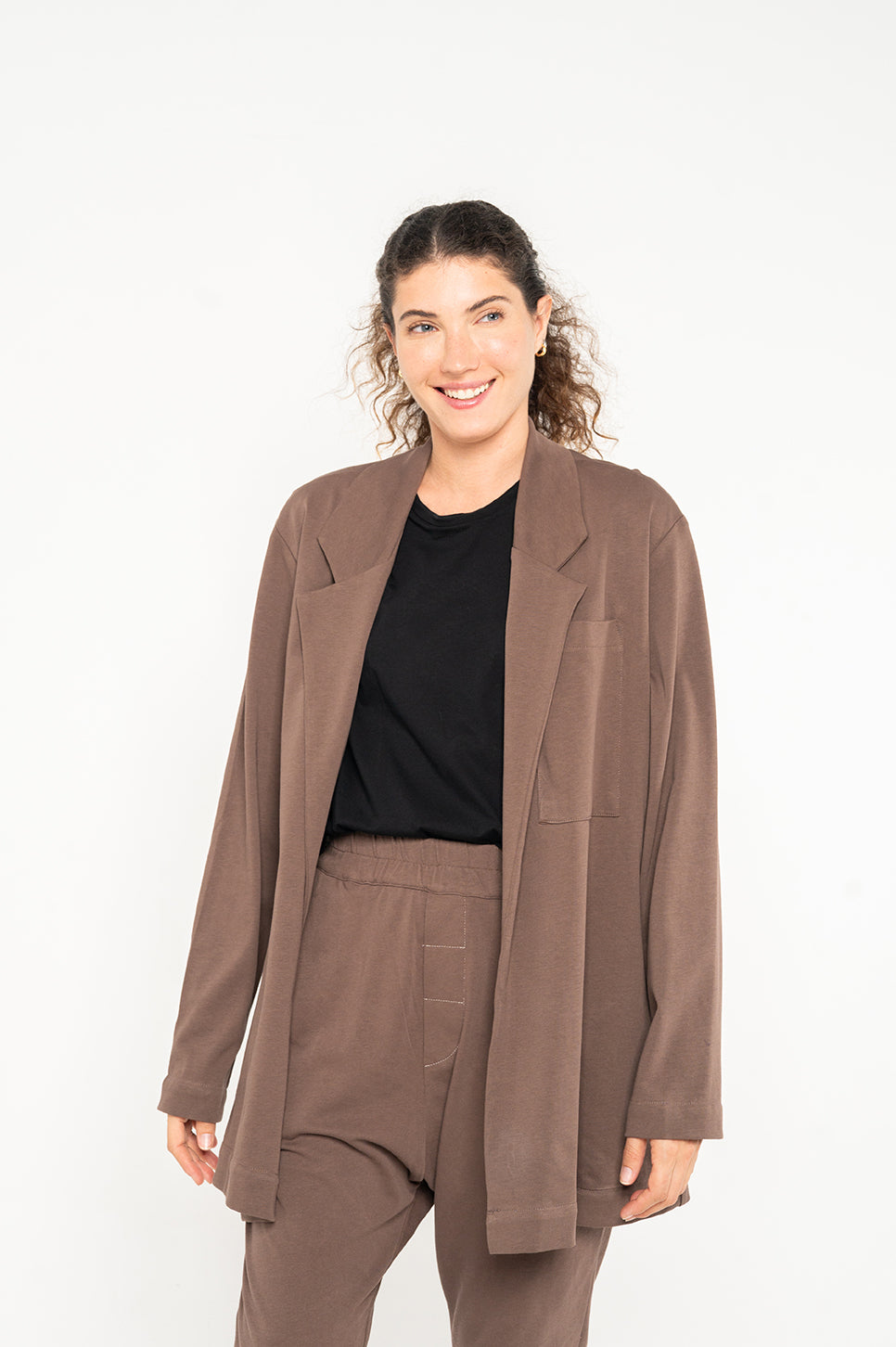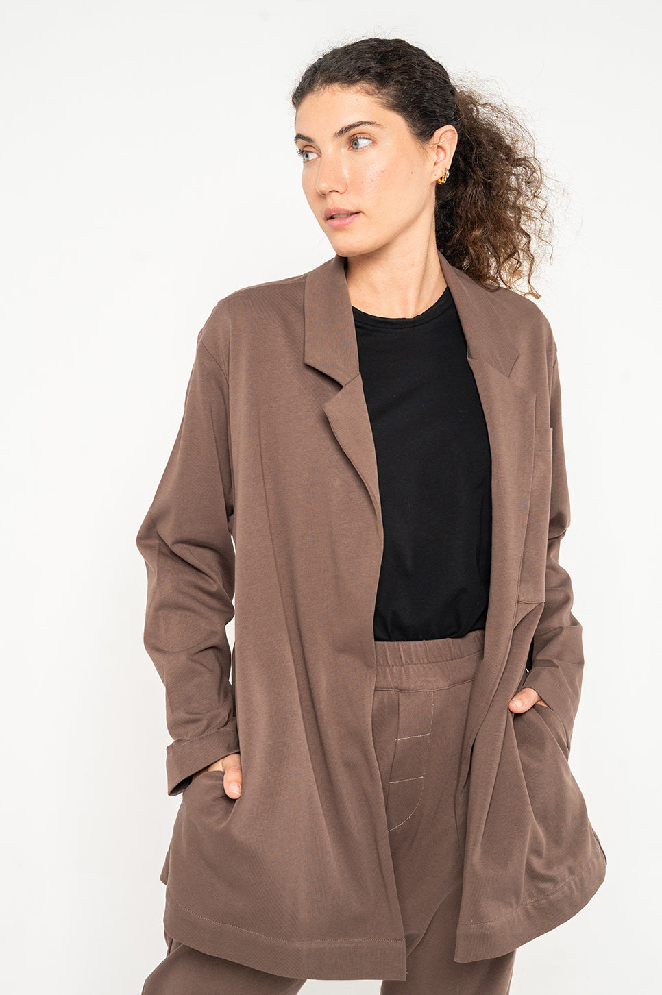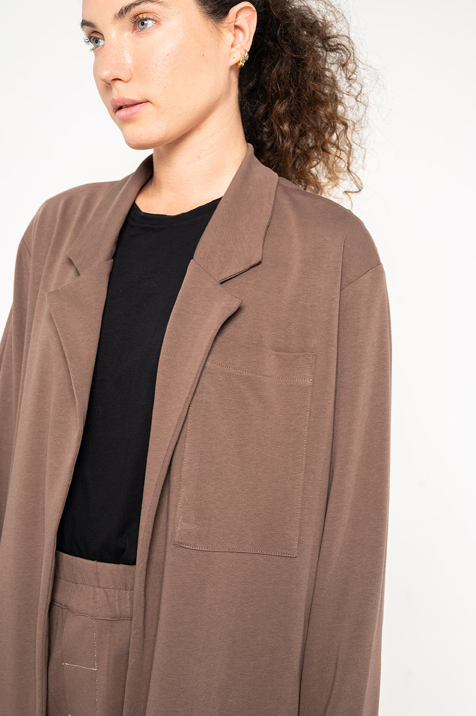 ג'קט קאז'ואל מבד סריג עם צווארון קלאסי בגזרה משוחררת וללא סגירה. עם כיסים בתפרי הצד וכיס חזה חיצוני אחד.- יובל: גובה 170 ס"מ | היקפים: חזה 86 ס"מ | מותן 65 ס"מ | אגן 95 ס"מ, לובשת מידה 0.