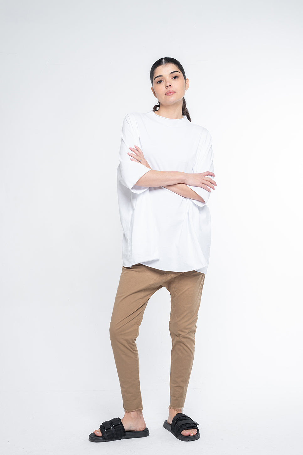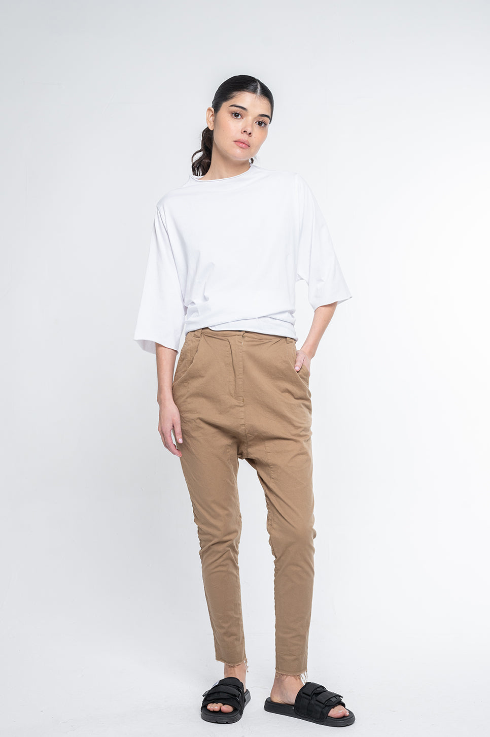 מכנסי אריג בגזרת שק גבוהה, רחבים בירך וצרים בשוק. עם שני כיסי צד ושני כיסי שפה מאחור. עשויים בד אריג כותנה דק עם מעט לייקרה לגמישות.