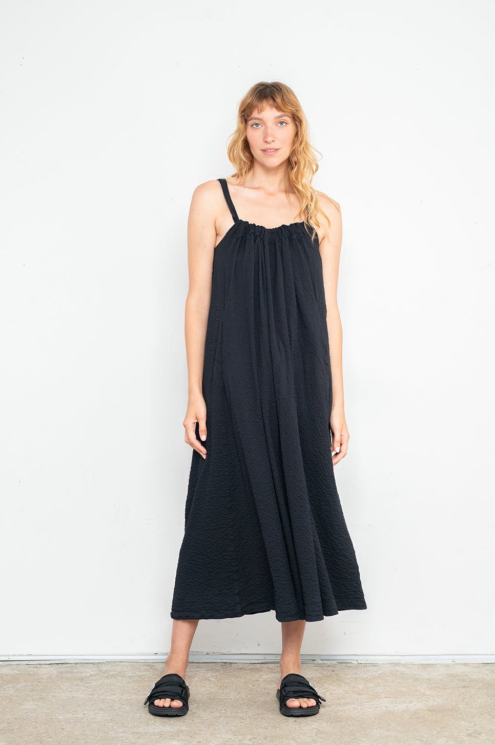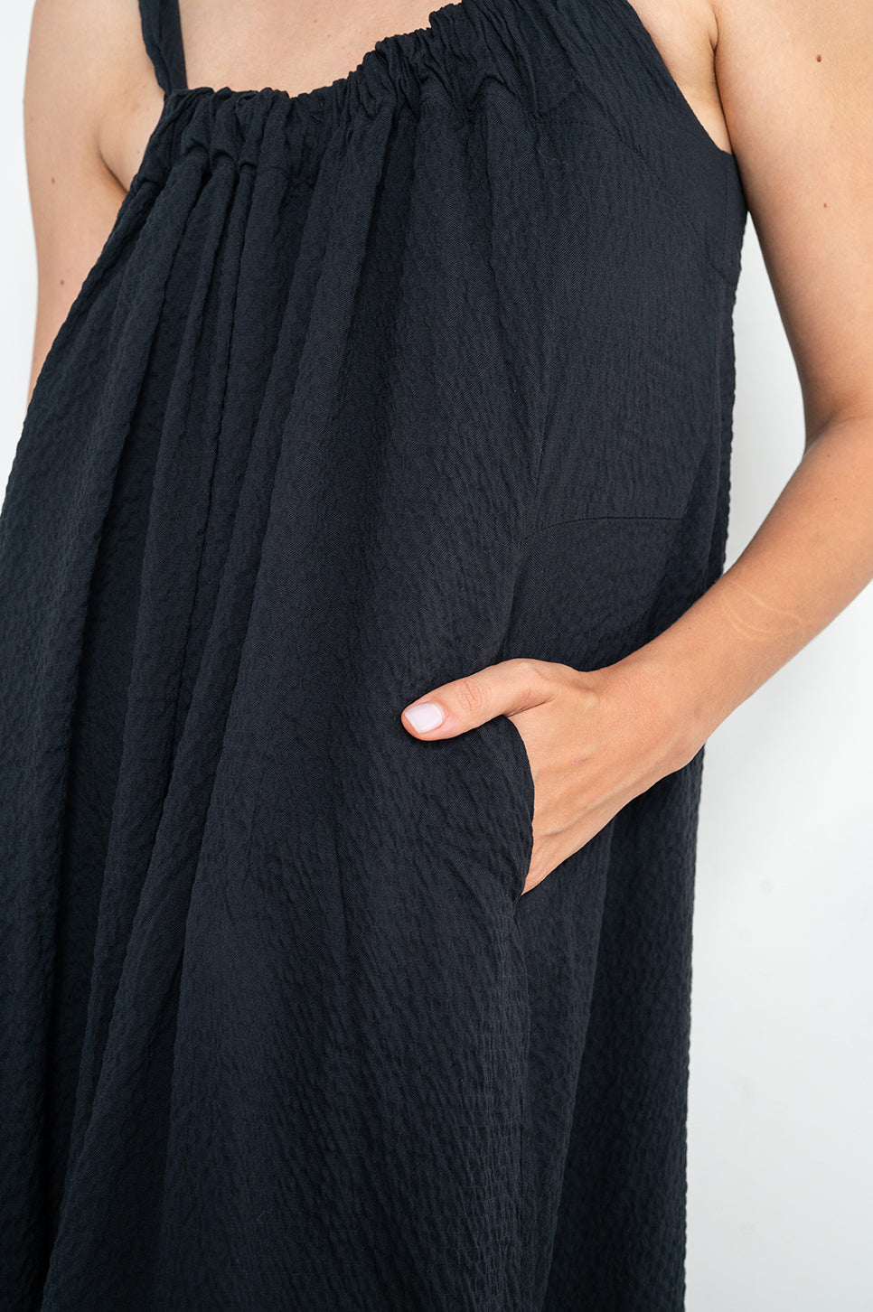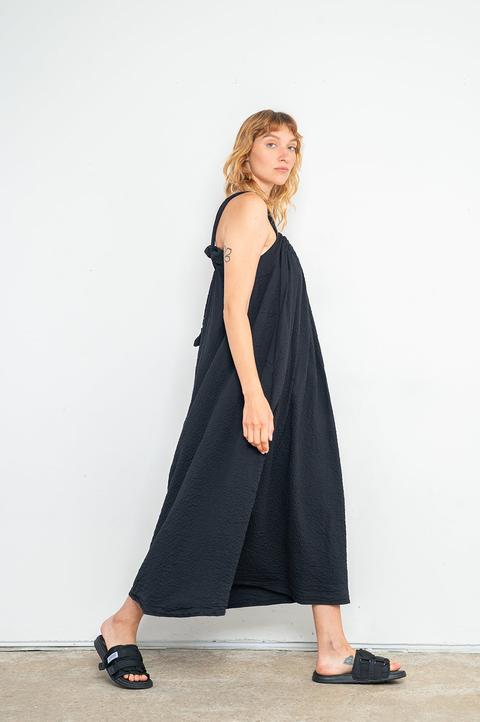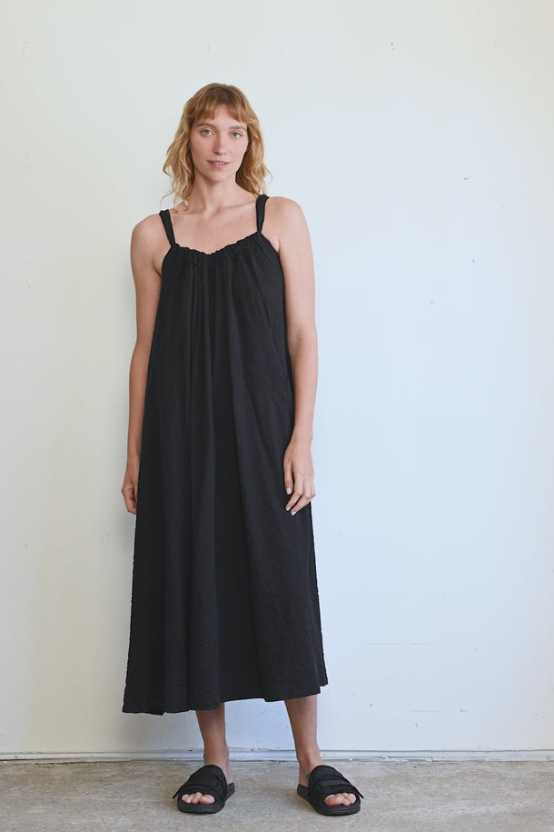 שמלת מקסי רחבה וקלילה, בעלת כתפיות הניתנות לכיוונון אישי וקשירה בגב. עם כיווצים סביב מפתח הצוואר ושני כיסי צד. מגיעה בשני סוגי בדים - בד פשתן מעט מבריק ובד עם טקסטורת קימטוטים עדינה.- אנה: גובה 178 ס"מ. היקפים: חזה 88 ס"מ | מותן 70 ס"מ | אגן 88 ס"מ, לובשת שחור מקומט מידה S/M.