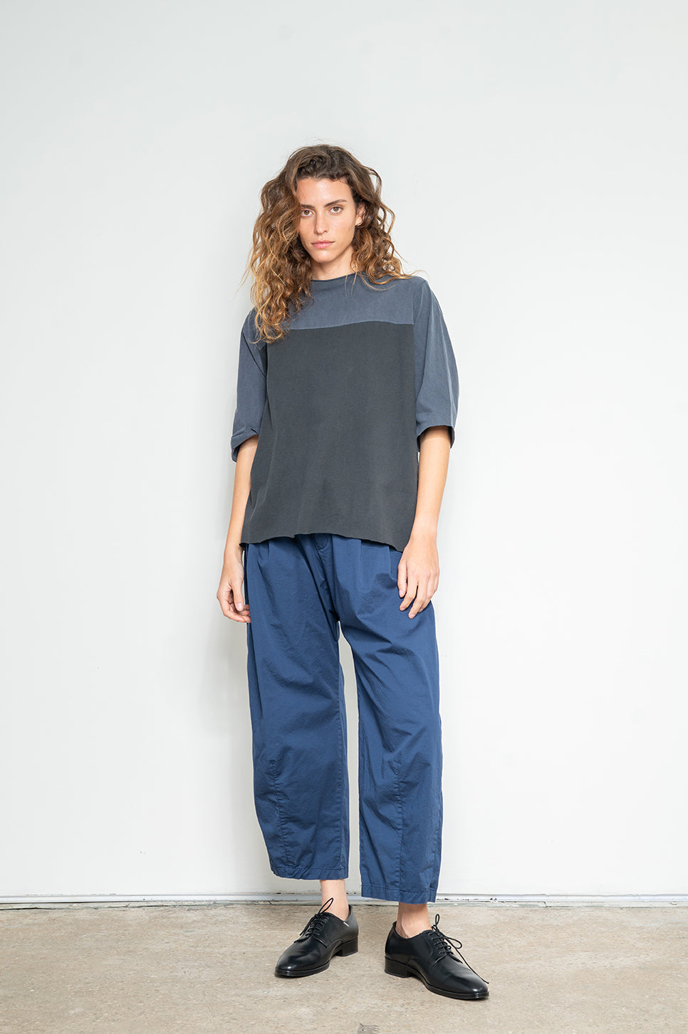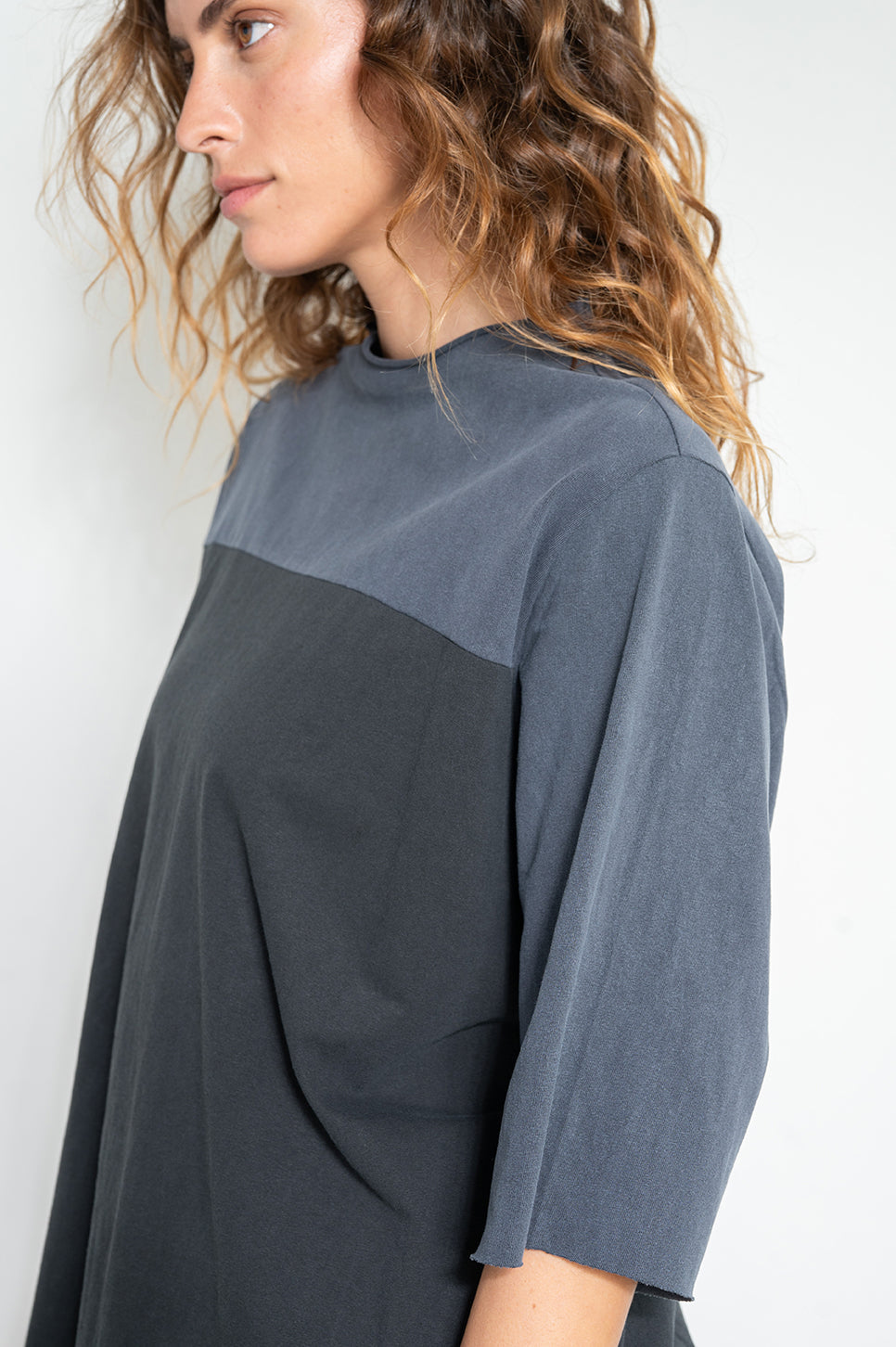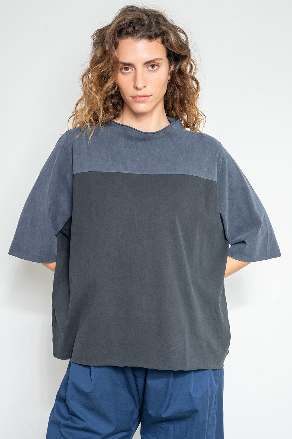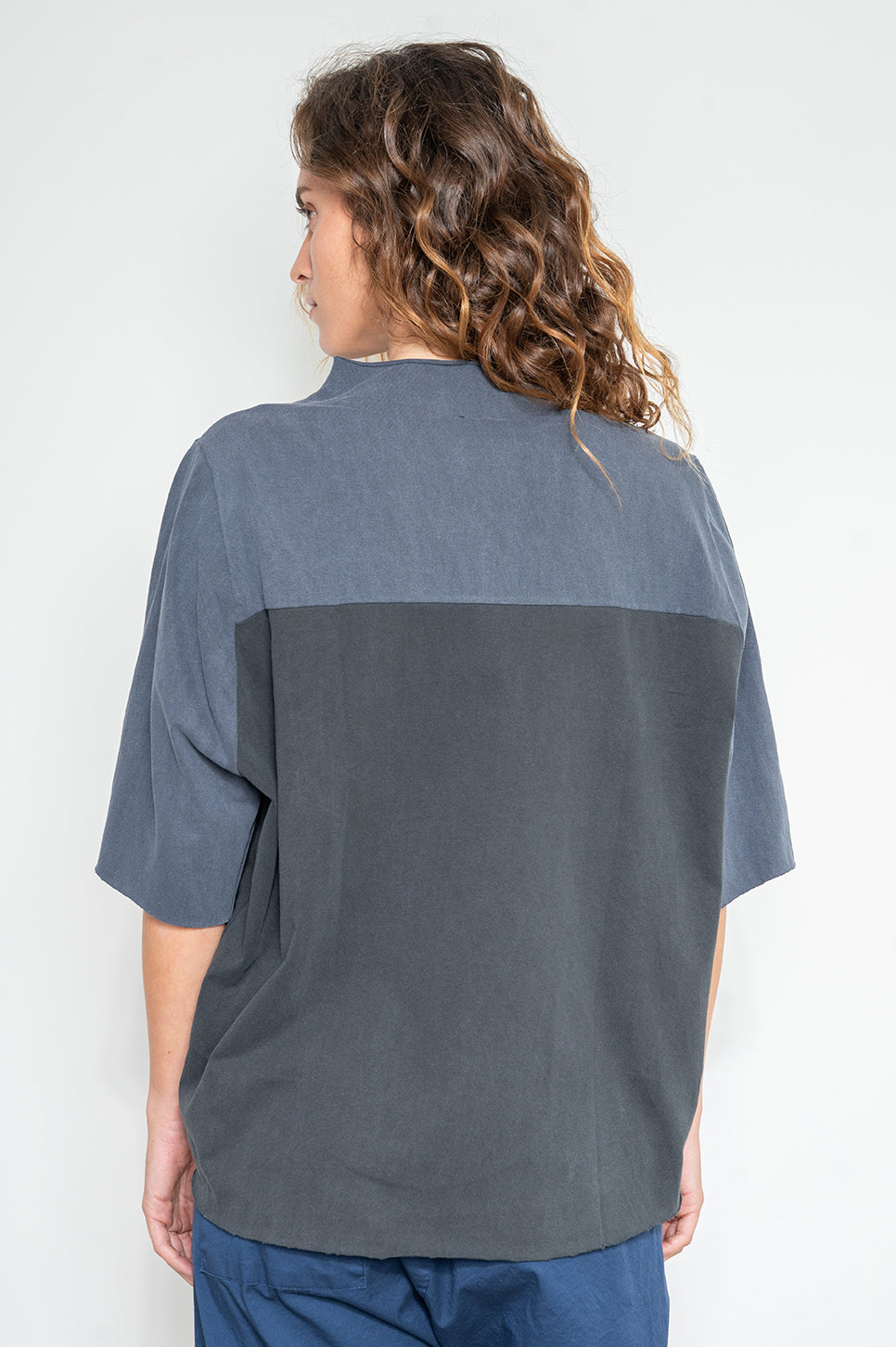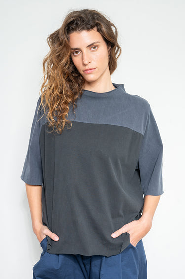 חולצת טישירט אוברסייז בגזרה ישרה עם צווארון גבוה ומתגלגל. בעלת סיומות גוף, ידיים וצוואר גזורות.