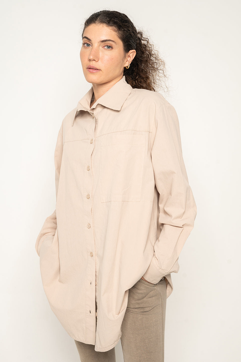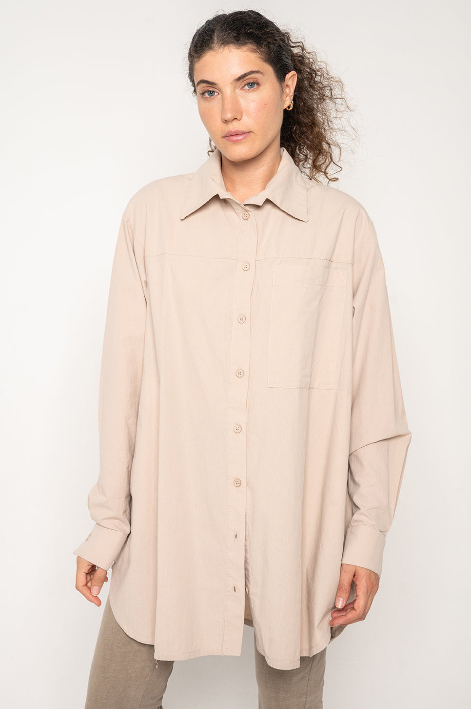 חולצה מכופתרת בגזרת אוברסייז ארוכה, בעלת מראה אלגנטי ונינוח. עם שני כיסי צד וכיס חזה אחד, סגירת כפתורים בחזית ובשרוולים. עשויה בד אריג כותנה דק ואוורירי.- יובל: גובה 170 ס"מ | היקפים: חזה 86 ס"מ | מותן 65 ס"מ | אגן 95 ס"מ, לובשת מידה S/M.