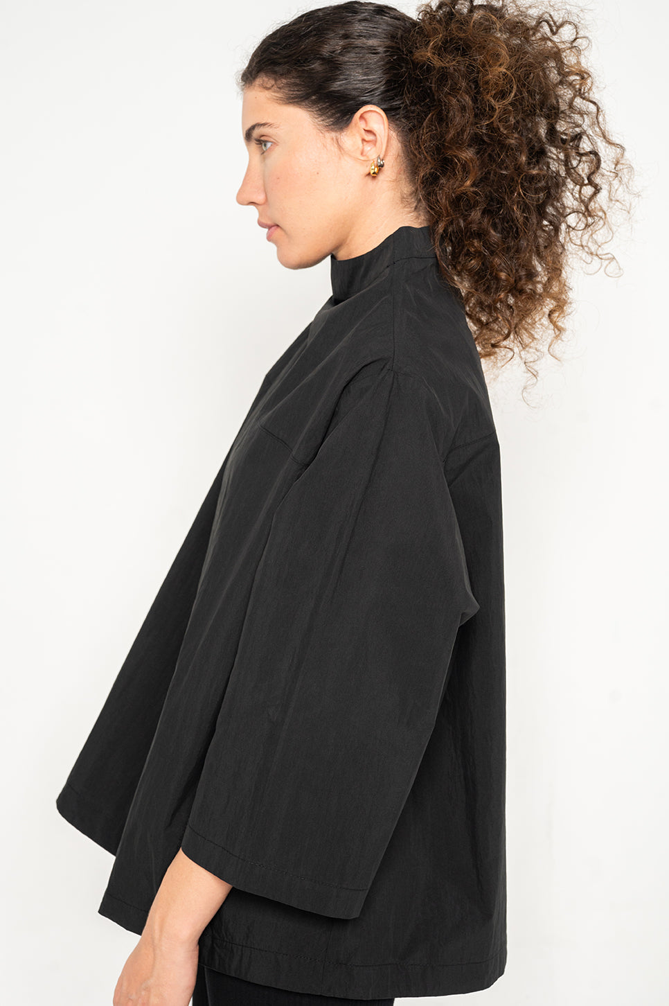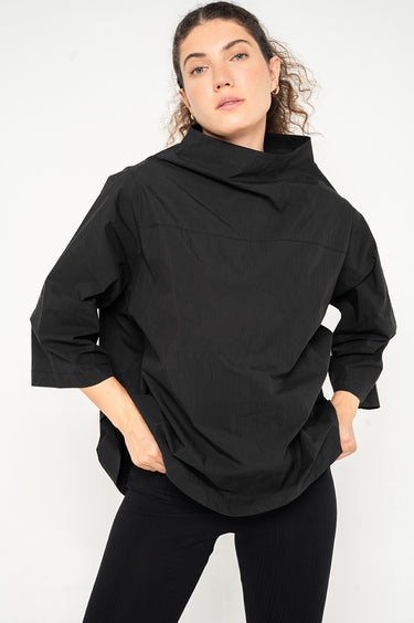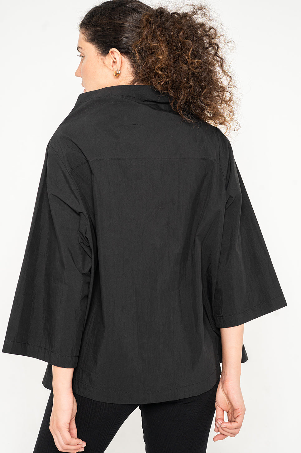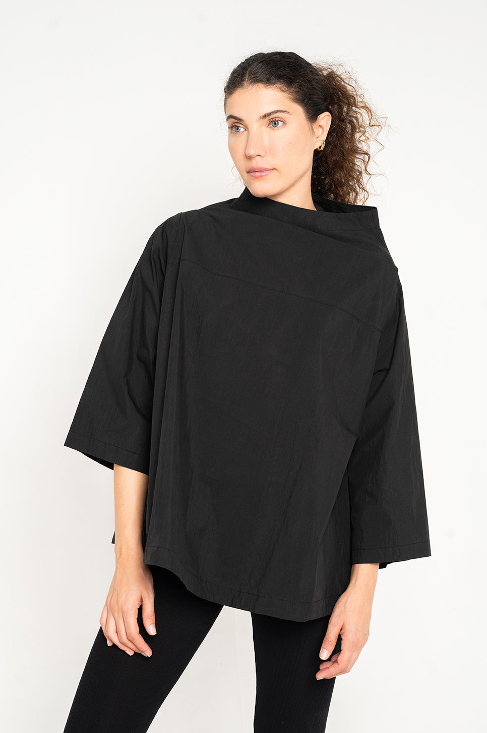 חולצת אריג דקה בגזרת אוברסייז ישרה, עם צווארון גבוה ושרוולי 3/4.- יובל: גובה 170 ס"מ | היקפים: חזה 86 ס"מ | מותן 65 ס"מ | אגן 95 ס"מ.