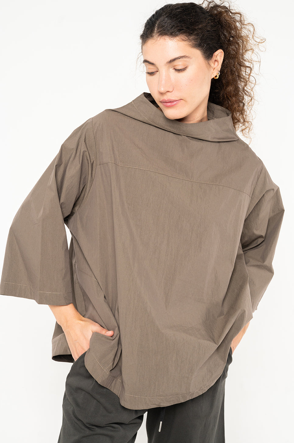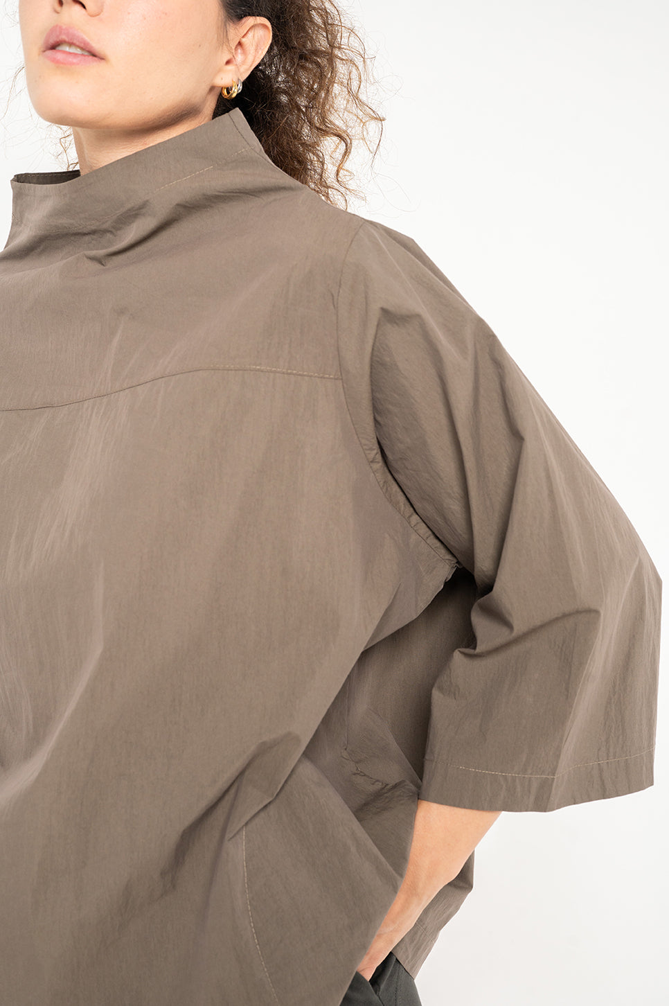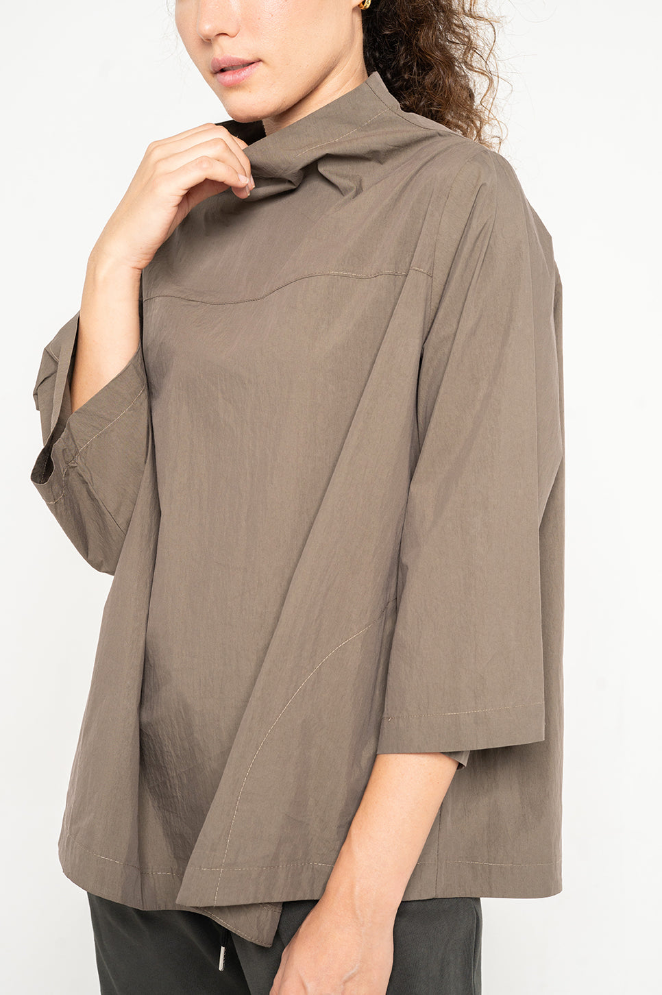 חולצת אריג דקה בגזרת אוברסייז ישרה, עם צווארון גבוה ושרוולי 3/4.