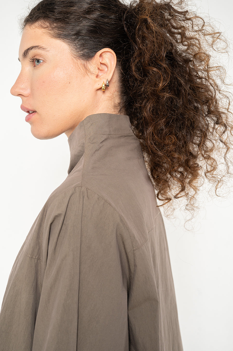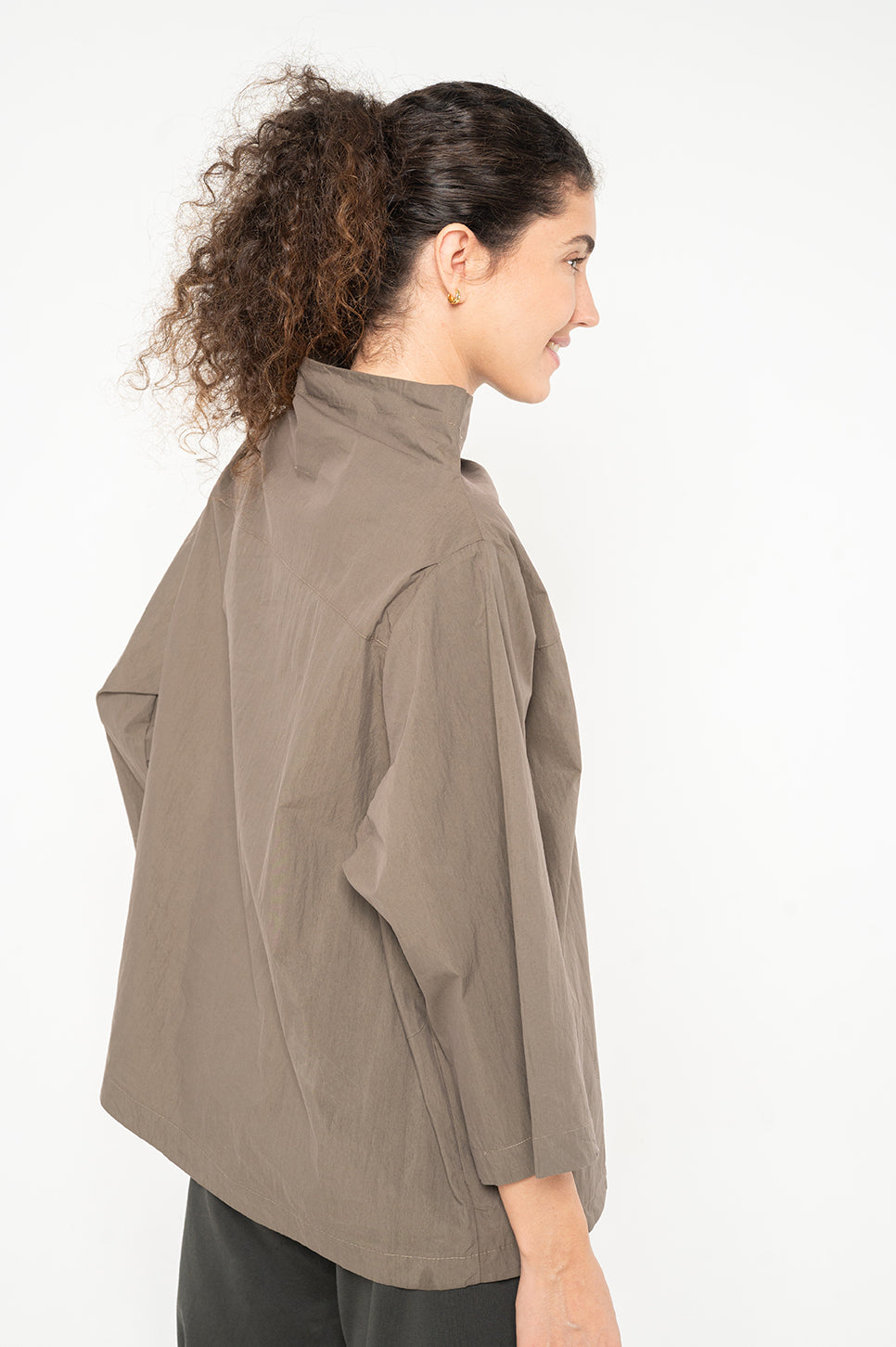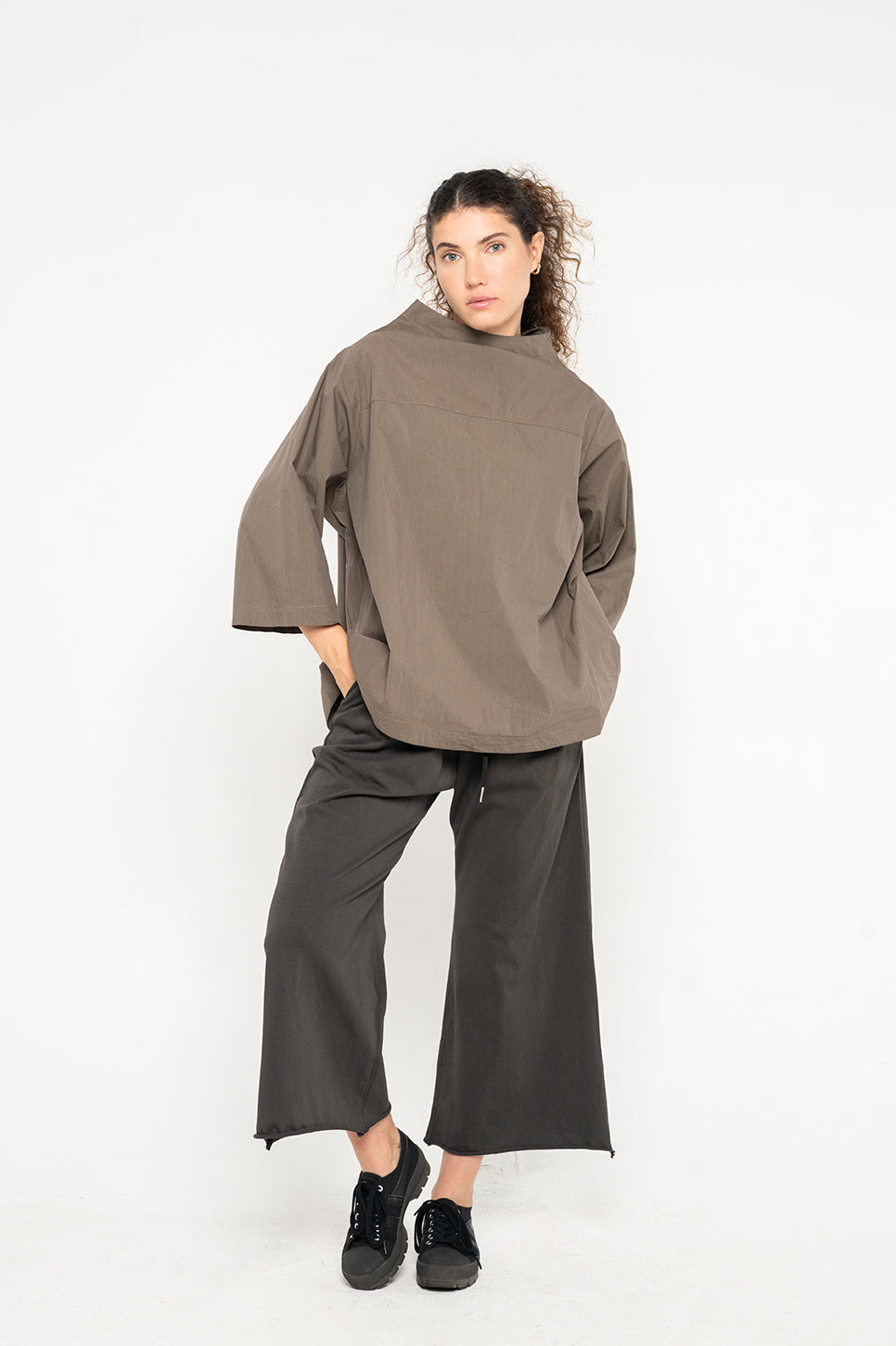 חולצת אריג דקה בגזרת אוברסייז ישרה, עם צווארון גבוה ושרוולי 3/4.